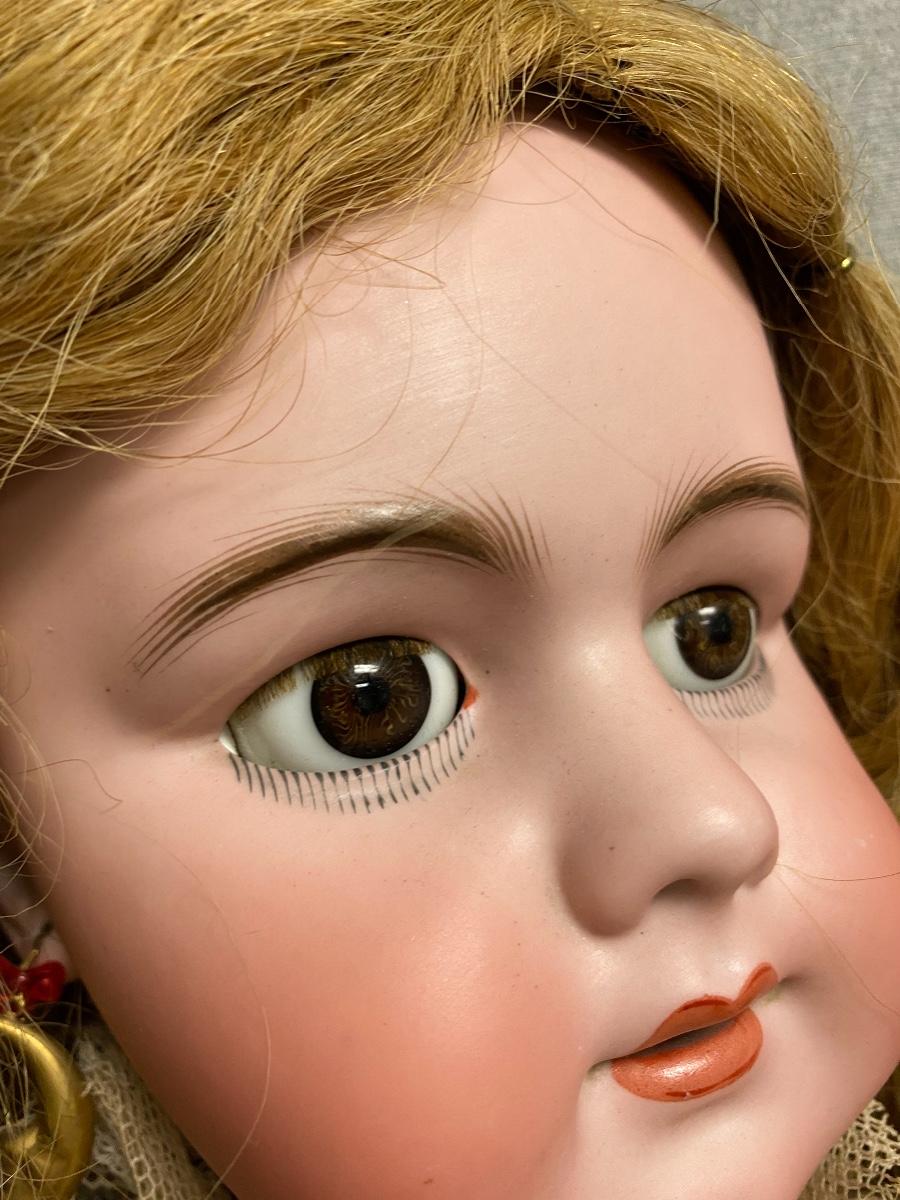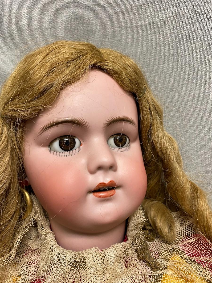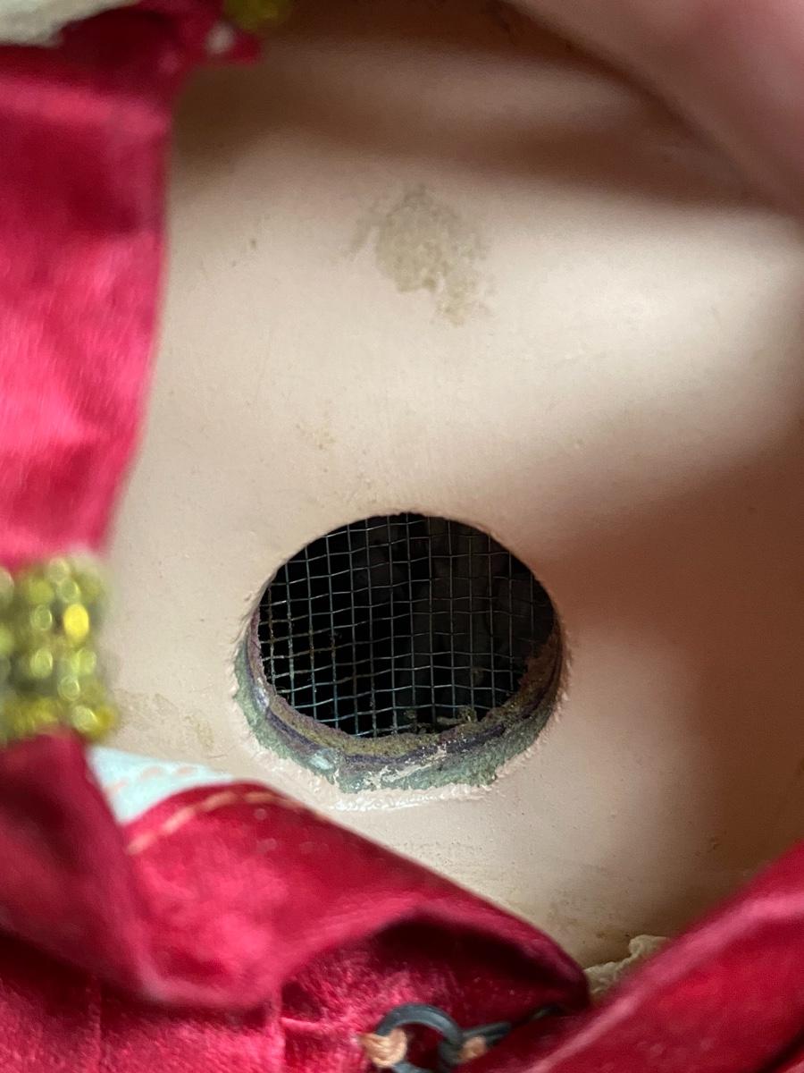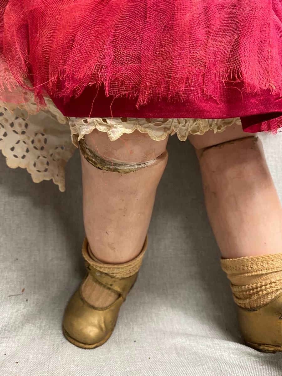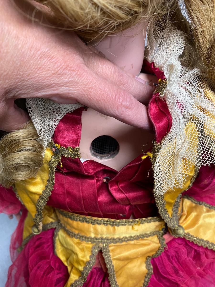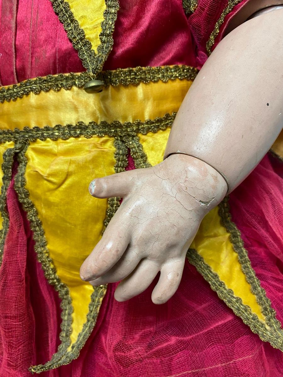 32" bisque and composite Bebe Jumeau doll, SFBJ era. Head is marked DEP 14 with Tete Jumeau stamped in red. Kind of chunky looking. Wearing a red and yellow jester harlequin outfit. Some light wear from age to composite. I actually found this doll on a blog spot from Dolls from the Attic (http://dollsfromtheattic.blogspot.com/2010/10/when-witches-go-riding.html) Previous owner purchased this doll from Carmel Doll Shop. Body has a hole in back.
