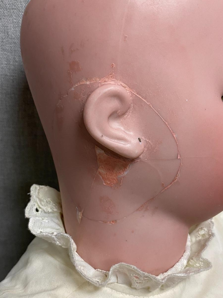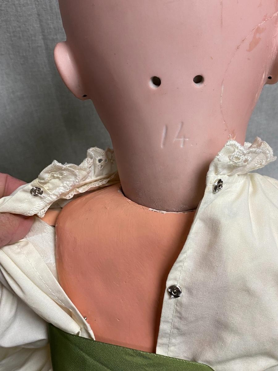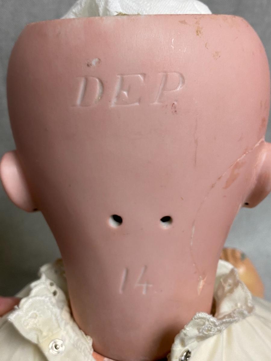 Antique bisque and composite 32" doll. Marked DEP 14 on back of head. Open mouth, dimple chin. Unfortunately she has been damaged and repaired on the right side of her head. Looks like the ear was knocked out completely and glued back into place. With the right wig it wouldn't be too noticeable. Body looks repainted.