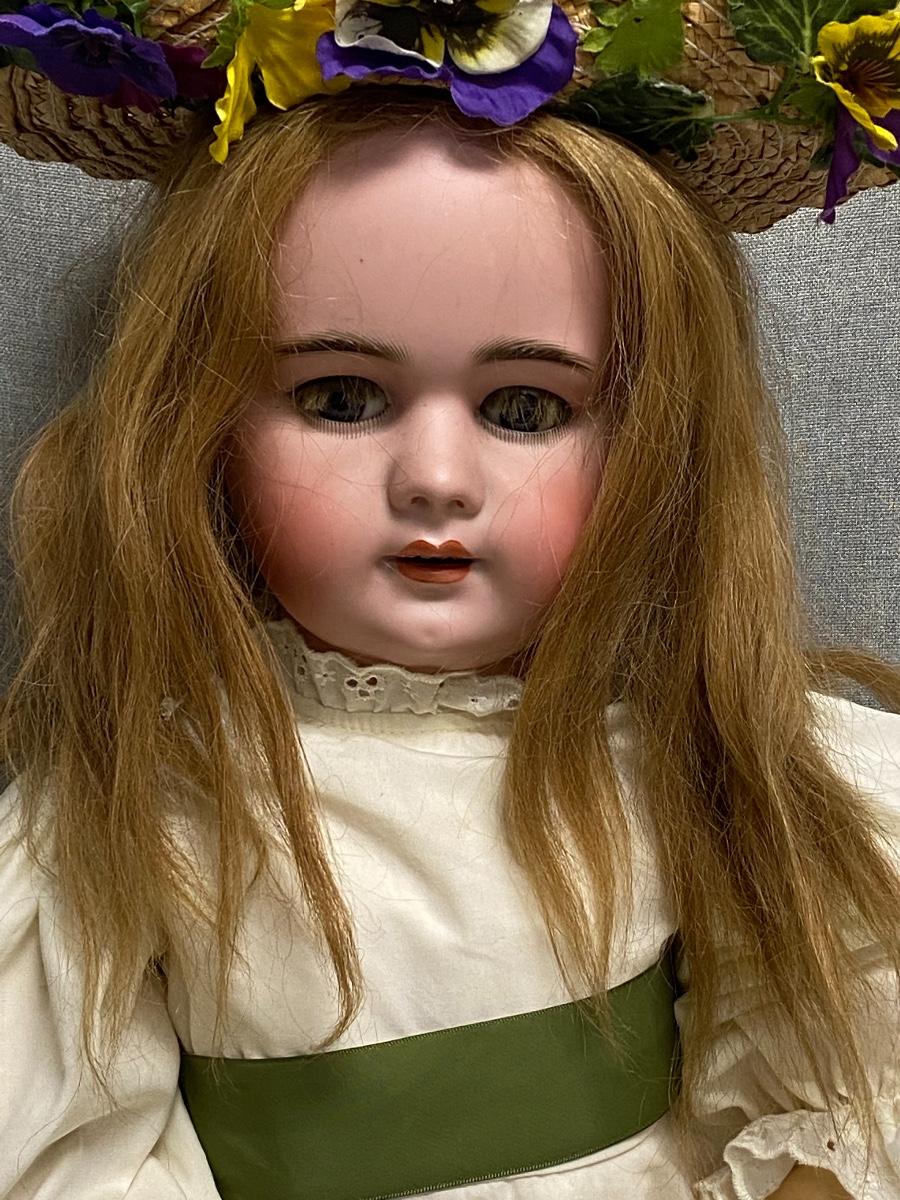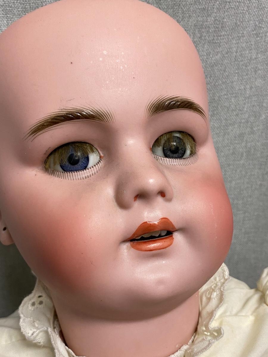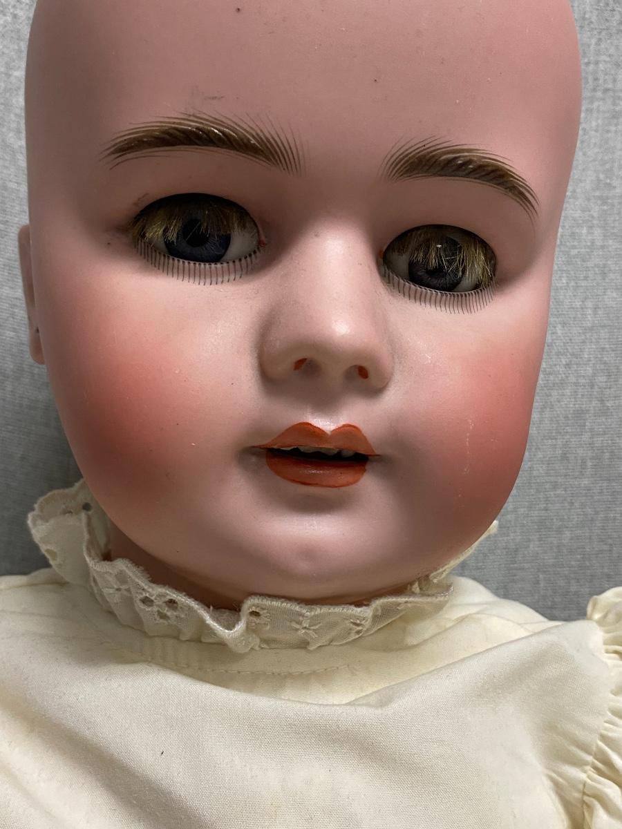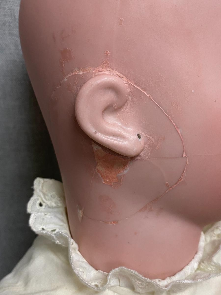 Antique bisque and composite 32" doll. Marked DEP 14 on back of head. Open mouth, dimple chin. Unfortunately she has been damaged and repaired on the right side of her head. Looks like the ear was knocked out completely and glued back into place. With the right wig it wouldn't be too noticeable. Body looks repainted.