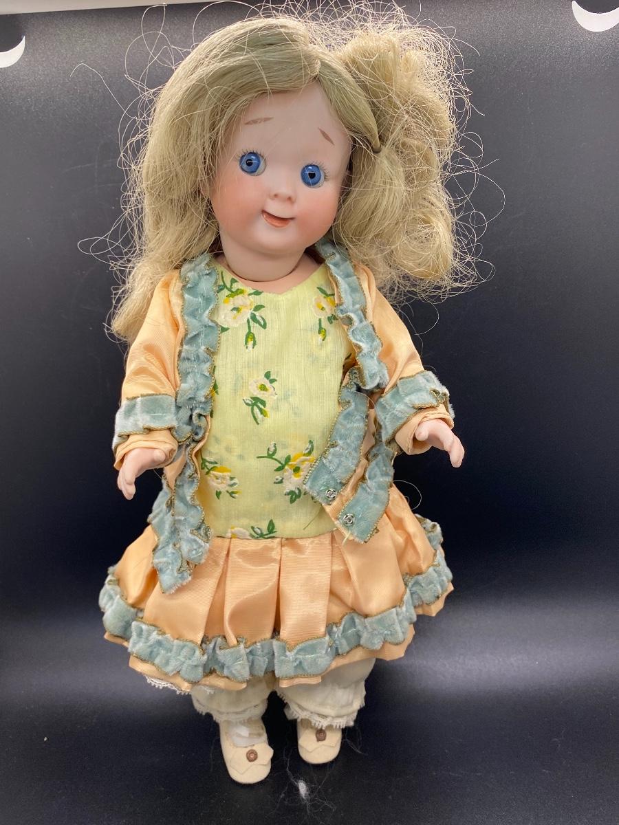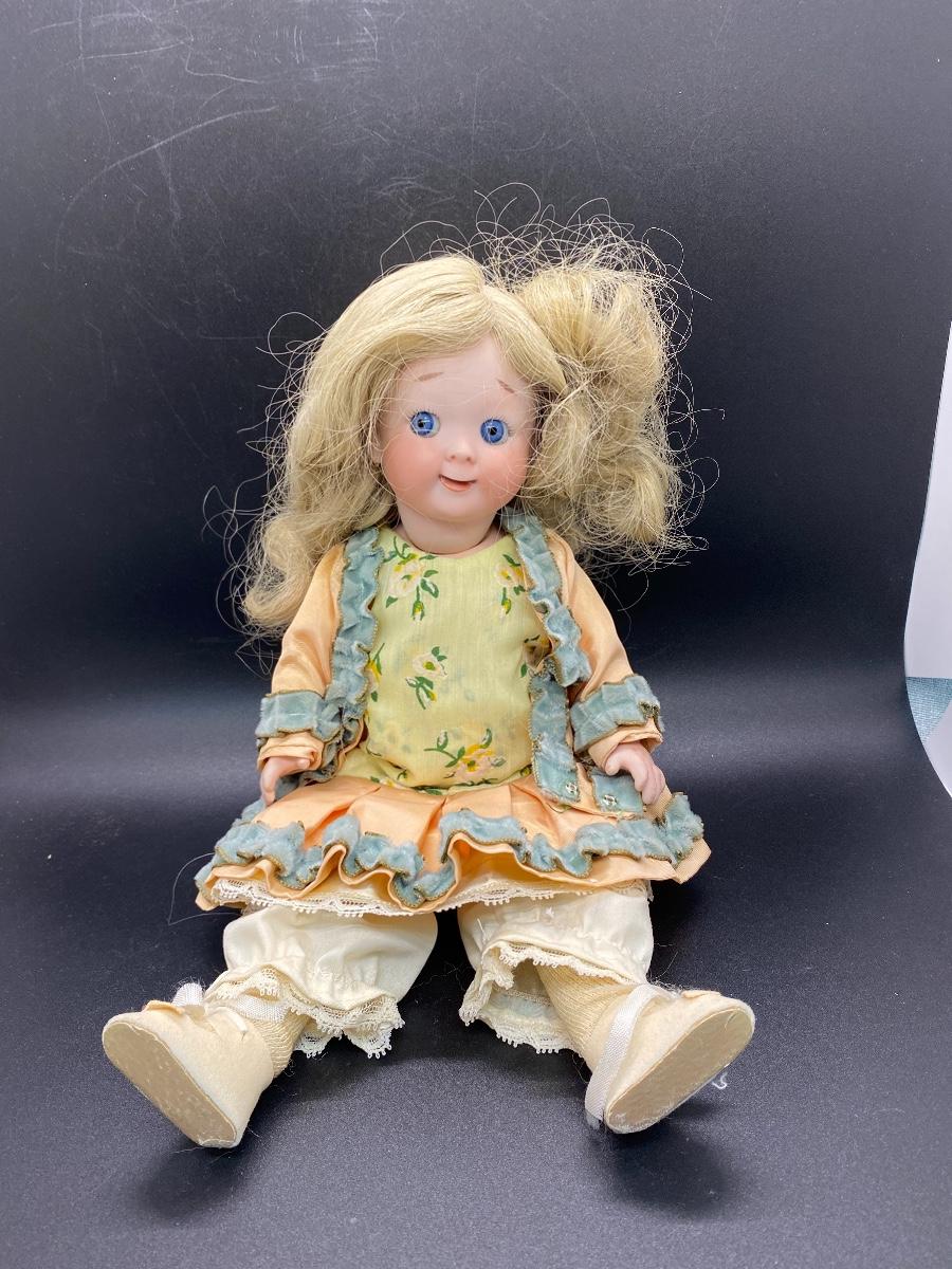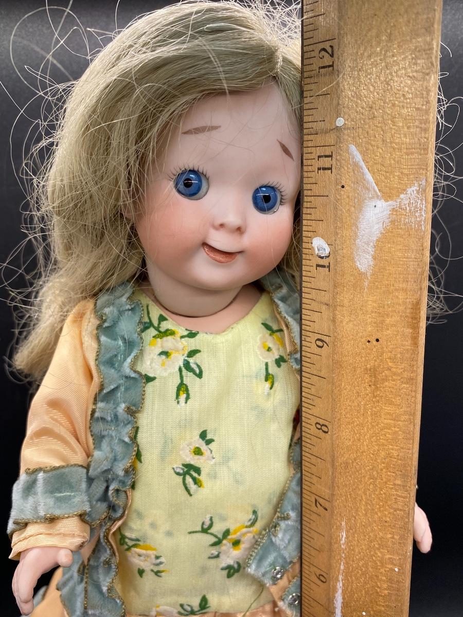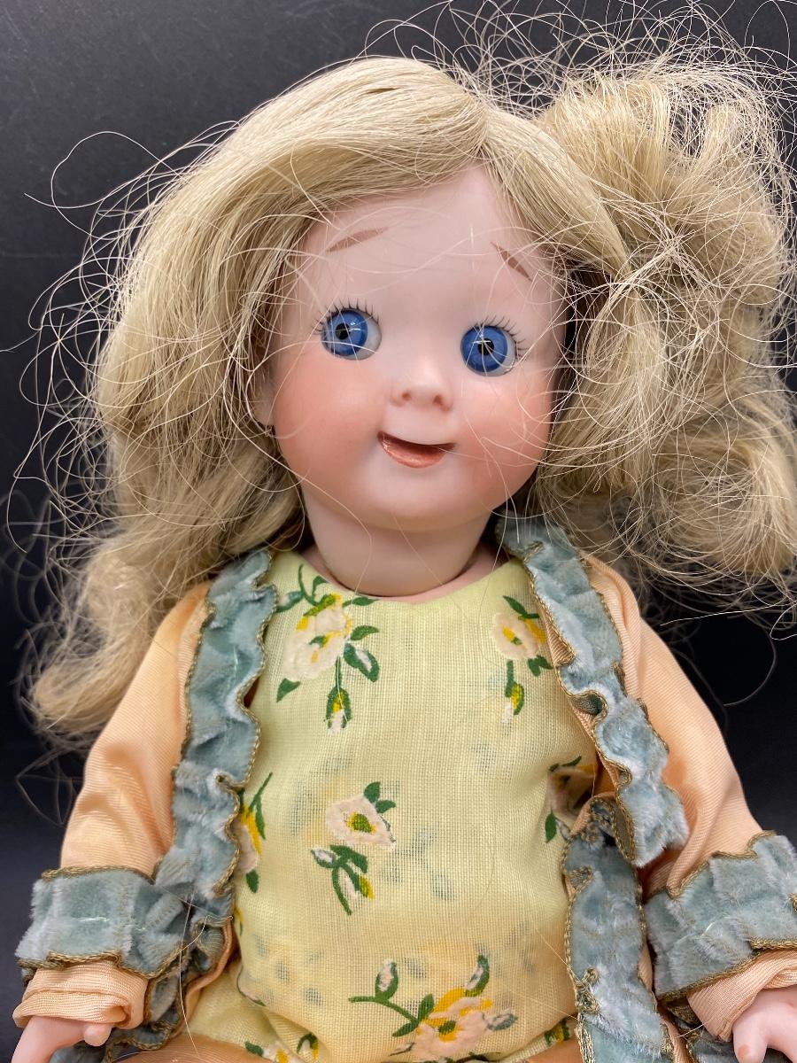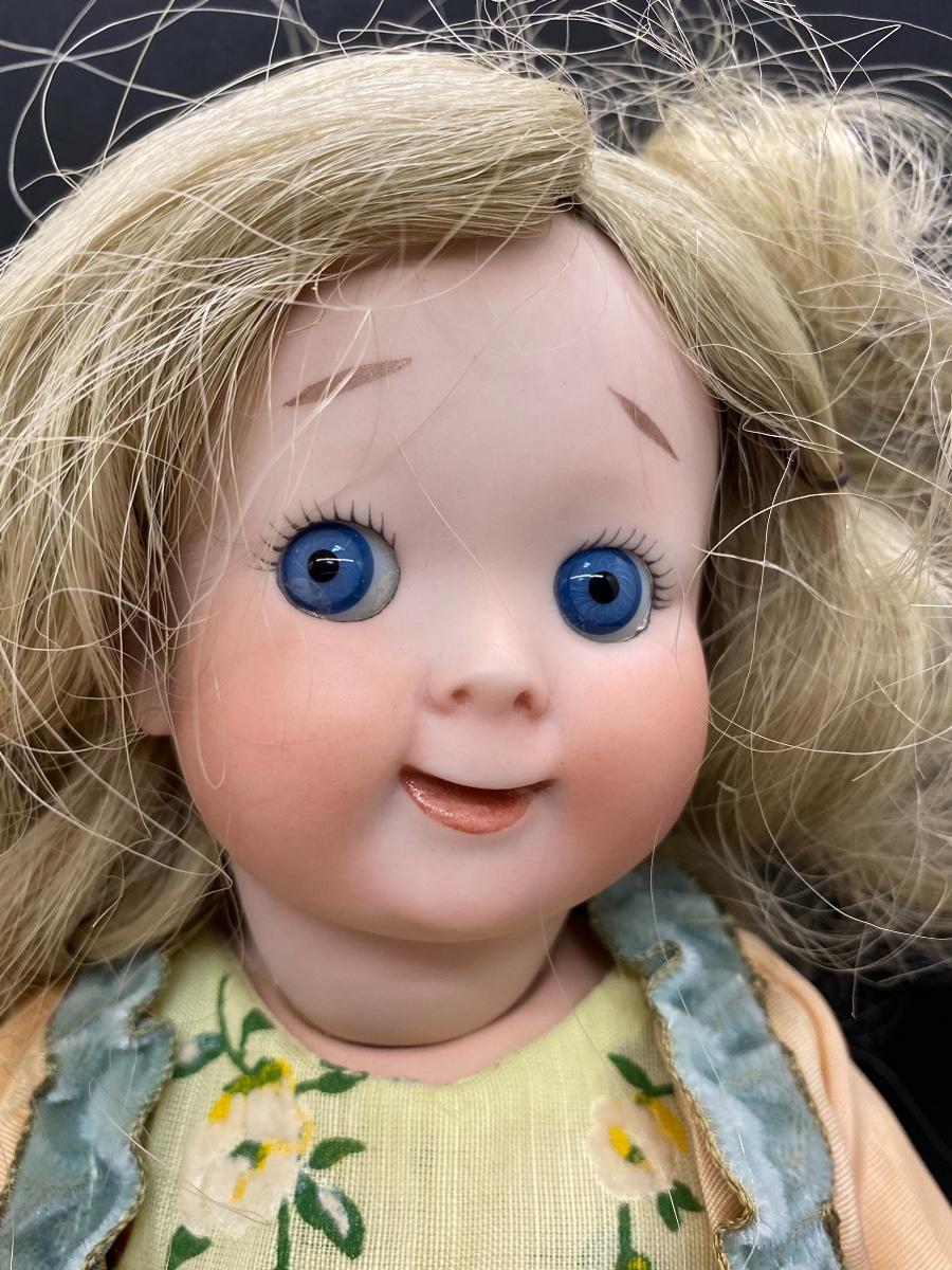 Cute reproduction googly eye doll. Bright blue fixed eyes with watermelon smile. Signed J. Cuthbert 1977 on back of head. About 12" size. Good condition.