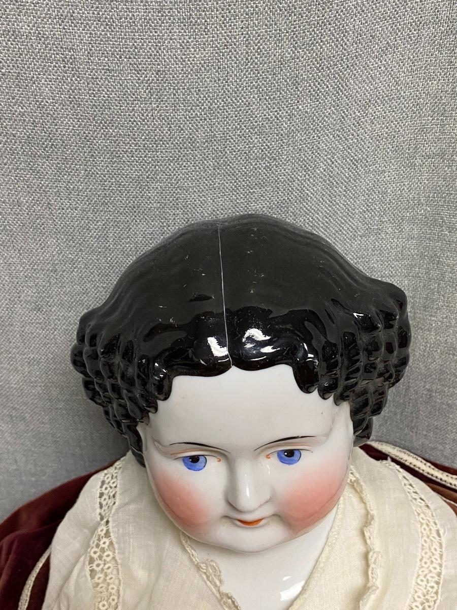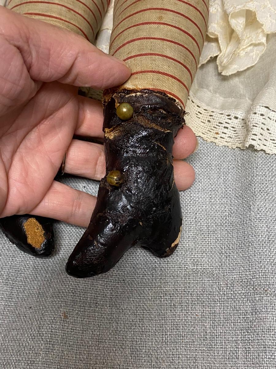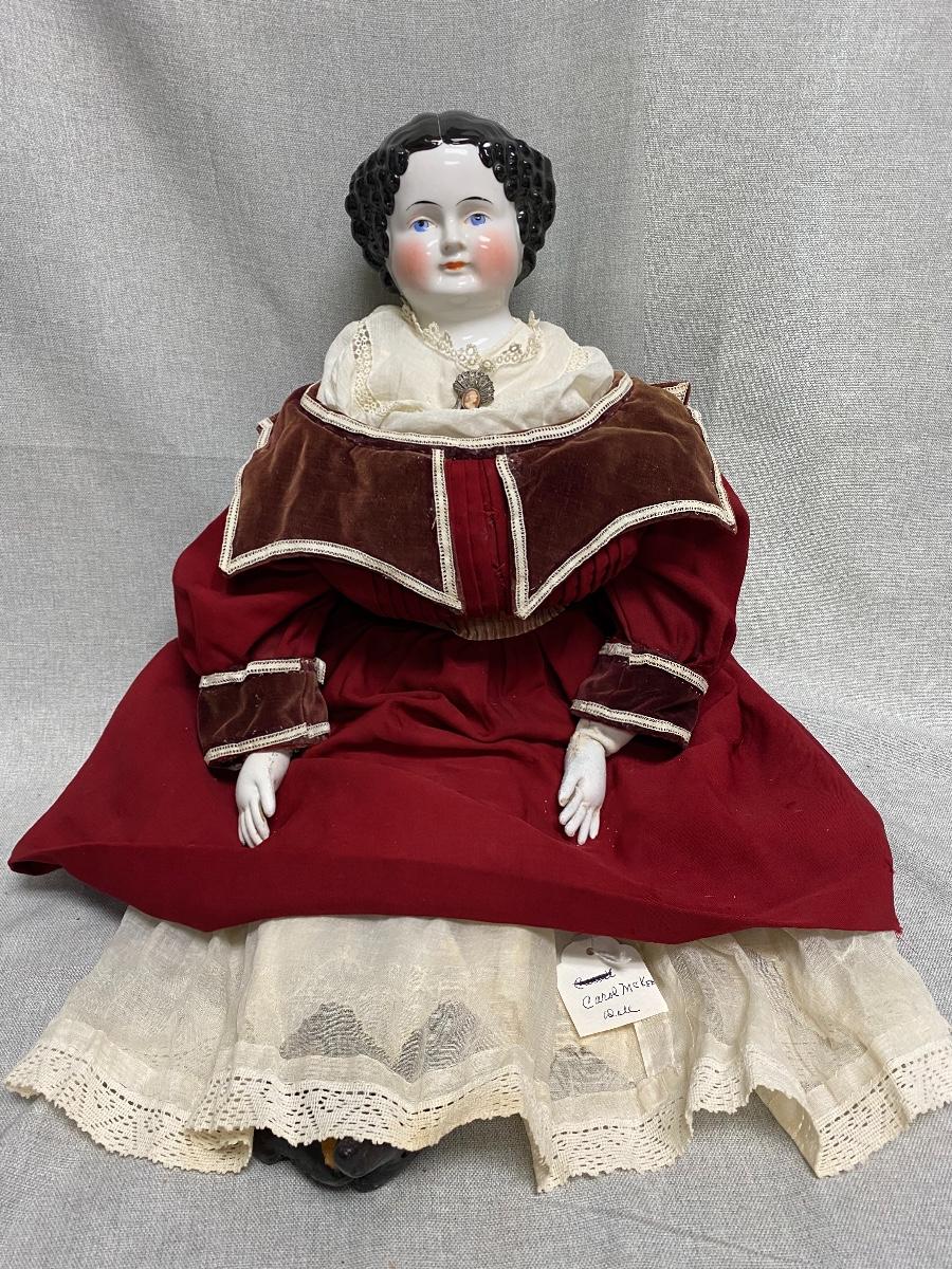 Antique 27" china head doll. Flat top high brow. Leather arms and legs, soft body. Limbs have wear and signs of age. There is a hang tag attached saying it is a Carol McKee Doll 27" China 2005 $850. Some light wear to paint on head, mainly on the back. Displays nicely.