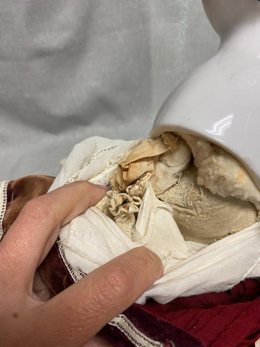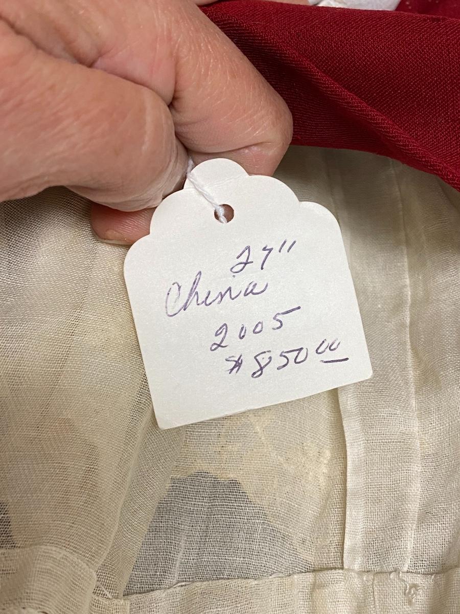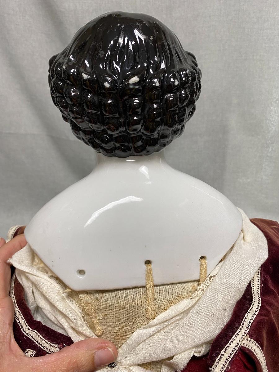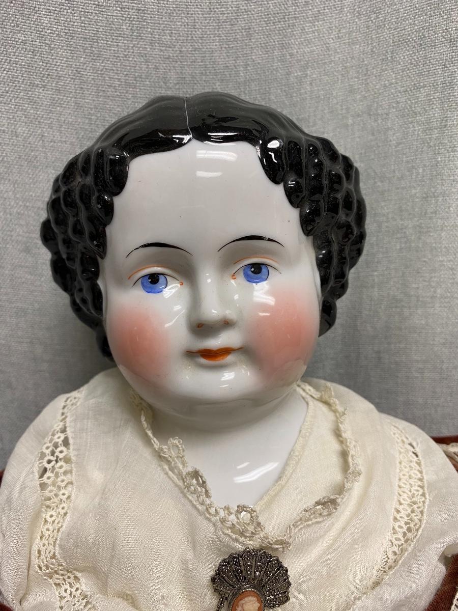 Antique 27" china head doll. Flat top high brow. Leather arms and legs, soft body. Limbs have wear and signs of age. There is a hang tag attached saying it is a Carol McKee Doll 27" China 2005 $850. Some light wear to paint on head, mainly on the back. Displays nicely.