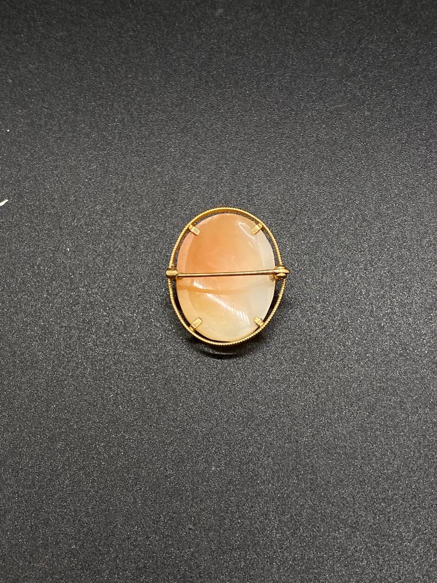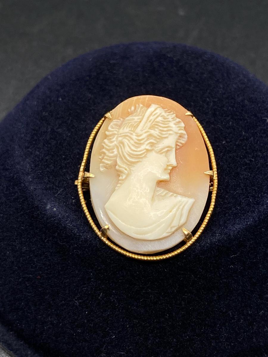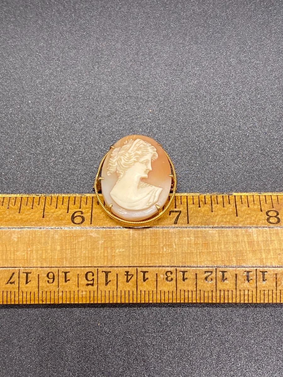 Antique cameo brooch in 10k yellow gold setting. About 1" size. In good condition.