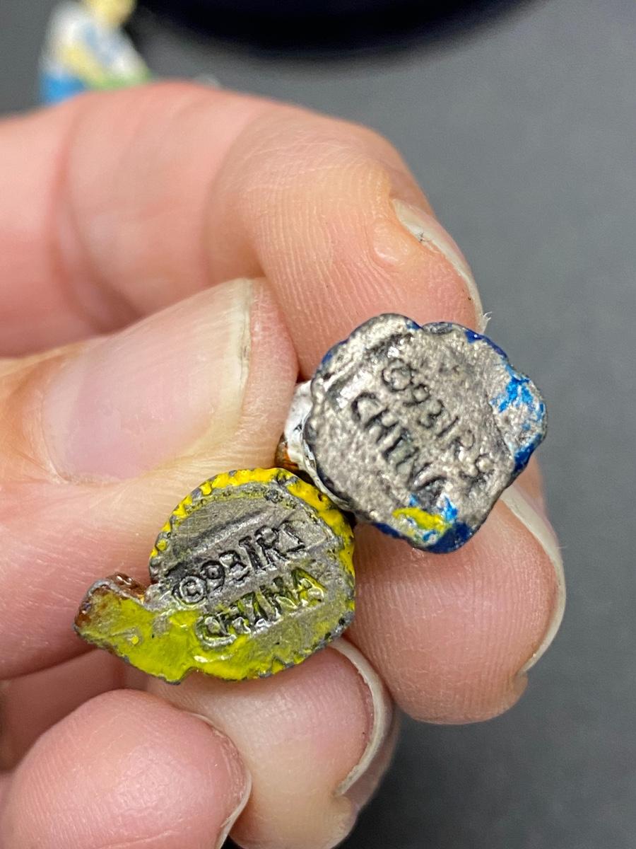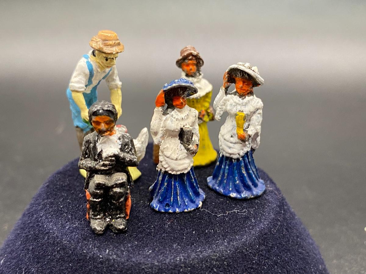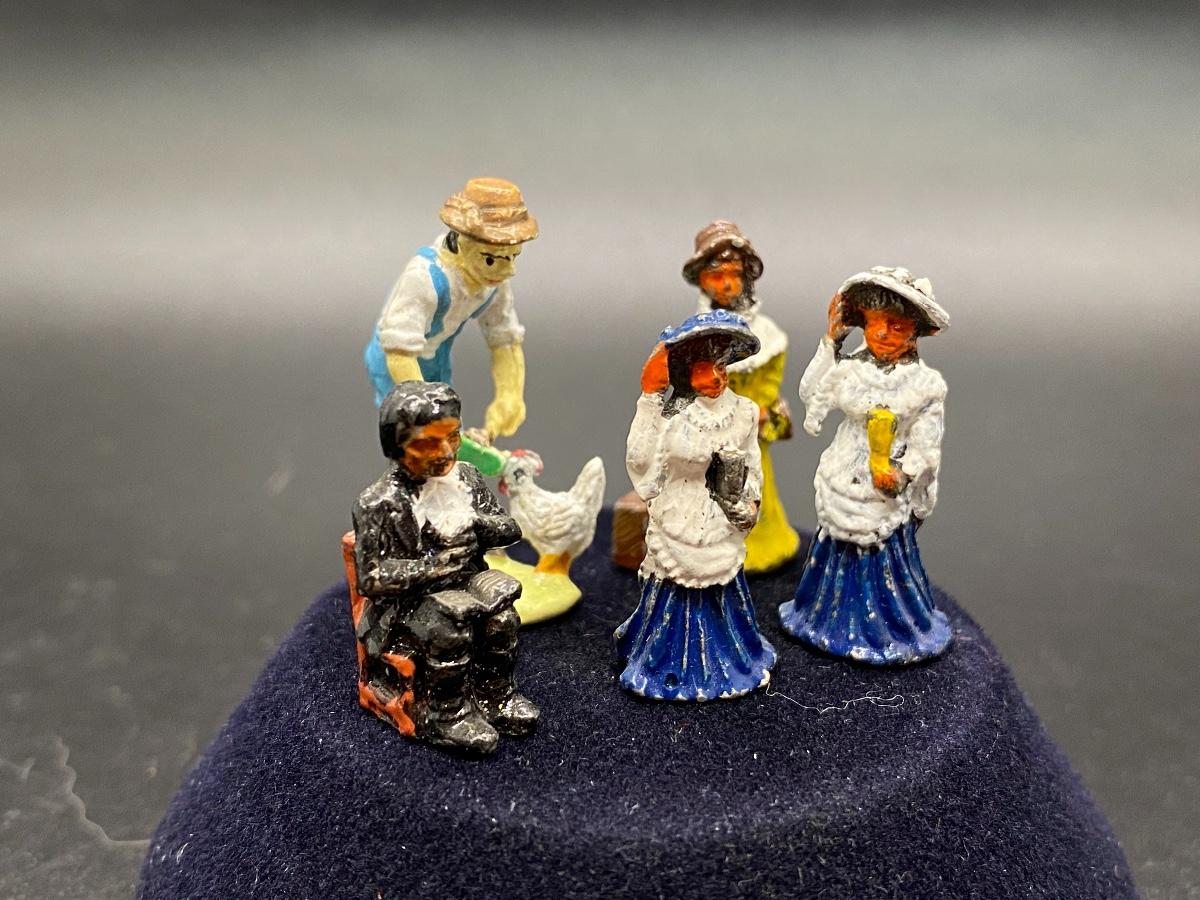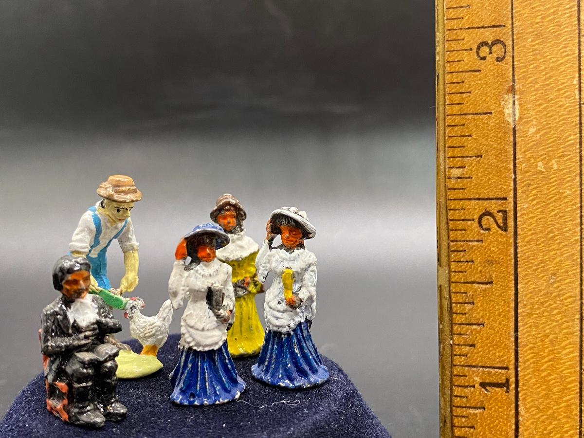 Vintage Painted Cast Metal People. Set of 5. Two ladies are similar. About 1" size. Marked on the bottom.