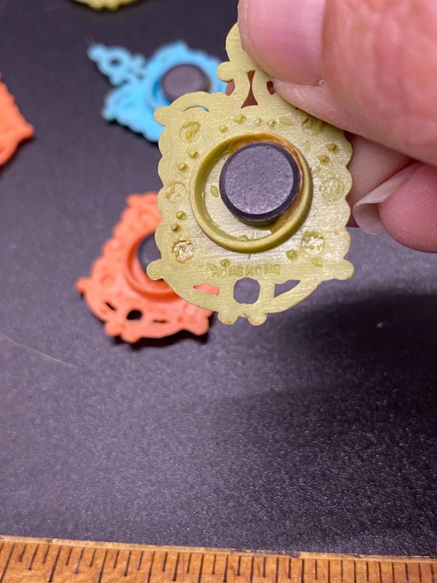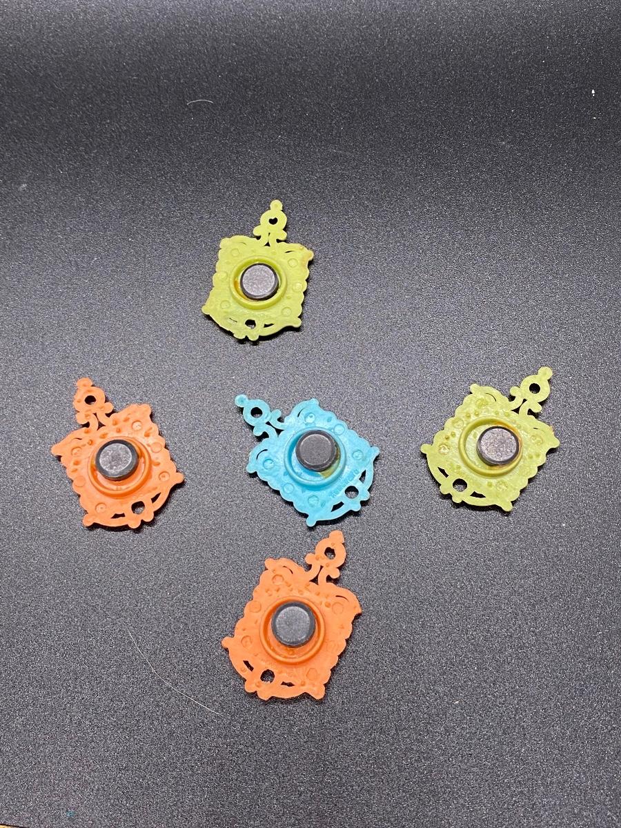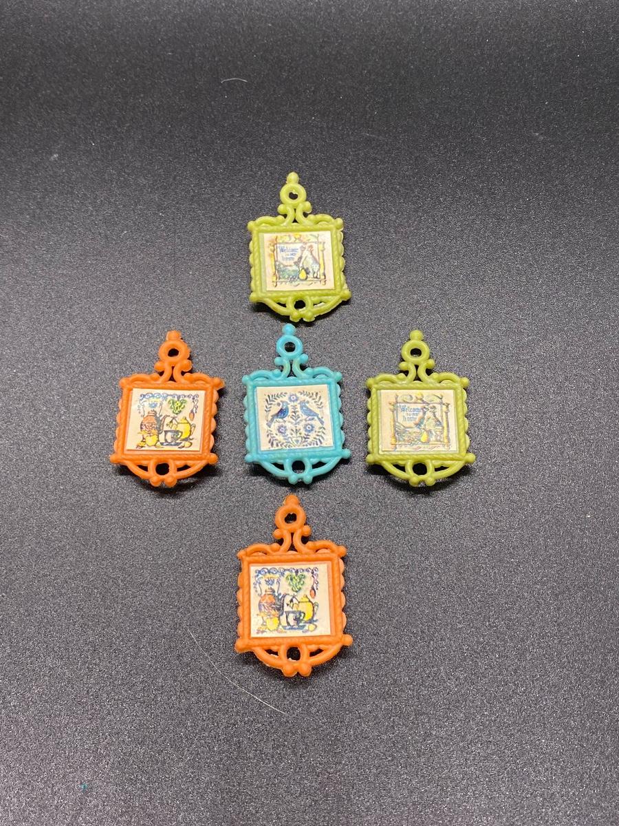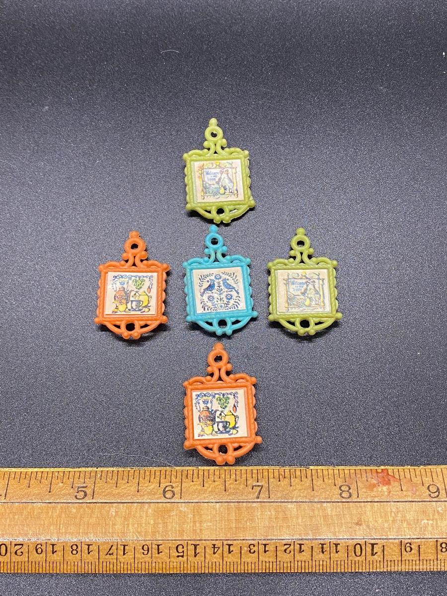 Set of 5 miniature plastic trivet magnets. Made in Hong Kong.