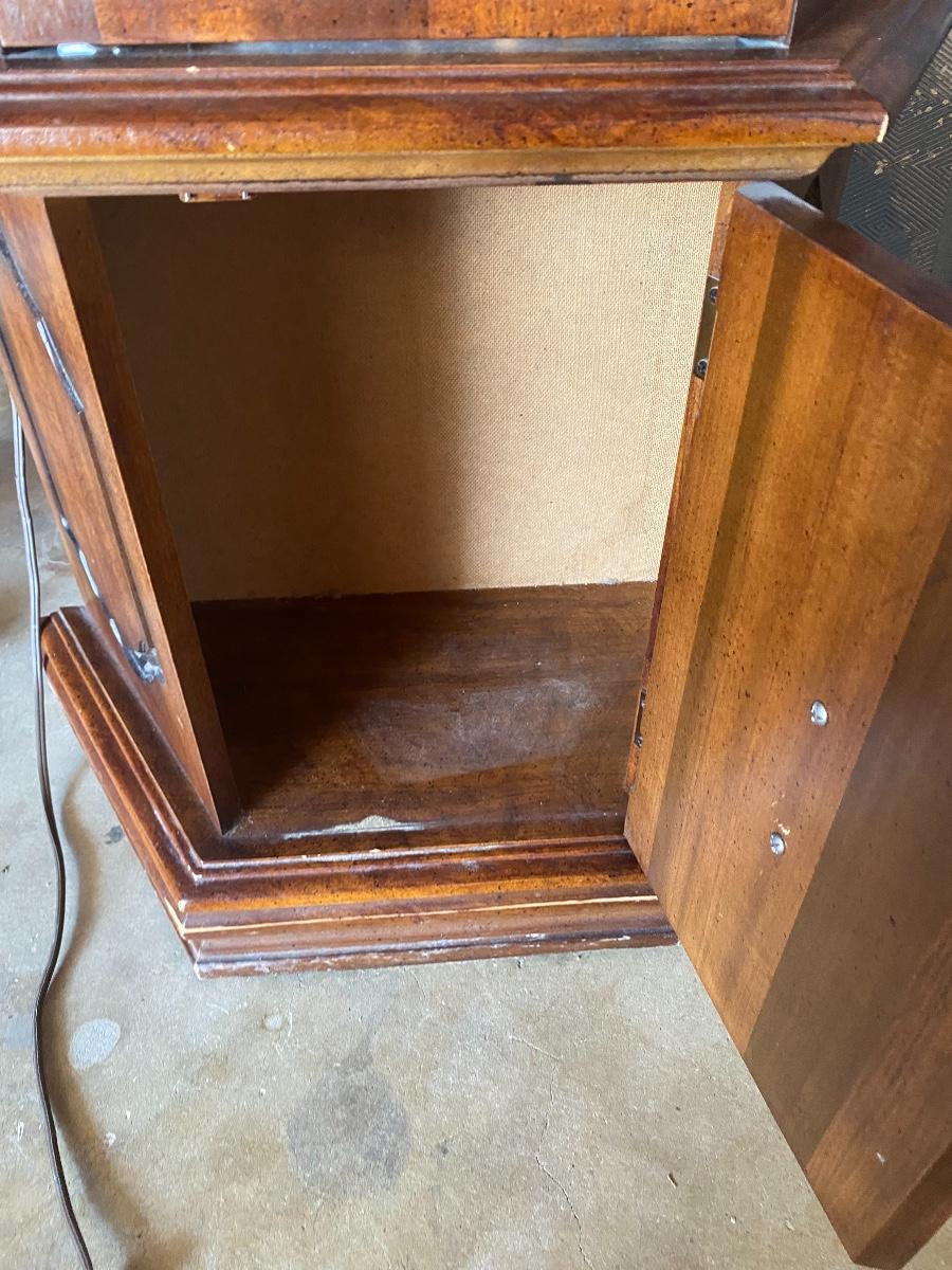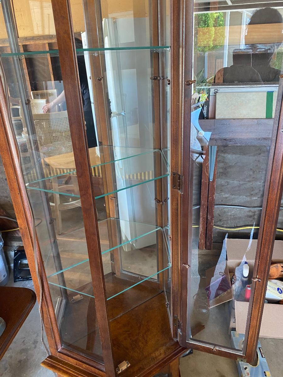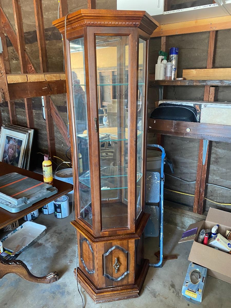 Mirrored Back Glass & Wood Curio Cabinet. About 6' tall. Lighted. Has a small cabinet at the bottom.