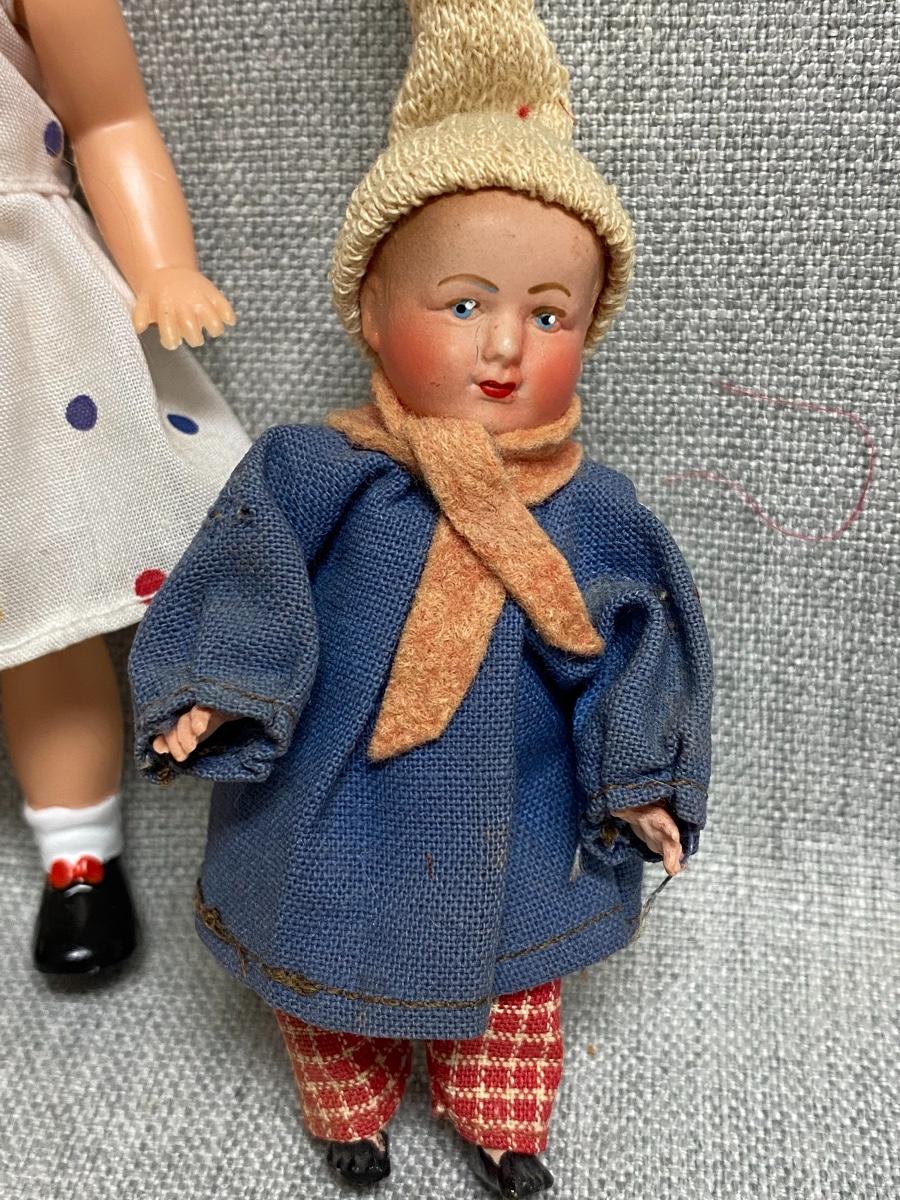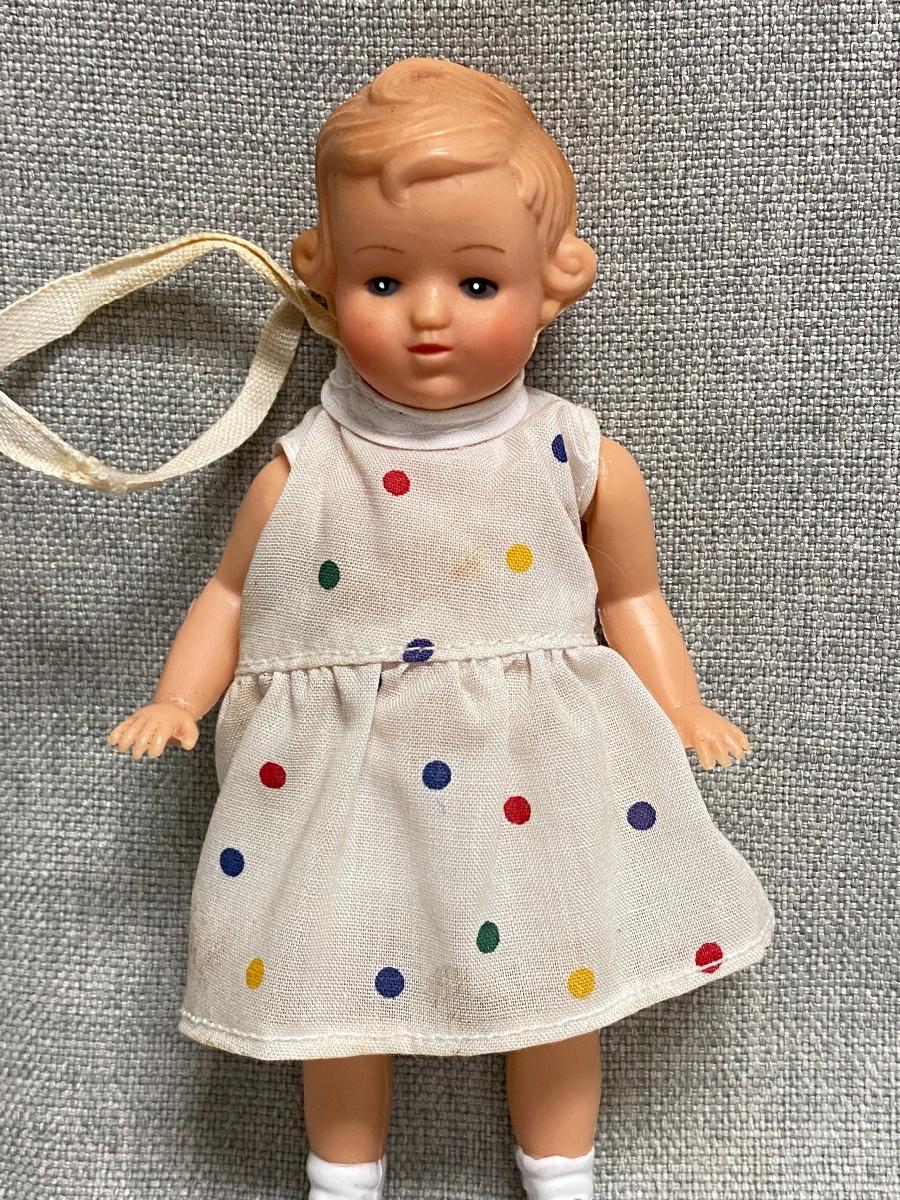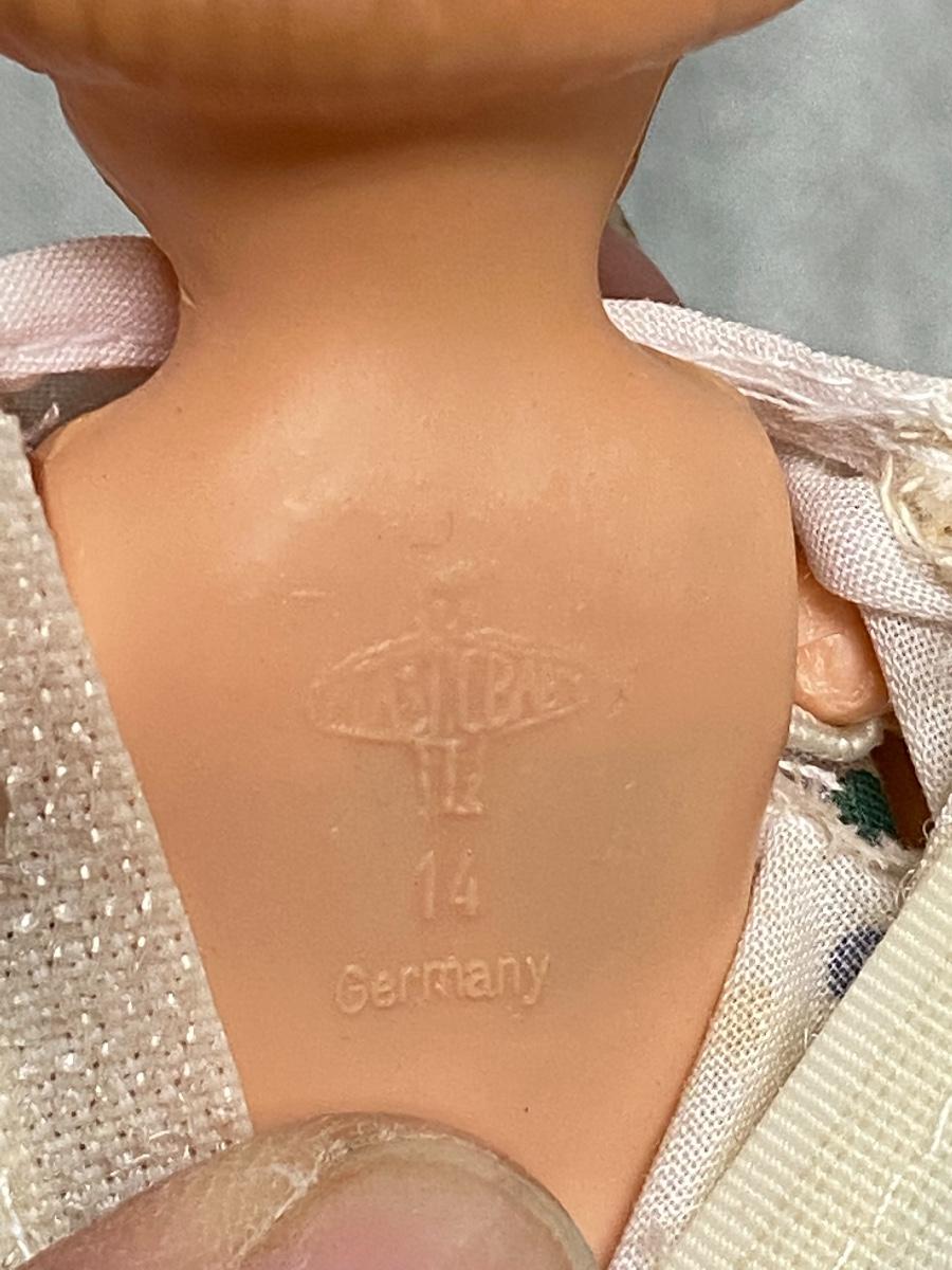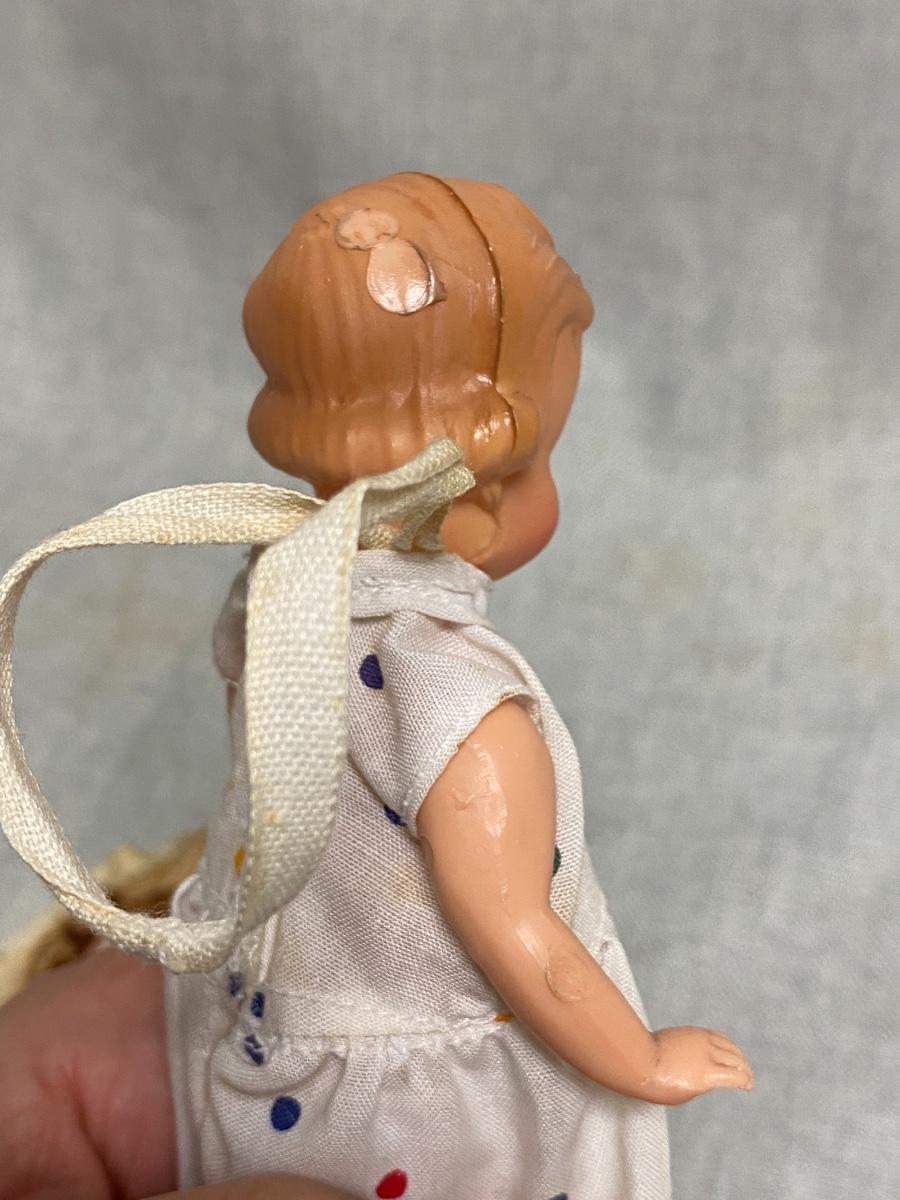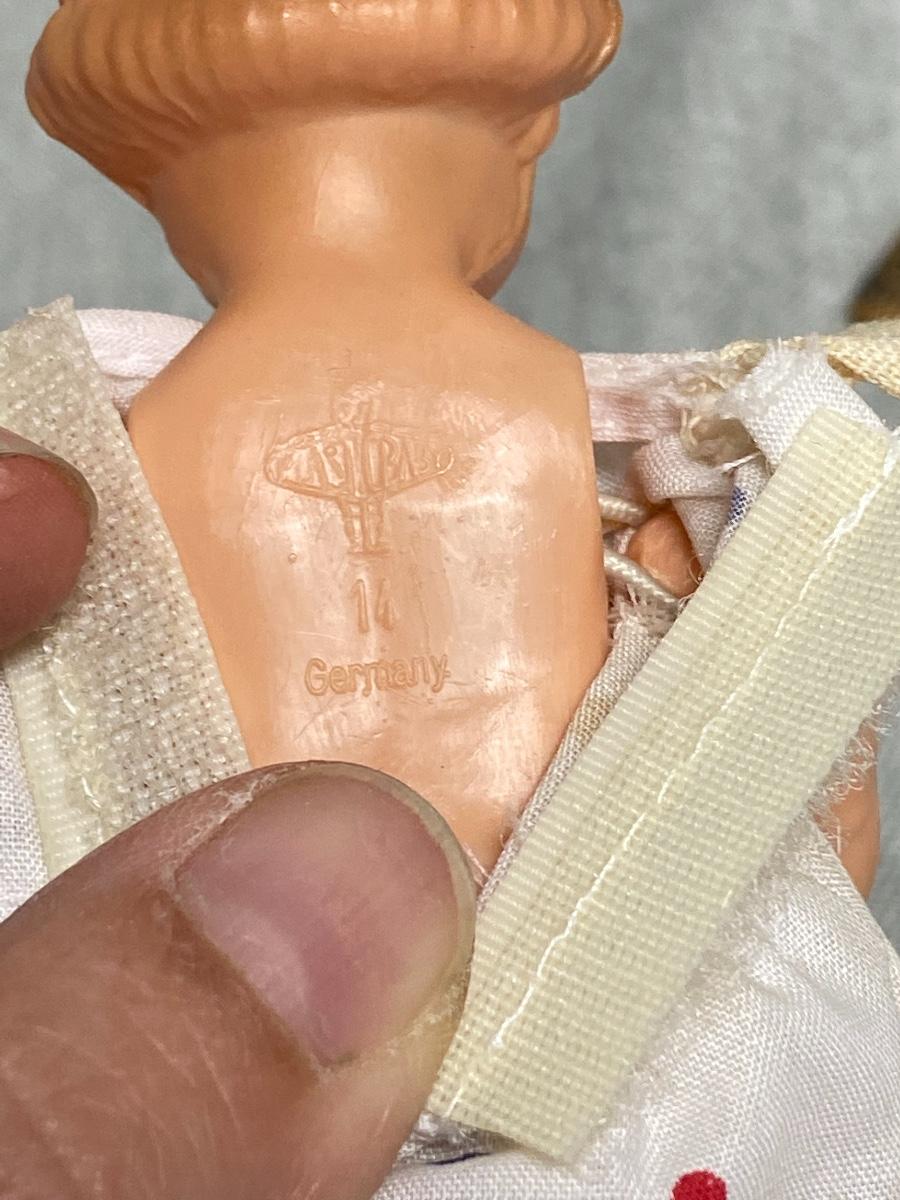 Set of 3 celluloid plastic dollhouse doll miniatures. The smaller are about 3" and unmarked. The larger is jointed, about 5" size and is marked on the back. Believe it might be Play Baby 14 Germany. In good vintage condition.