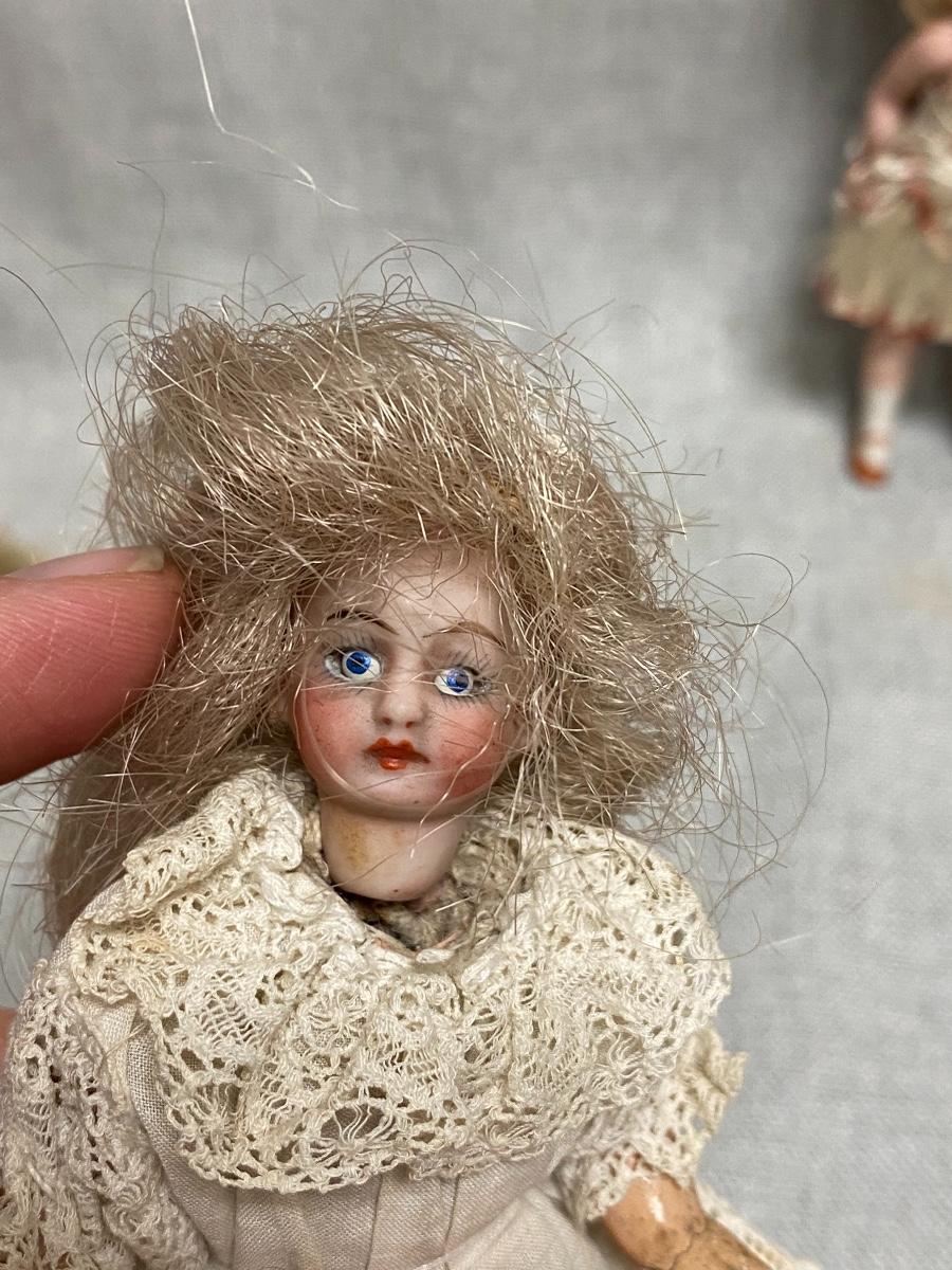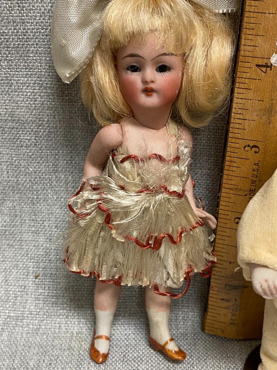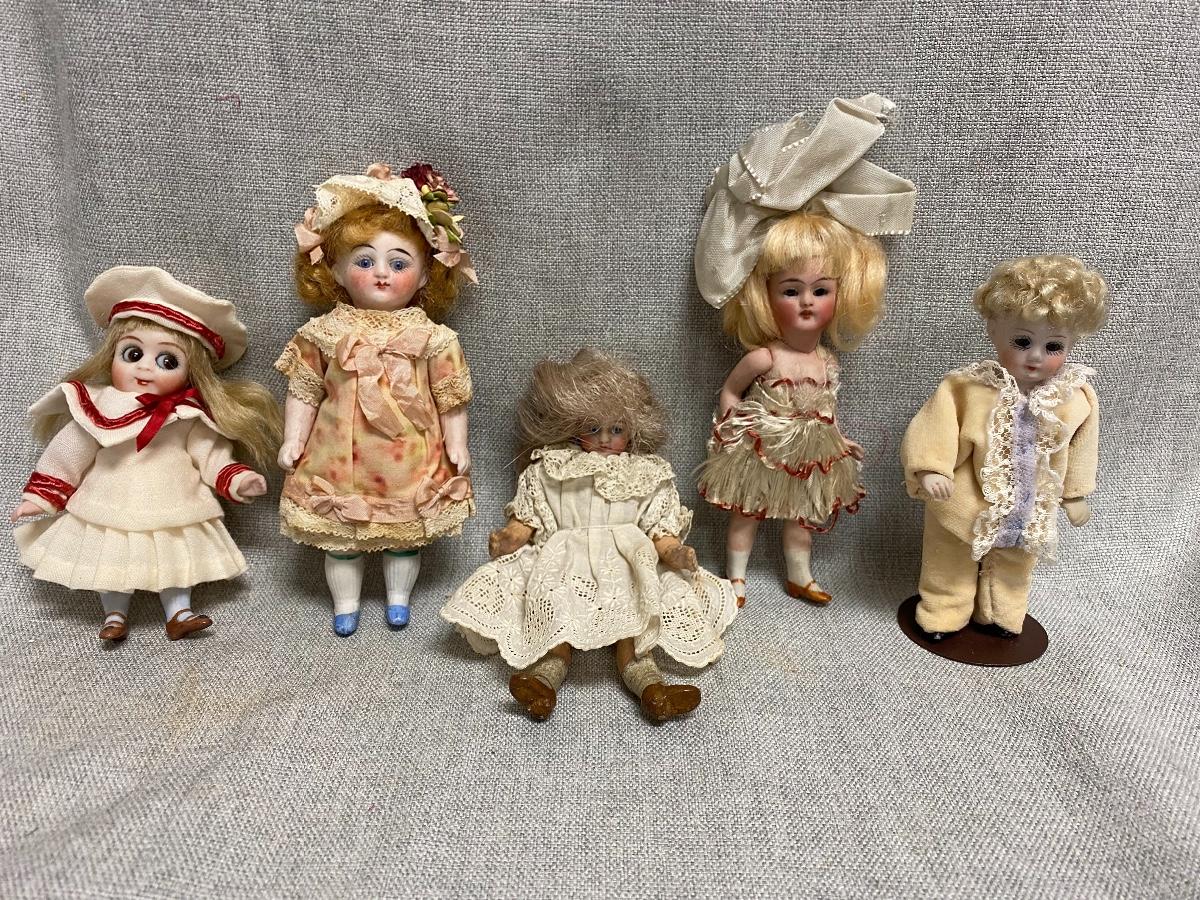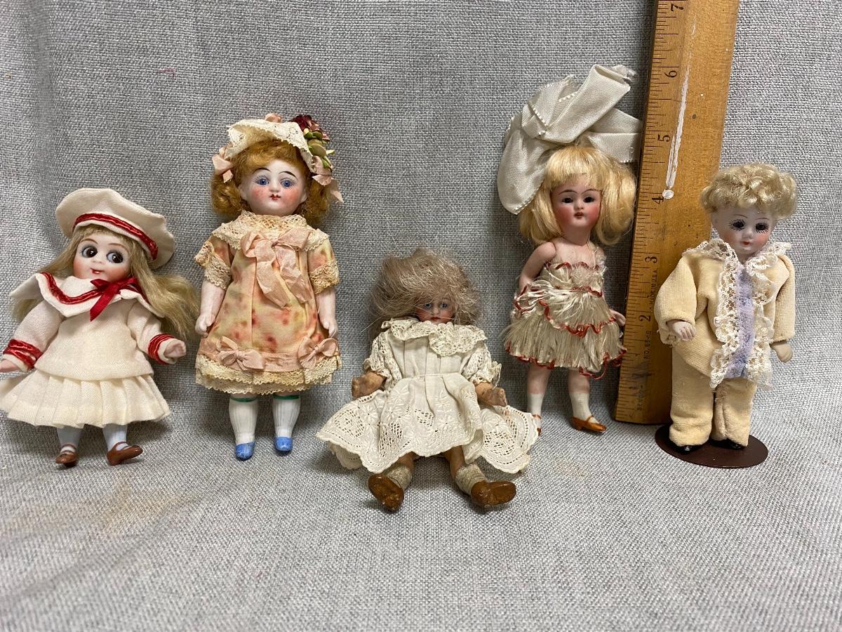 Lot of 5 dollhouse doll miniatures. Jointed dolls with glass eyes. Most are marked as seen in photos. The blonde doll with large hair bow is K⭐R.