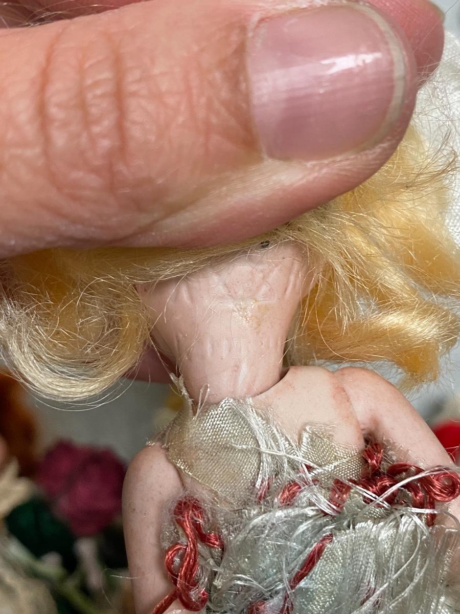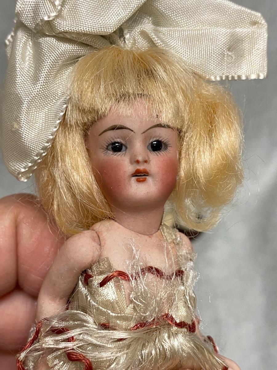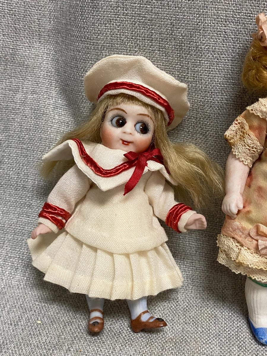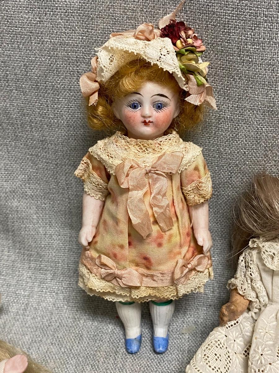 Lot of 5 dollhouse doll miniatures. Jointed dolls with glass eyes. Most are marked as seen in photos. The blonde doll with large hair bow is K⭐R.
