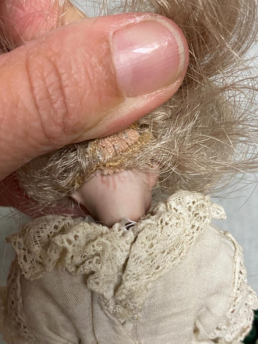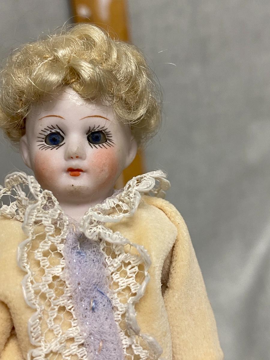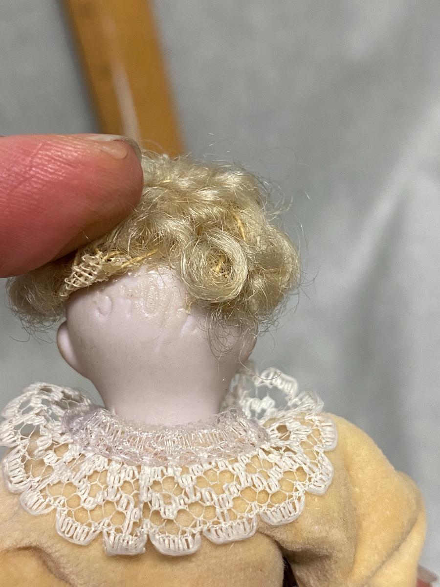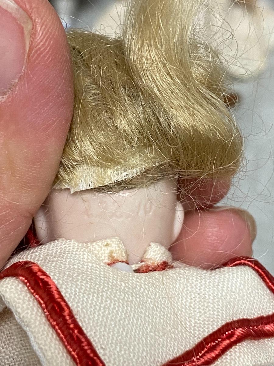 Lot of 5 dollhouse doll miniatures. Jointed dolls with glass eyes. Most are marked as seen in photos. The blonde doll with large hair bow is K⭐R.