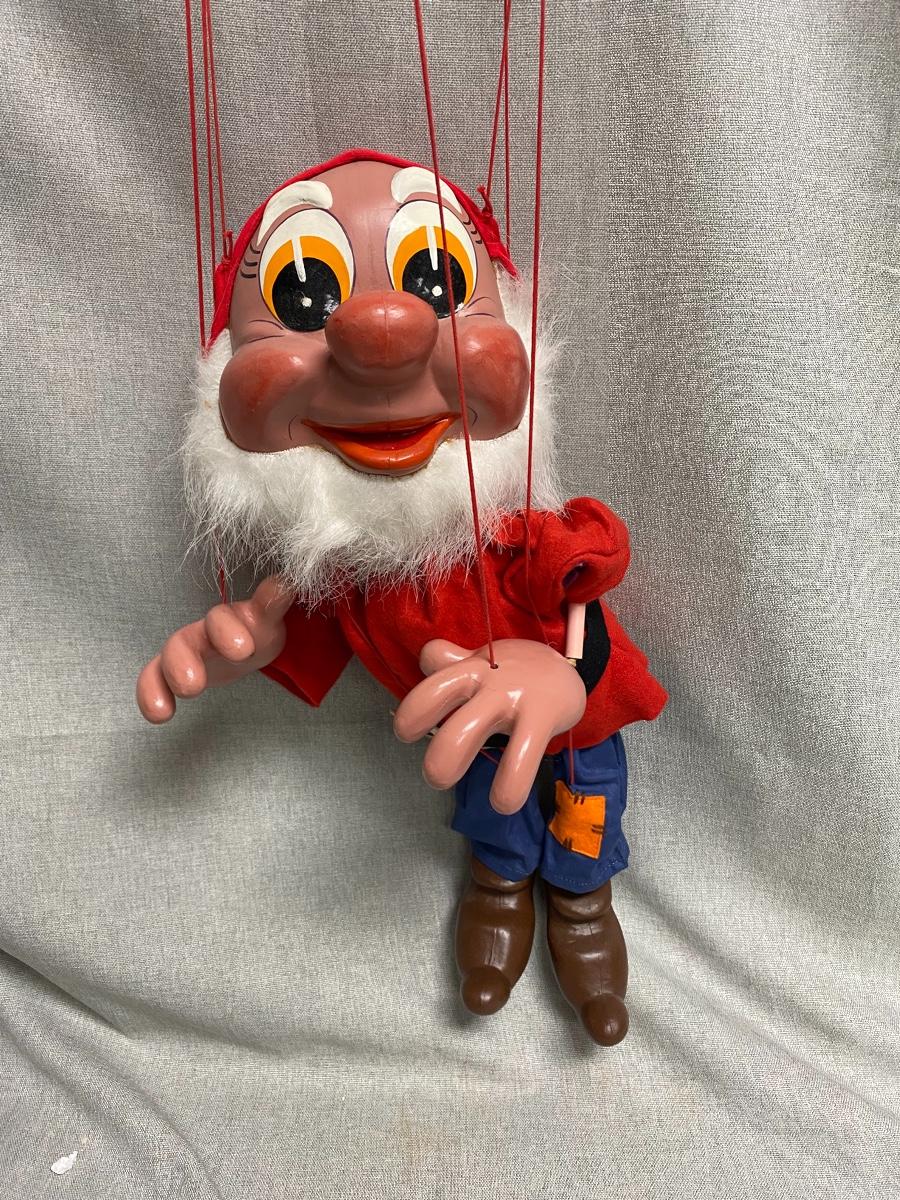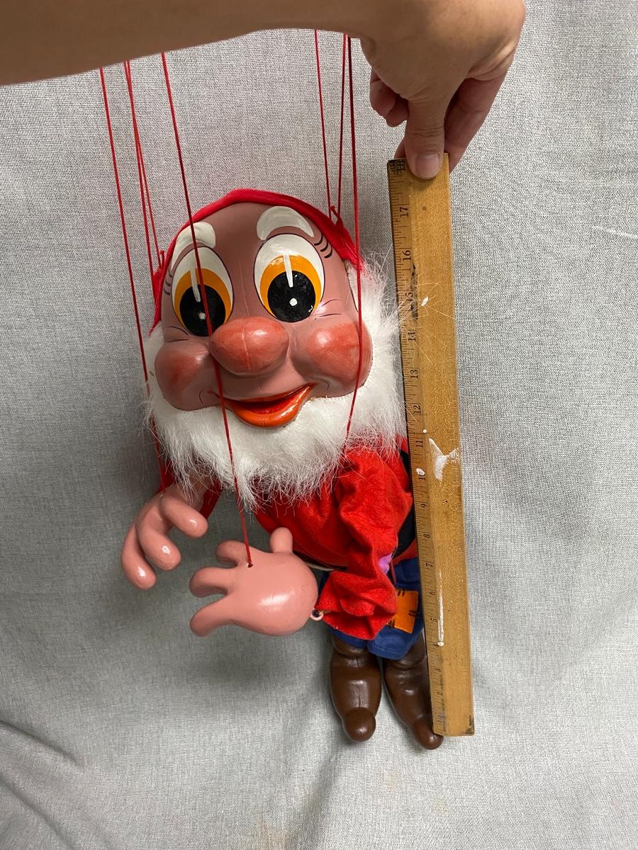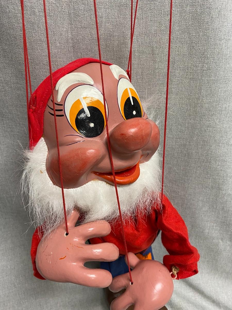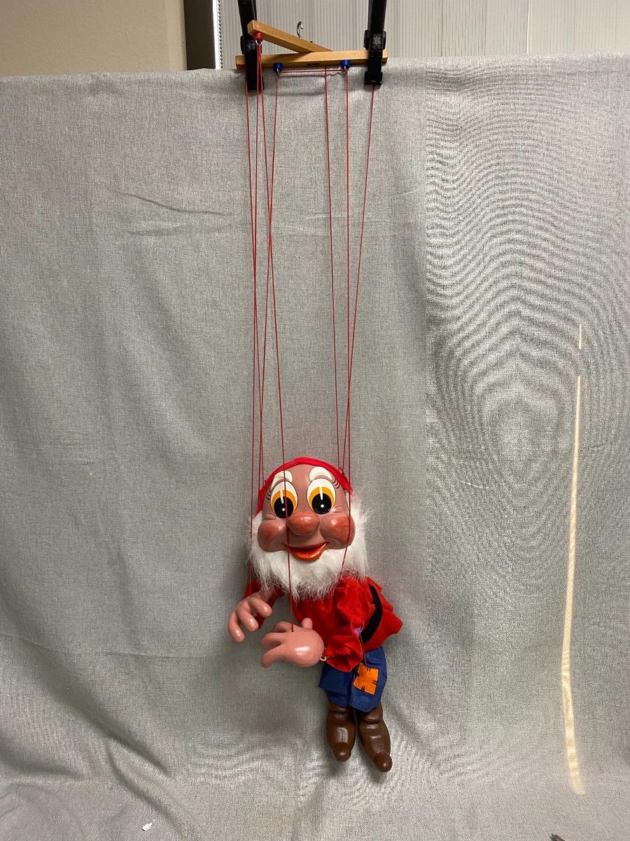 Large "Happy" dwarf string puppet marionette. From Pelham Puppets and Walt Disney. About 20" size not including the strings. In great condition.