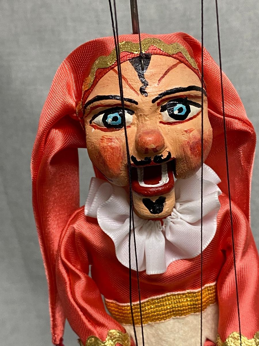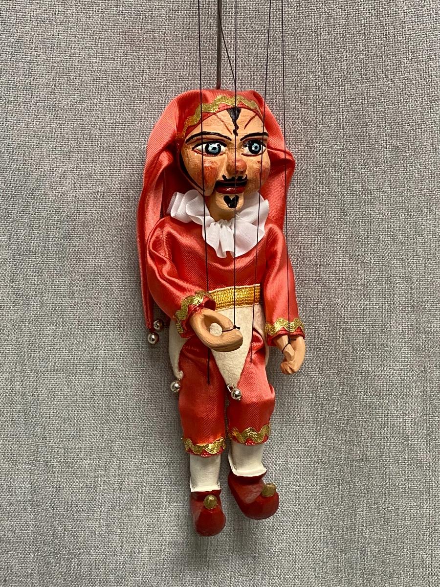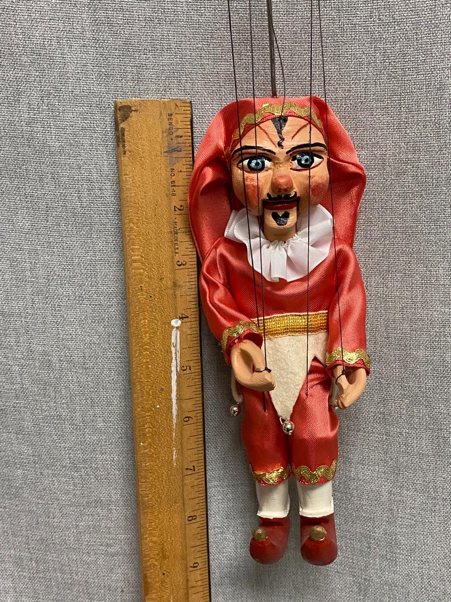 Small court jester marionette. Moveable mouth. About 9" size not including strings. Has strings and control rod.