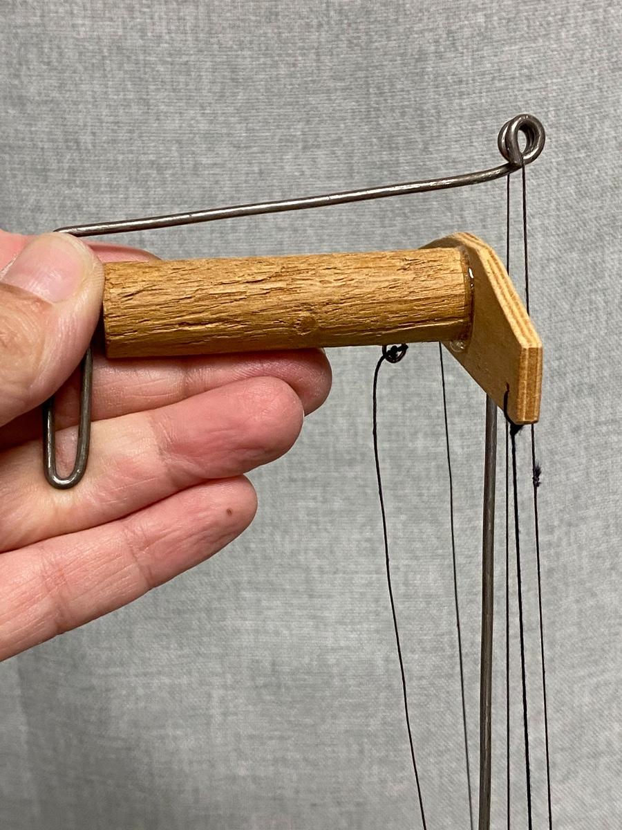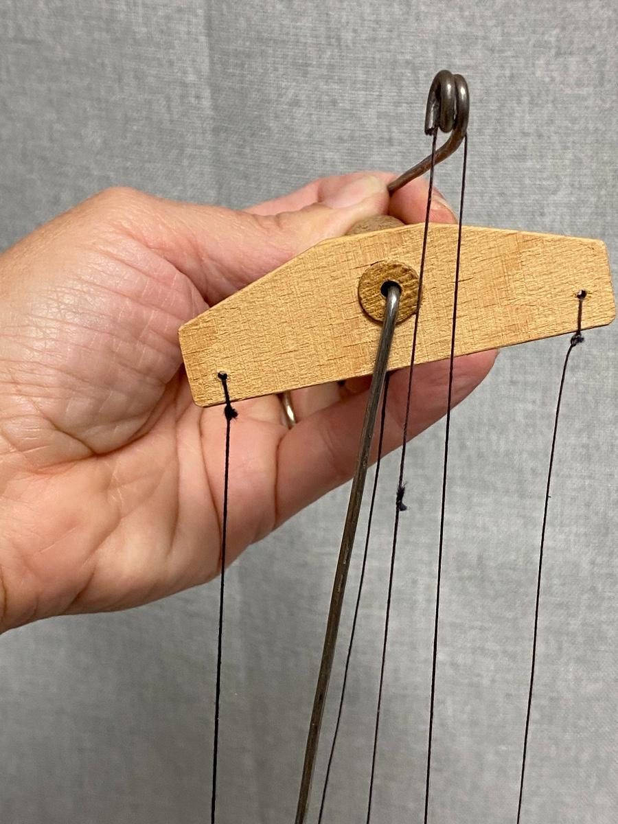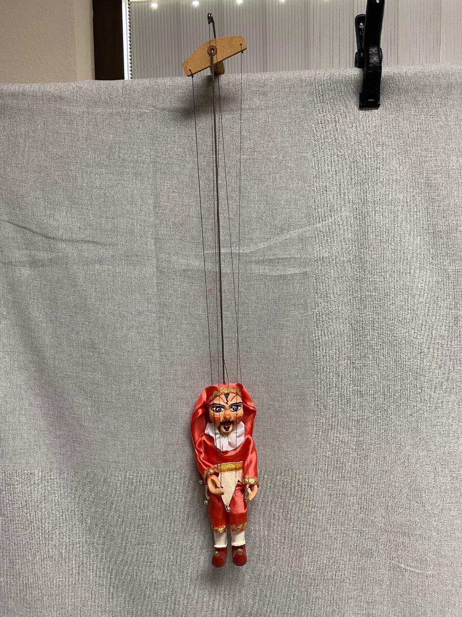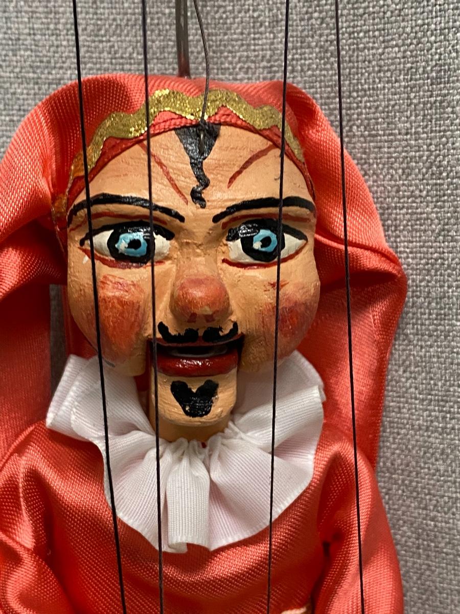 Small court jester marionette. Moveable mouth. About 9" size not including strings. Has strings and control rod.
