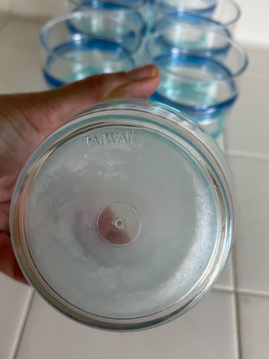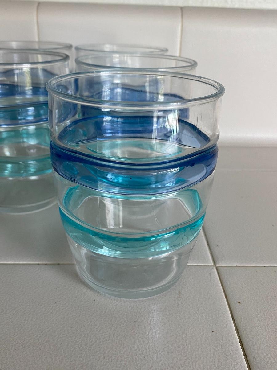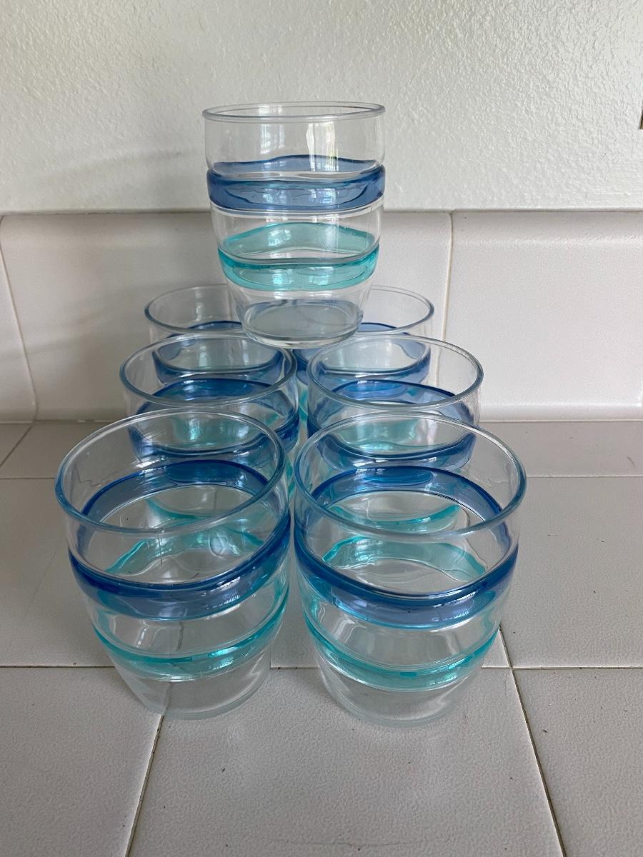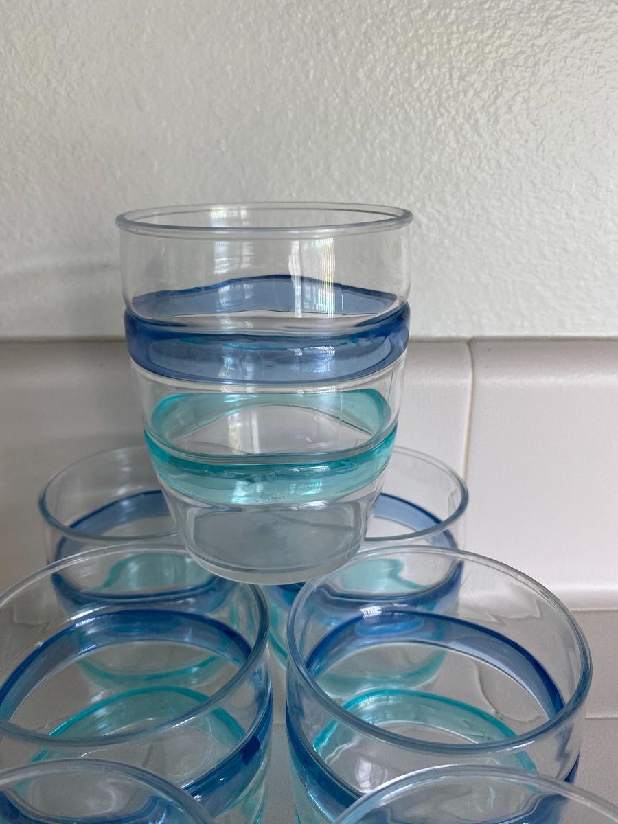 Blue stripe plastic tumblers. Good used condition. Rocks size short cups.