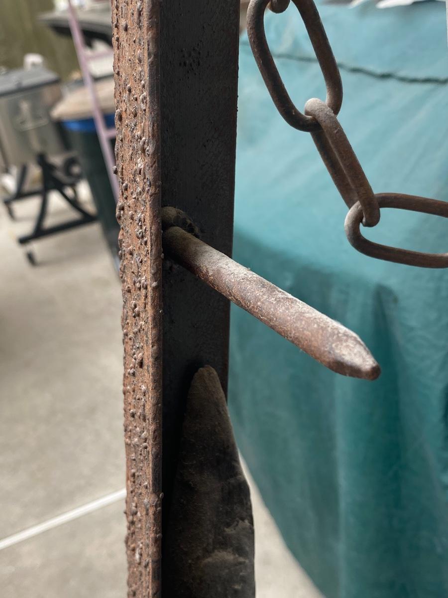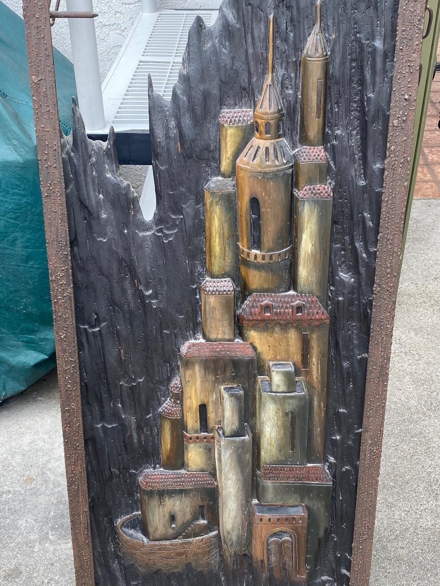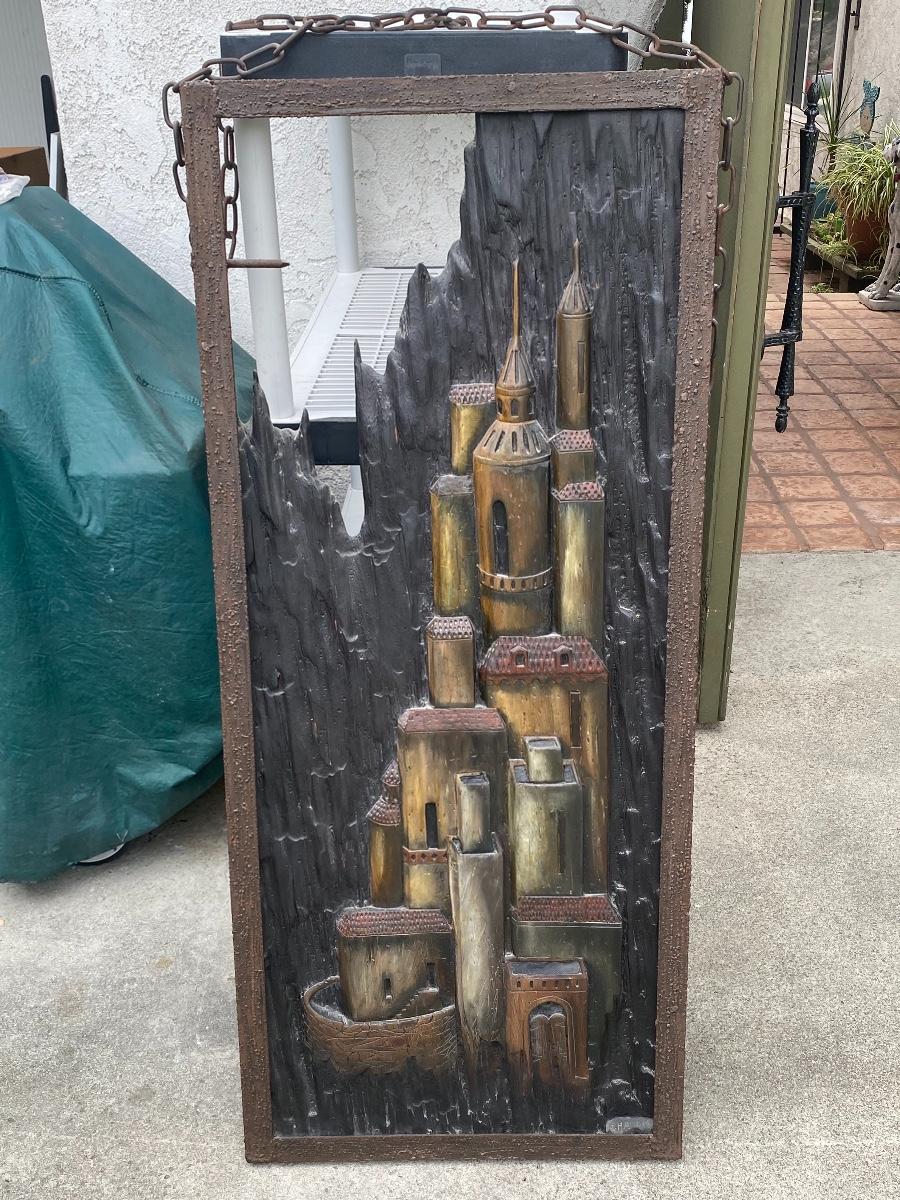 Vintage Carved Wood Medieval Castle Art. Castle piece is carved and painted wood. Iron frame with large link chain for hanging. About 5' tall. Signed by artist Glenn Hagen Aptos, Calif.