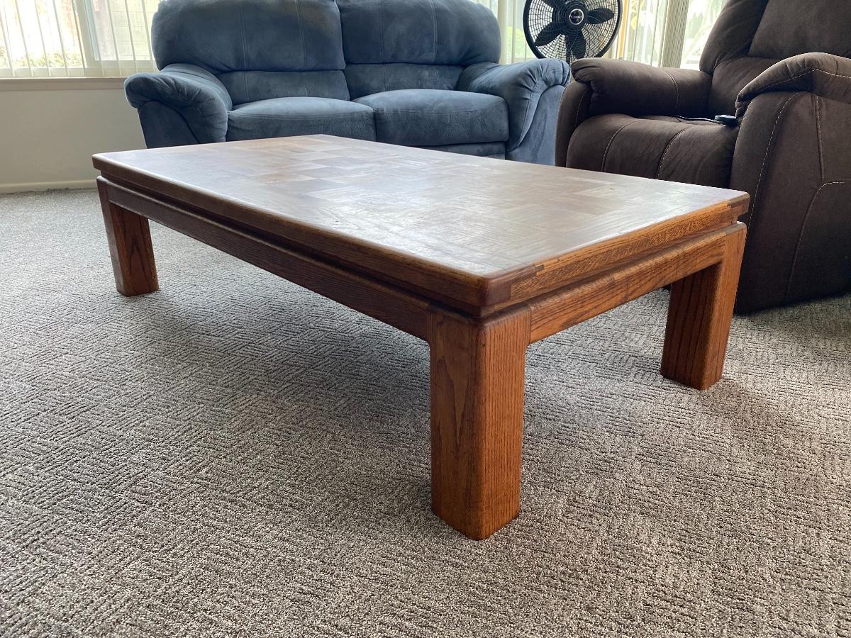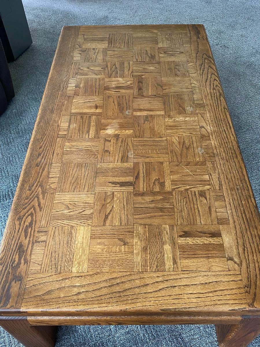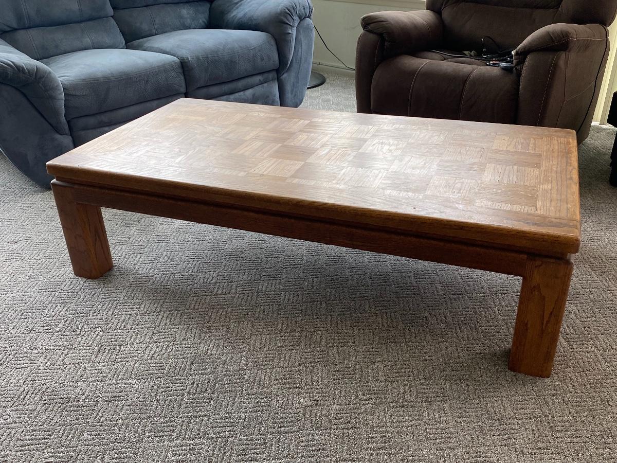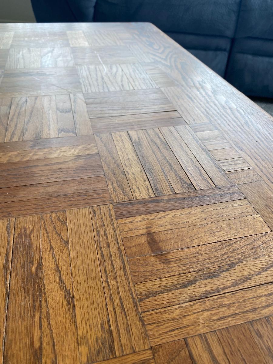 Retro Wood Parquet Top Coffee Table. Does have signs of use, some of the wood parquet slats are warped, maybe from water or drink condensation.