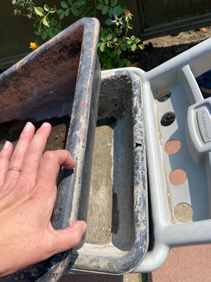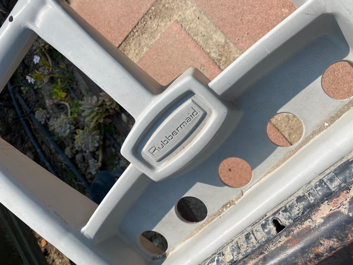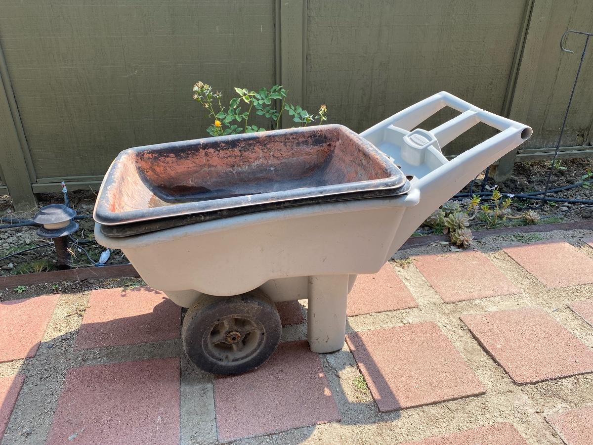 Rubbermaid Small Wheel Barrow Garden Cart. Comes with two additional plastic trays. Lightly weathered but in good used condition.