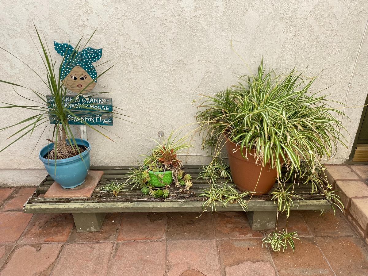Potted Plants, Garden Sign, and Planter Bench. Everything photo'd. Bench is a wood slat platform with cinder block feet, it does have signs of wear. age, and weather. Plants are very healthy looking.