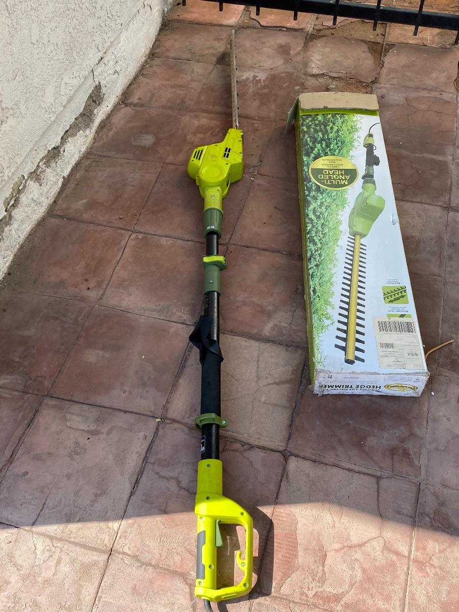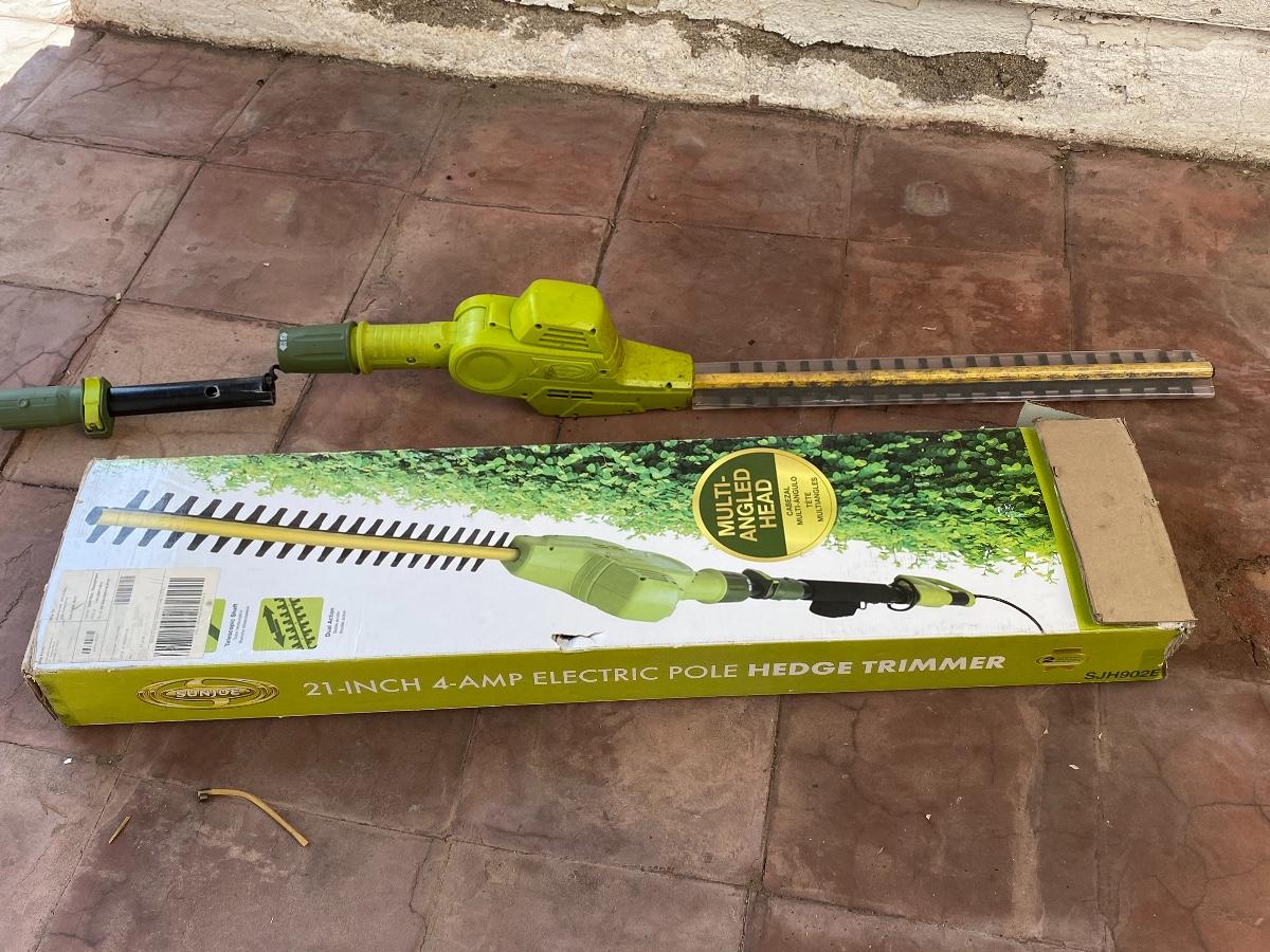 Sun Joe SJH902E 21-in 4-Amp Multi-Angle Electric Telescoping Pole Hedge Trimmer, there is some wear and use to the trimmer, see pictures for more details. Untested.
