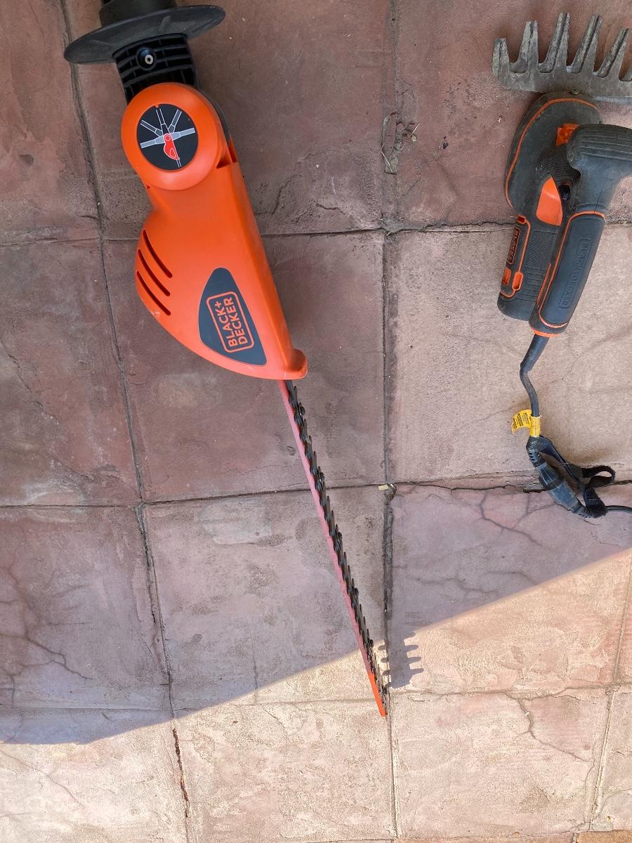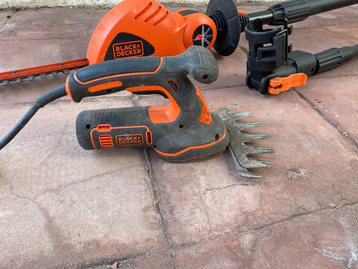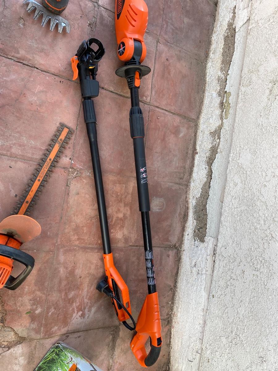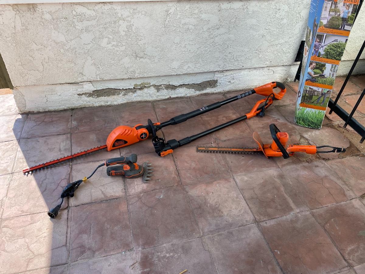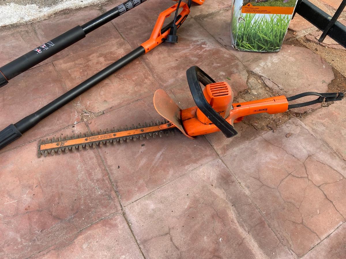 Set of Black and Decker Cordless Hedge Trimmers, comes with a 16" trimmer, a convertible pole trimmer, and electric shears. There is some use from the tools and have been untested.