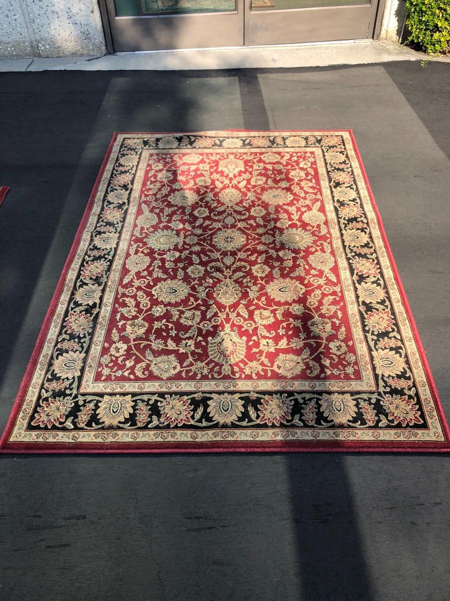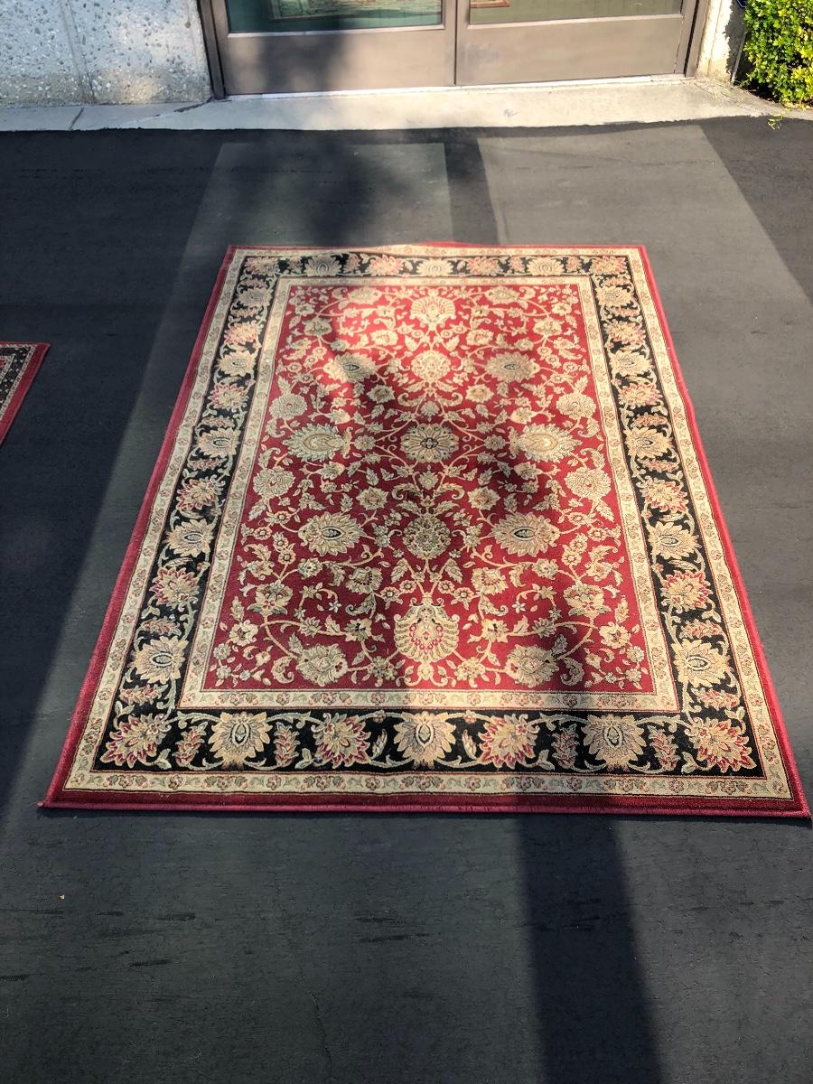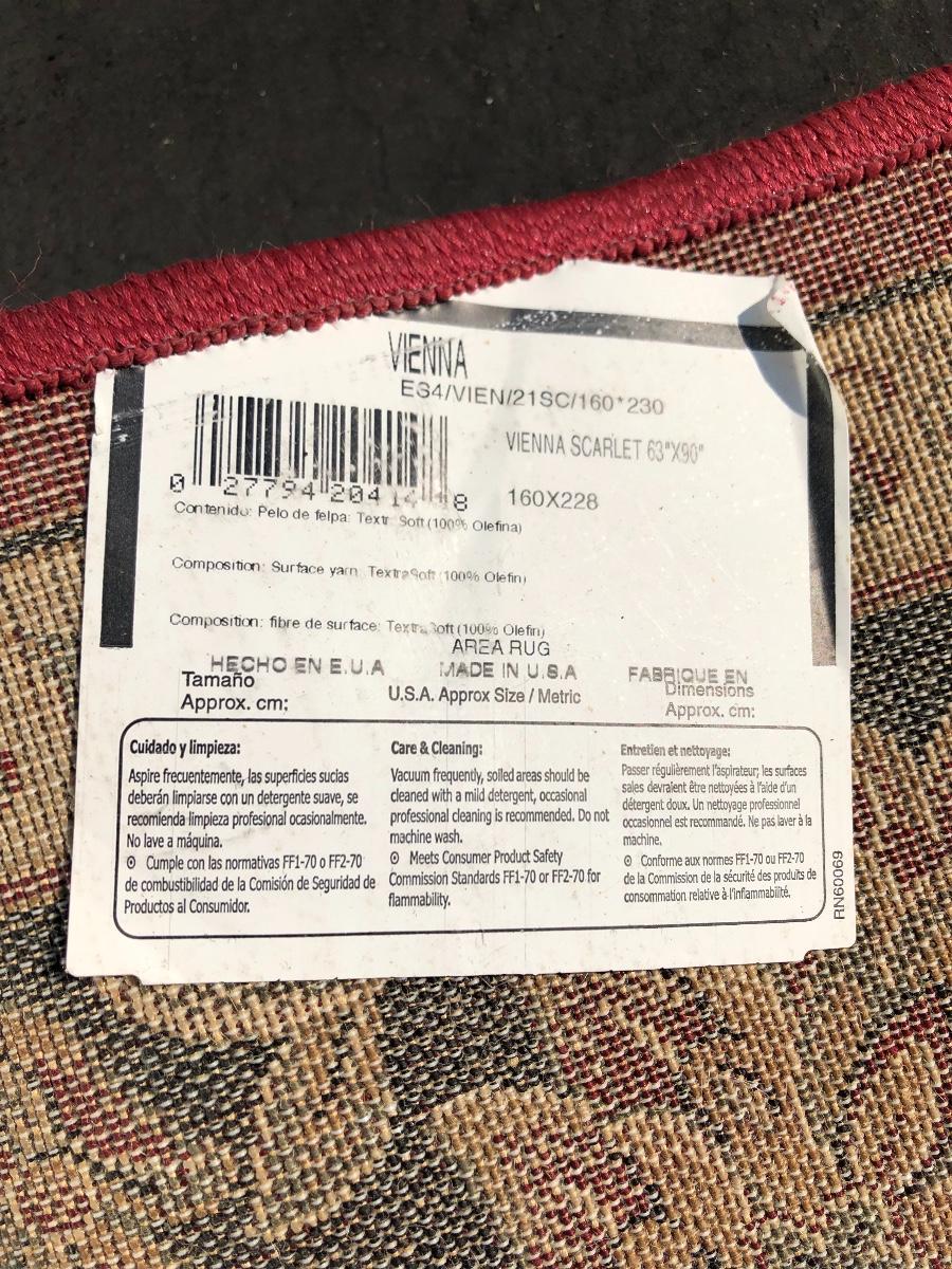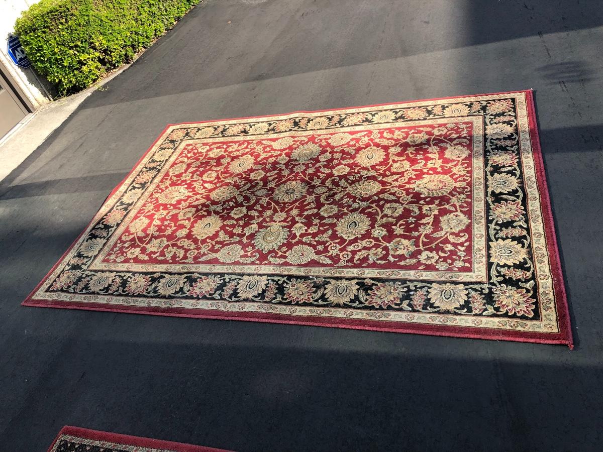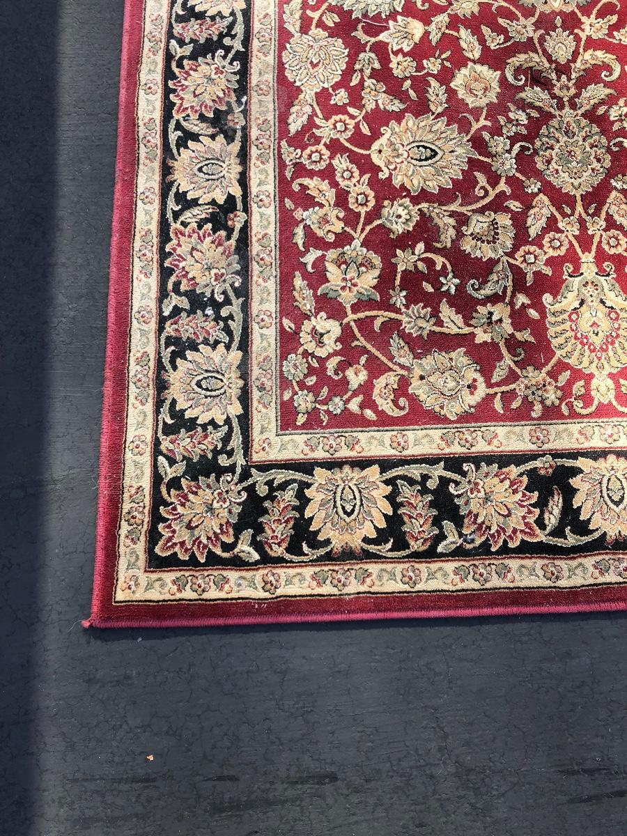 Large Red and Black Area Rug. Measures 63x90. No major spots or stains noticed.