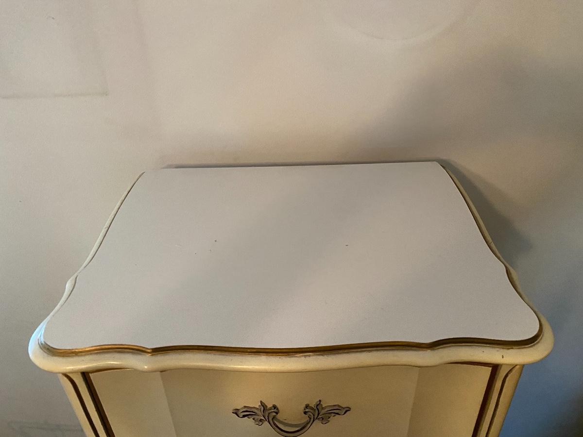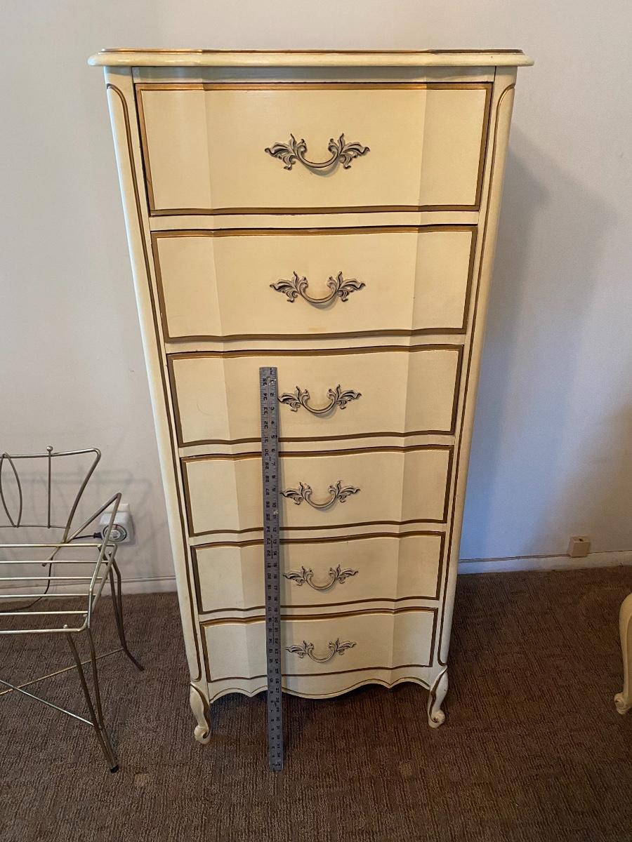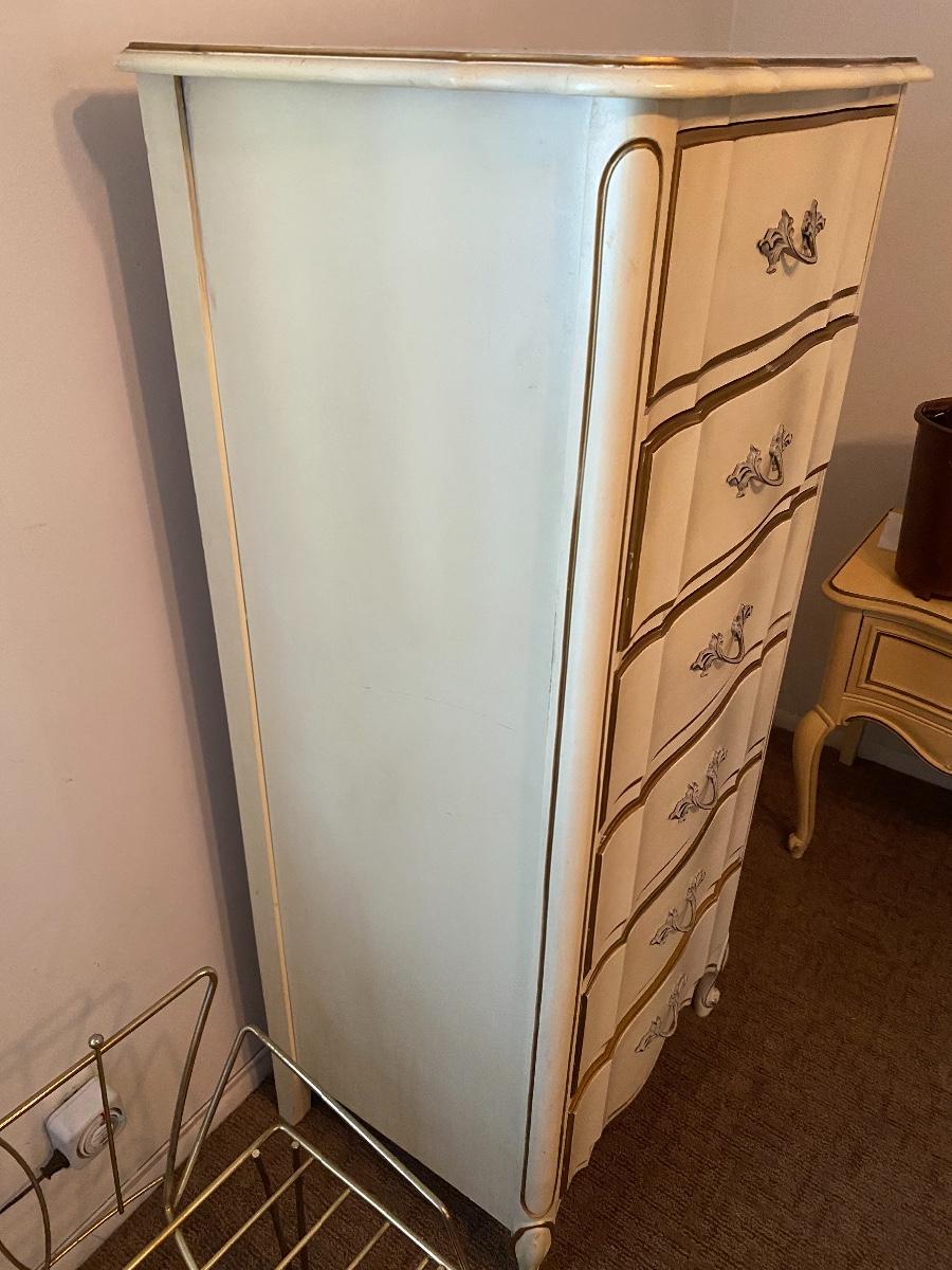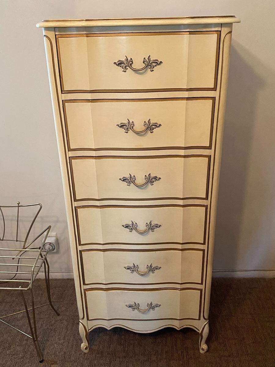 Vintage highboy lingerie dresser. Off white Hollywood regency French Provincial style. About 4.5' tall, 6 drawer. Good condition.