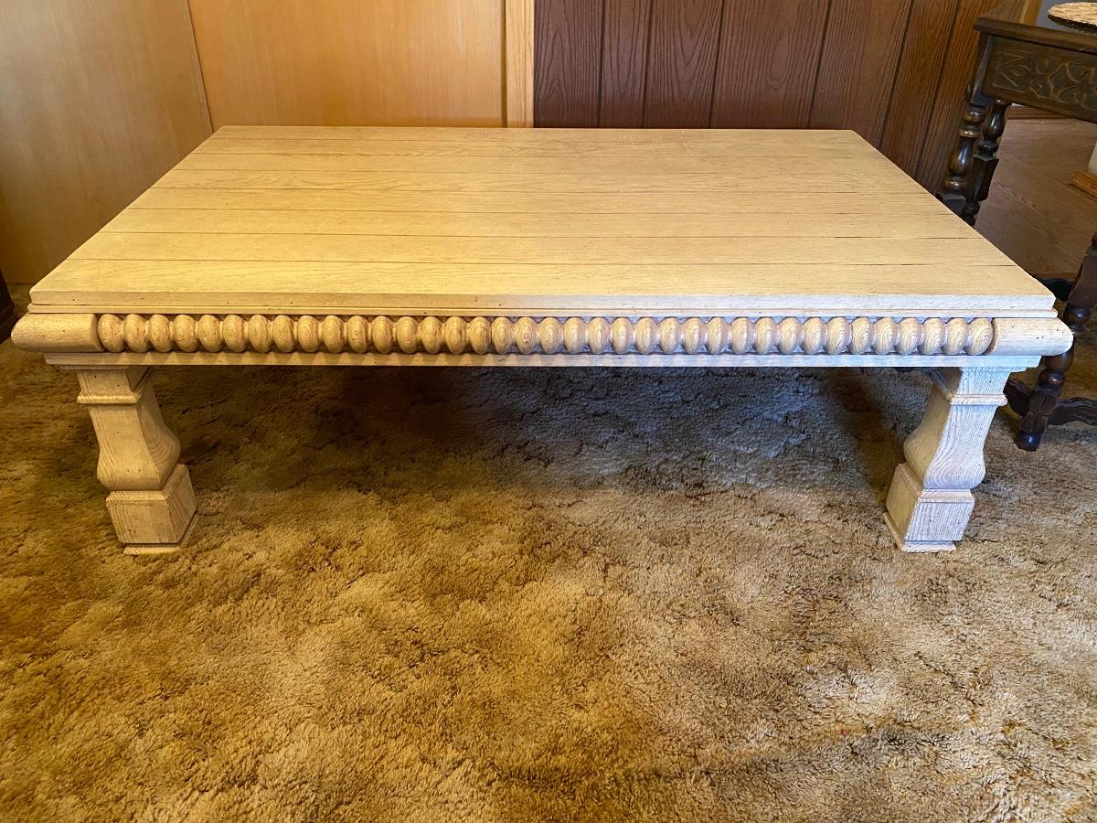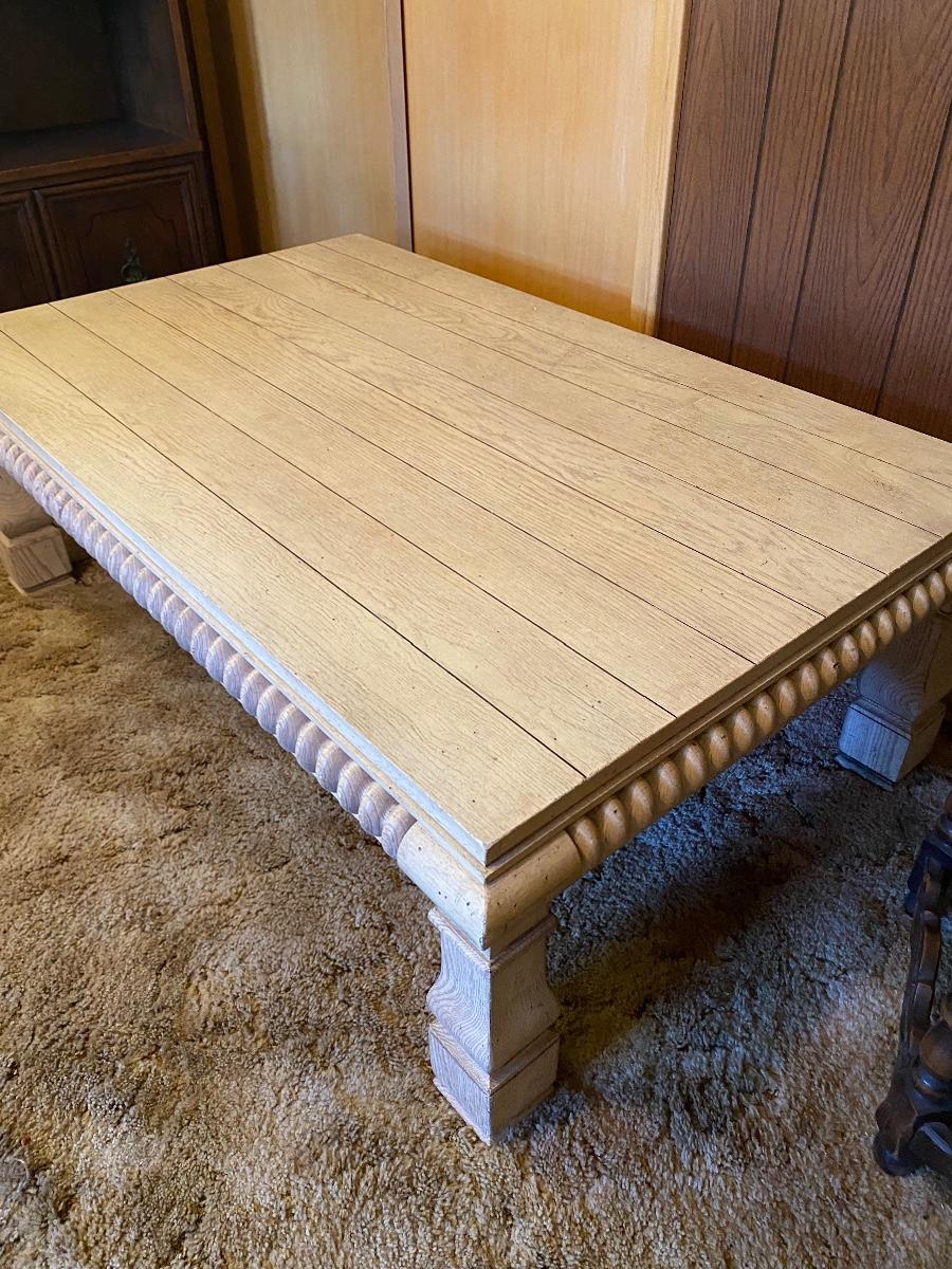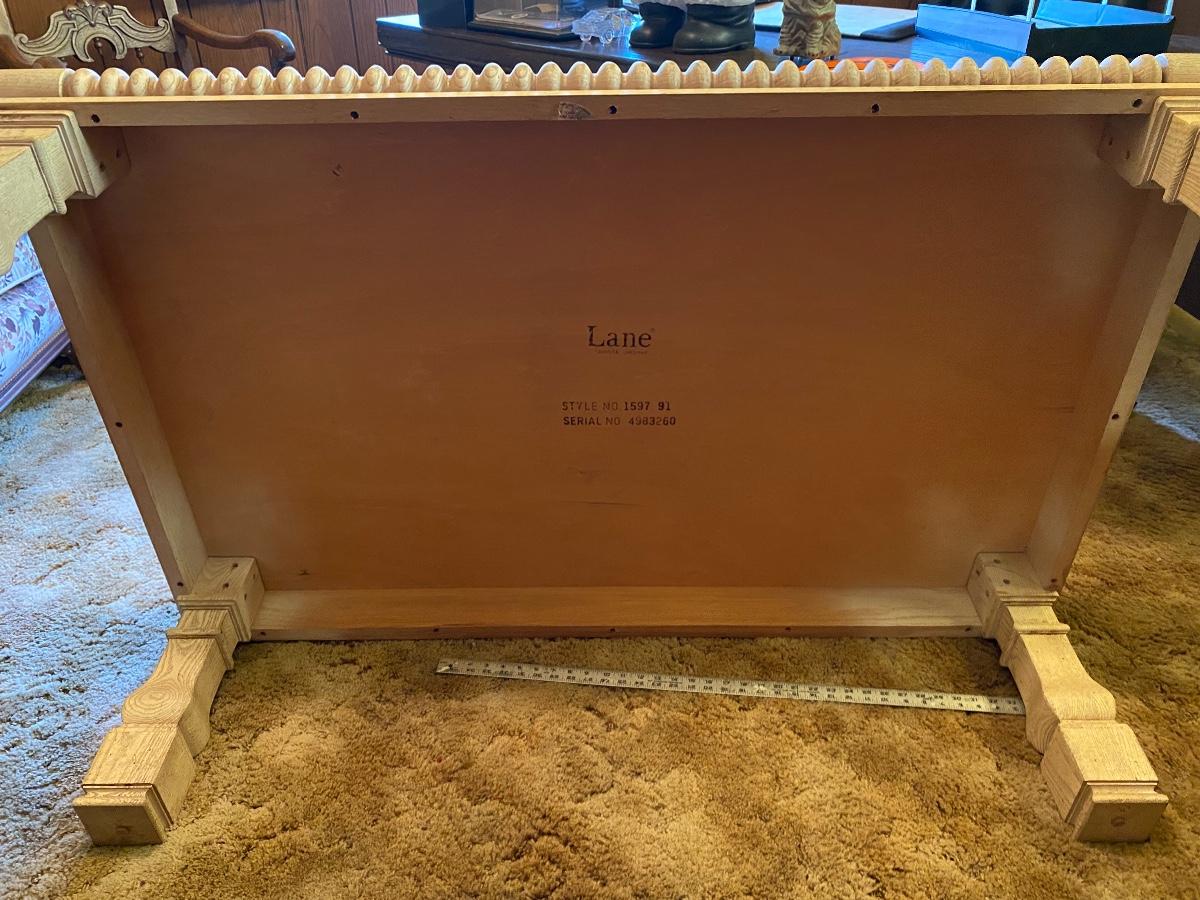 Large light wood coffee table by LANE. Stamped on the underside. About 5' length. Sturdy, some scratches on the surface.