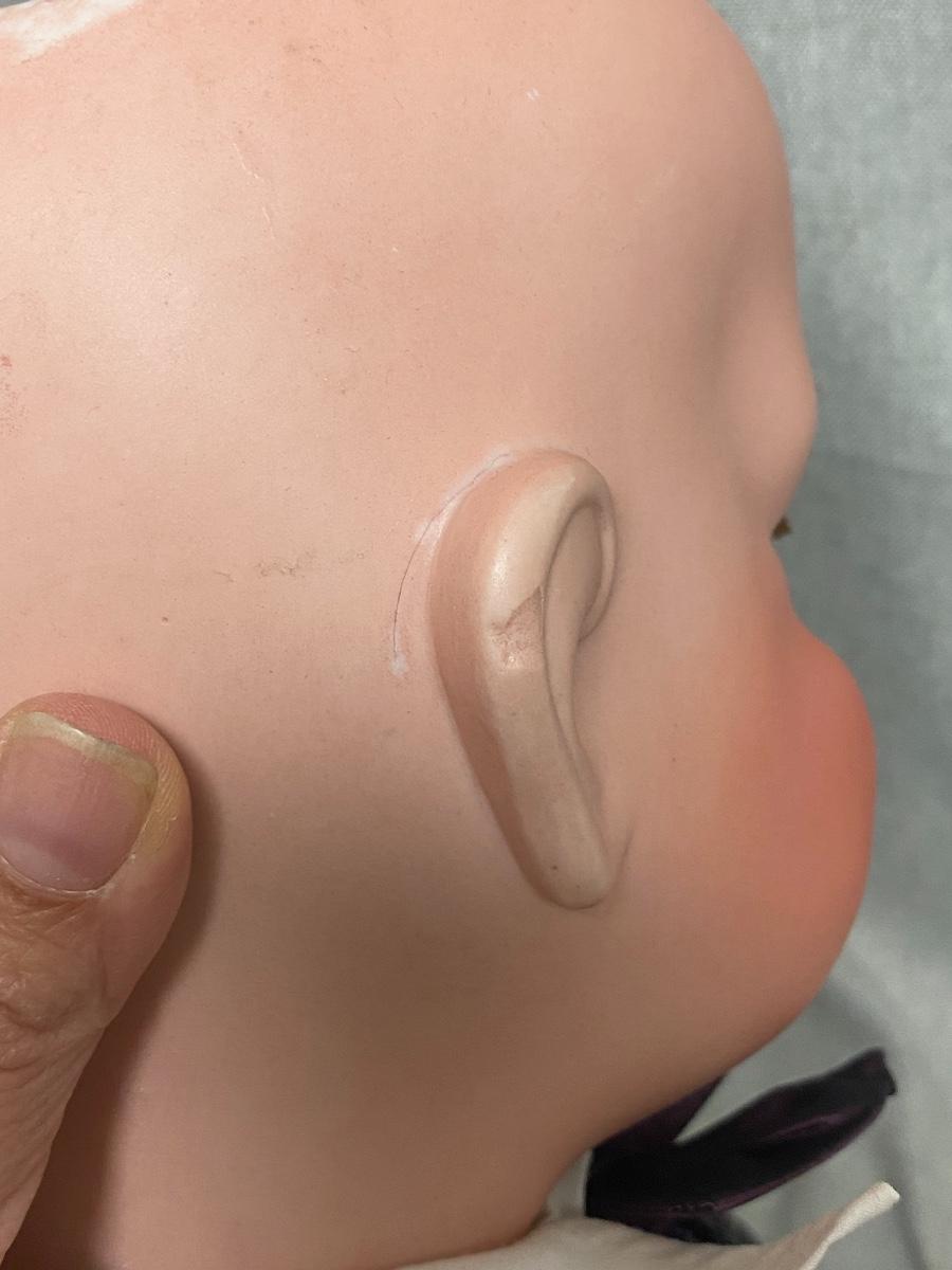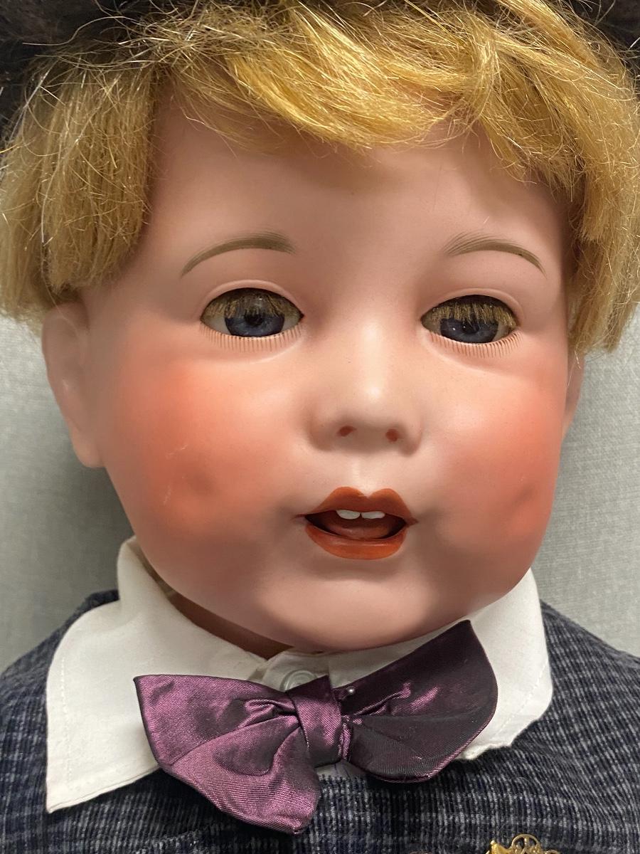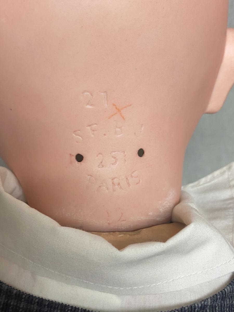 Vintage SFBJ 251 Paris boy bisque and composite doll. Sleep eyes have lashes but the lashes cover alot of the eyes when open. Dimple cheeks with an open mouth. There is damage/crack behind one ear and maybe on the other. Displays nicely. About 28" size. Some wear to composite, nothing too bad though.