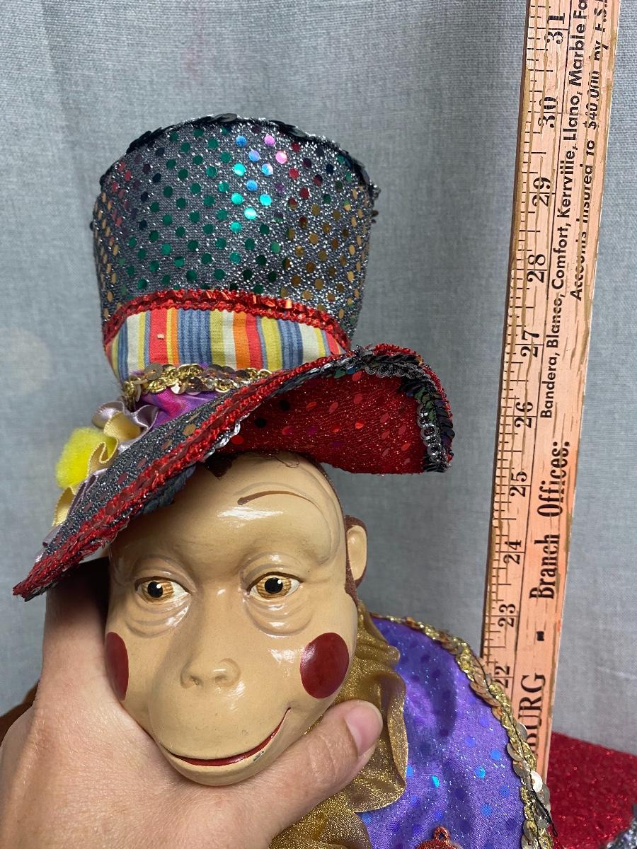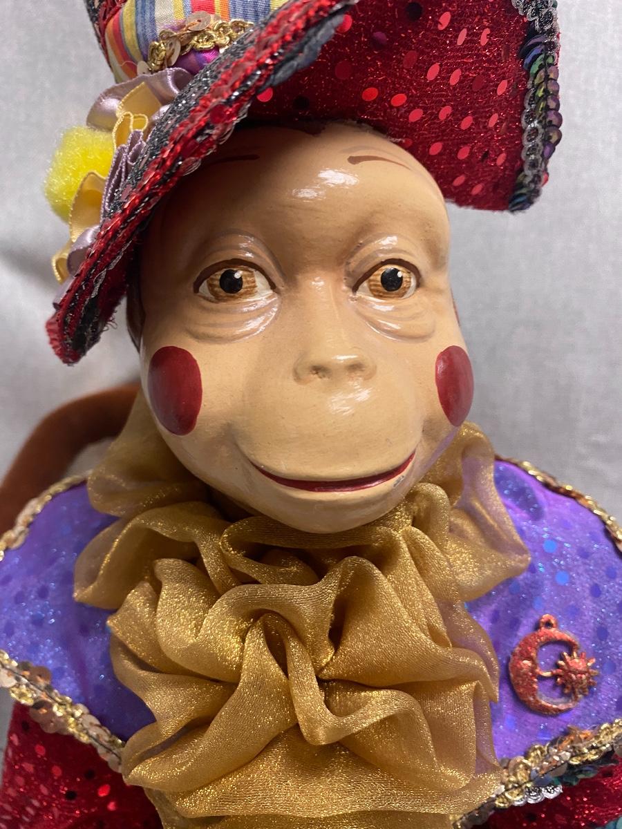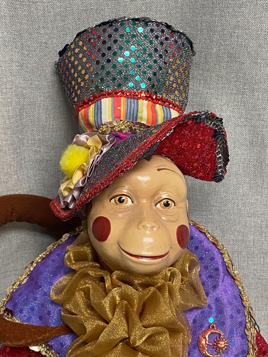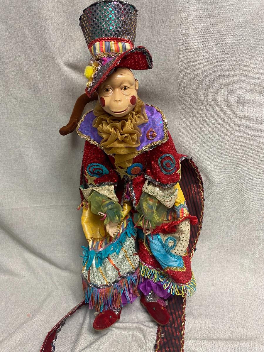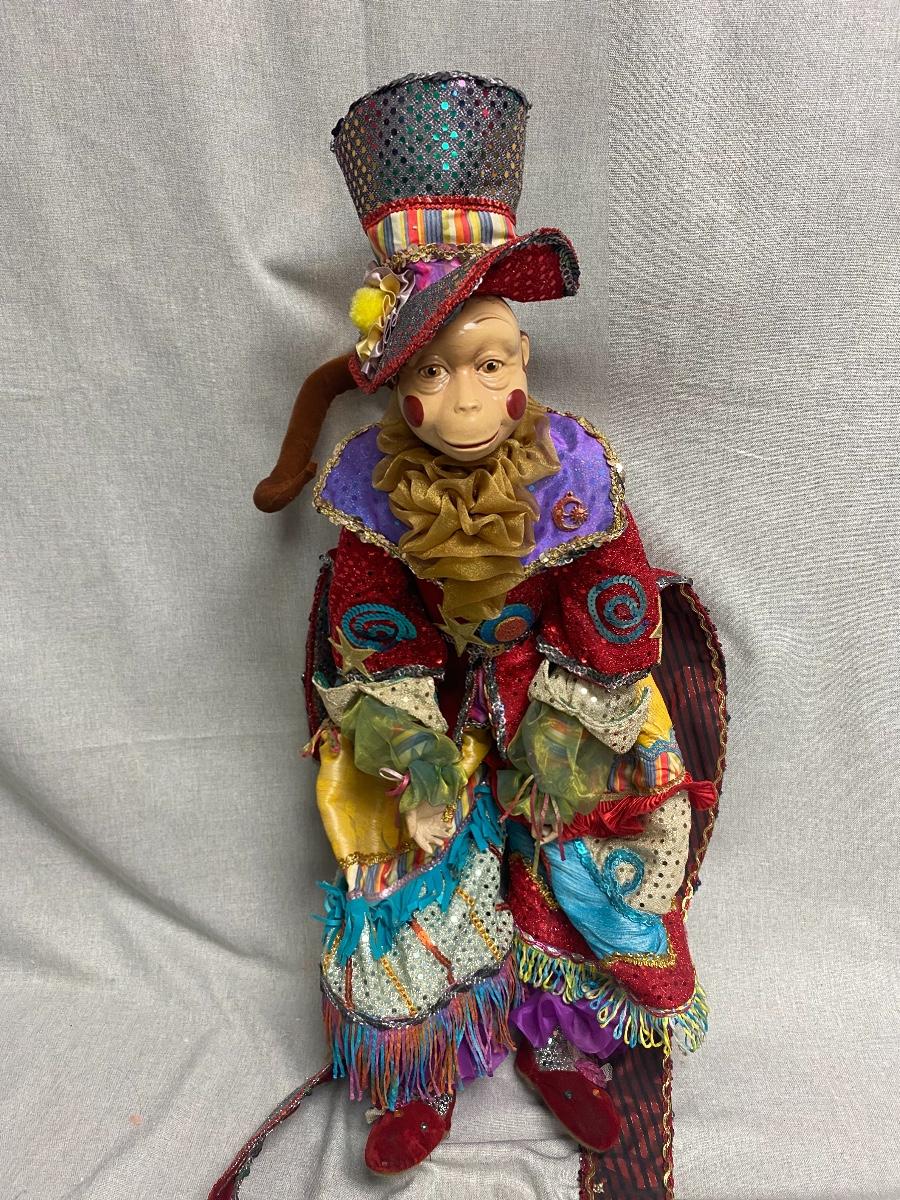 Colorful Court Jester Circus Clown Monkey Doll. Composite limbs and head with a soft body. Looks like it might be Wayne Kelski but I did not find any identifying tags on doll. In good condition. About 30" size.