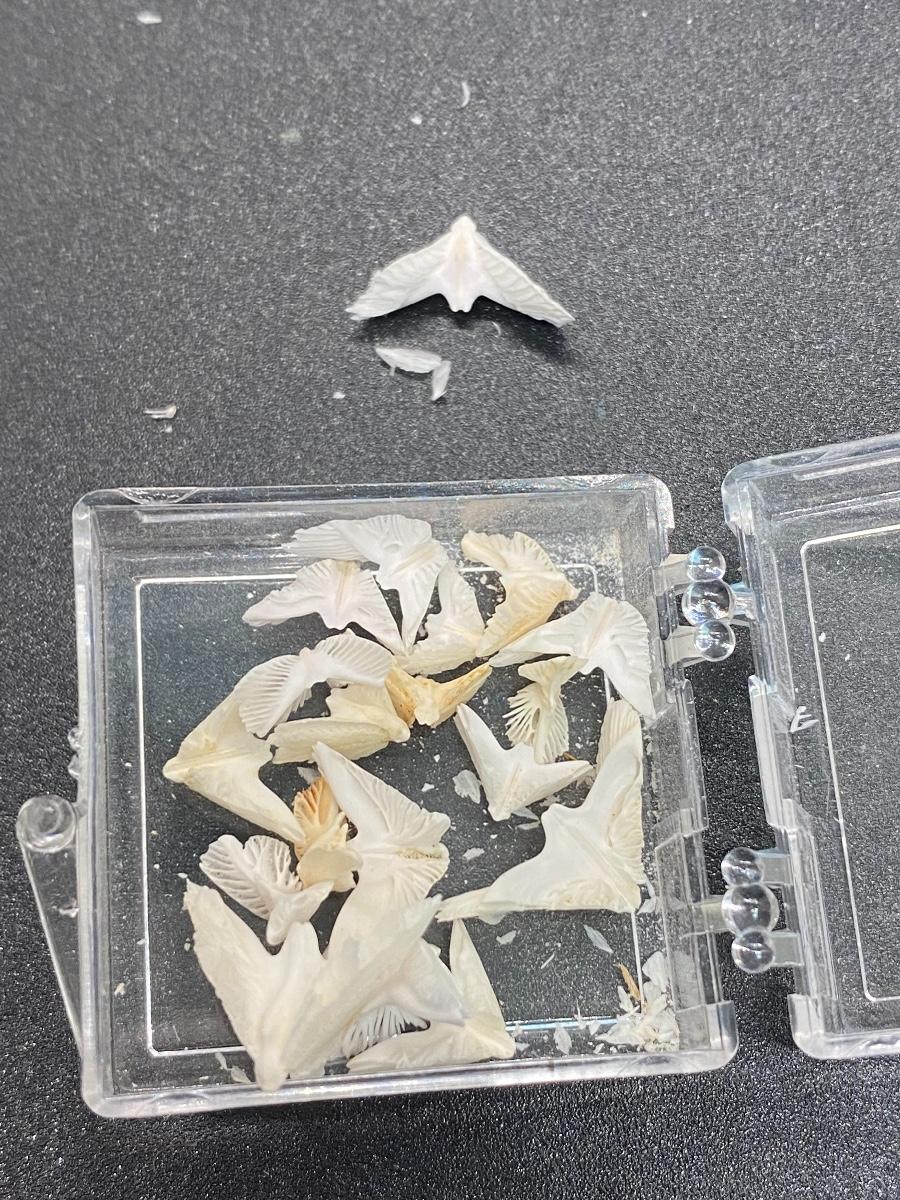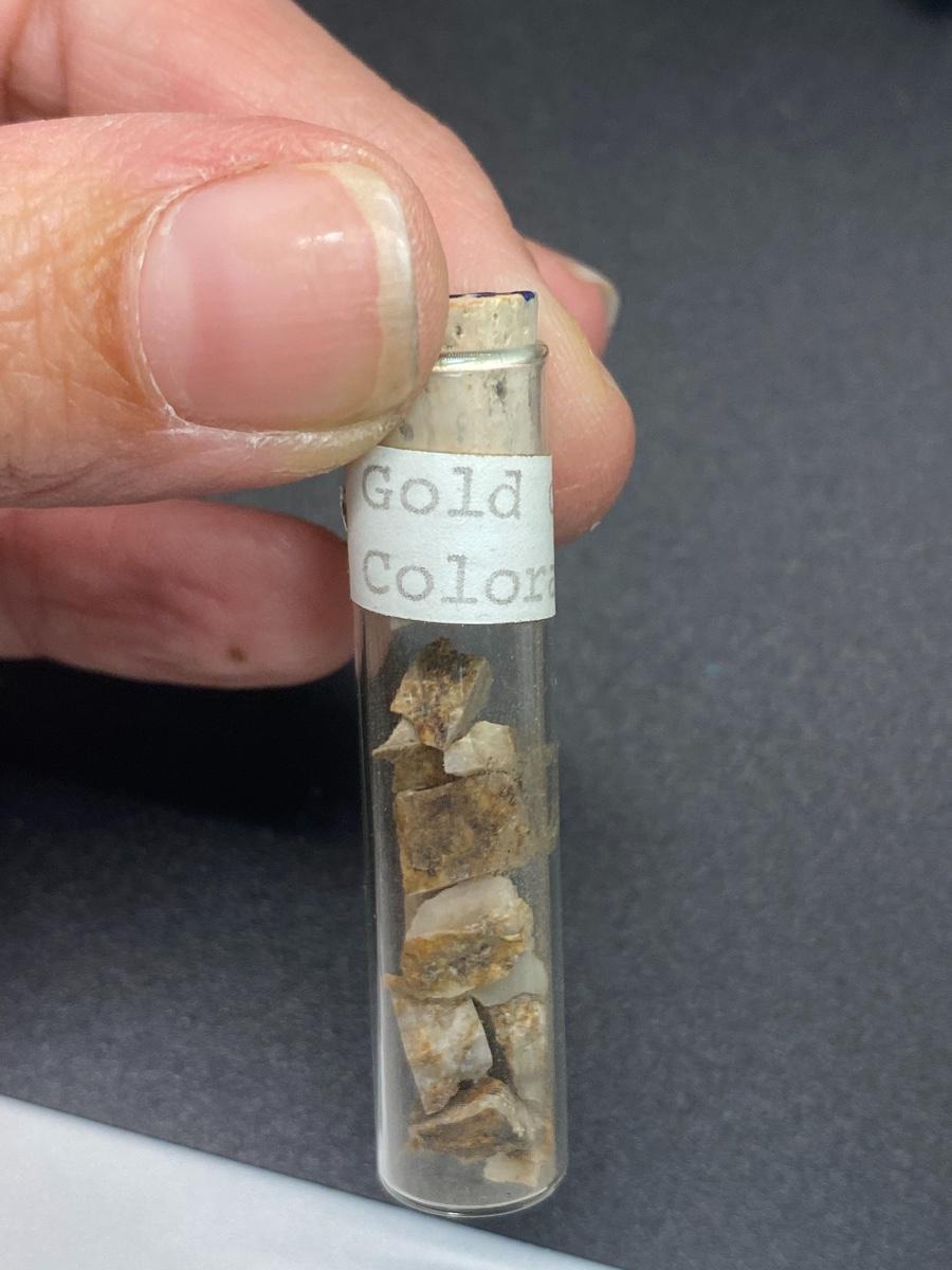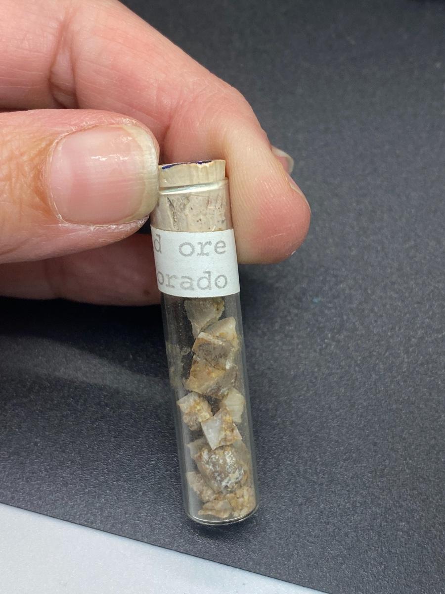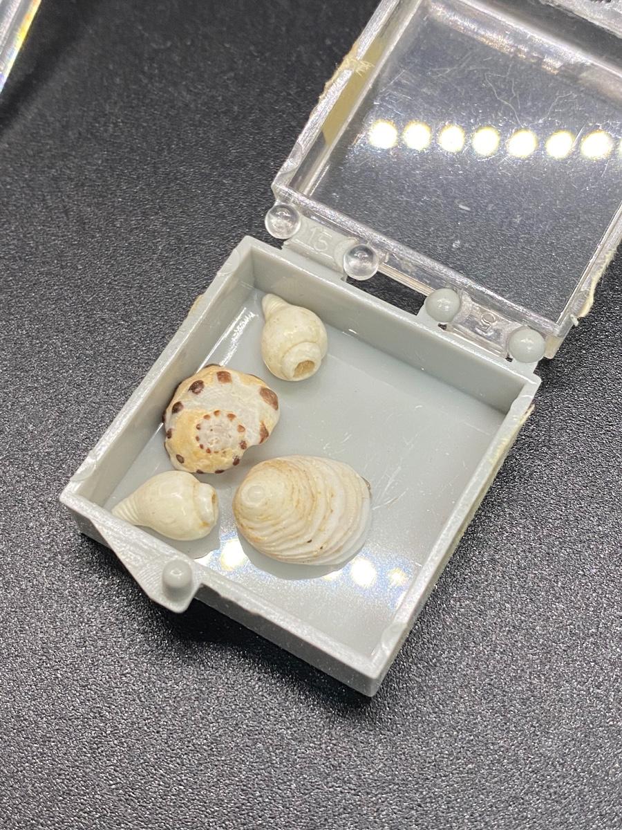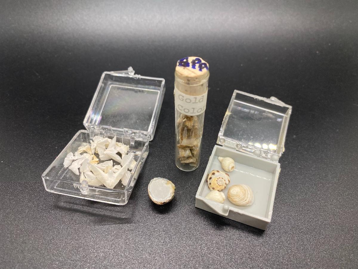 Natural mini collection. A tiny geode half, a couple seashells, a vile of gold ore, and a small box of unknown. The unknown items look like fossiled bones or something, they are neat, but I do not know what they are. The geode piece is real and does have a sparkle to it when turned in the light in spots, it is the smallest I have ever seen at about 1/2".