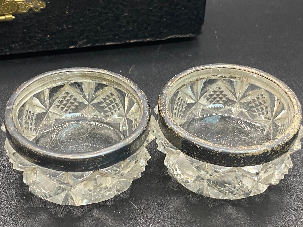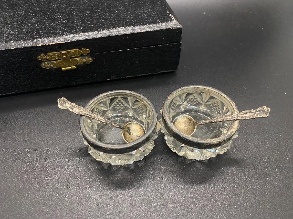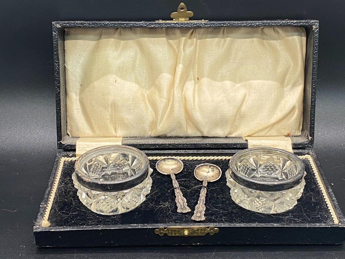 Vintage Antique Salt Cellar Set. Sterling Silver Edge & Spoons. Comes in original lidded box. Spoons are marked sterling, the edge of salt cellar is hallmarked sterling. Crystal is in good condition, did not see any chips.