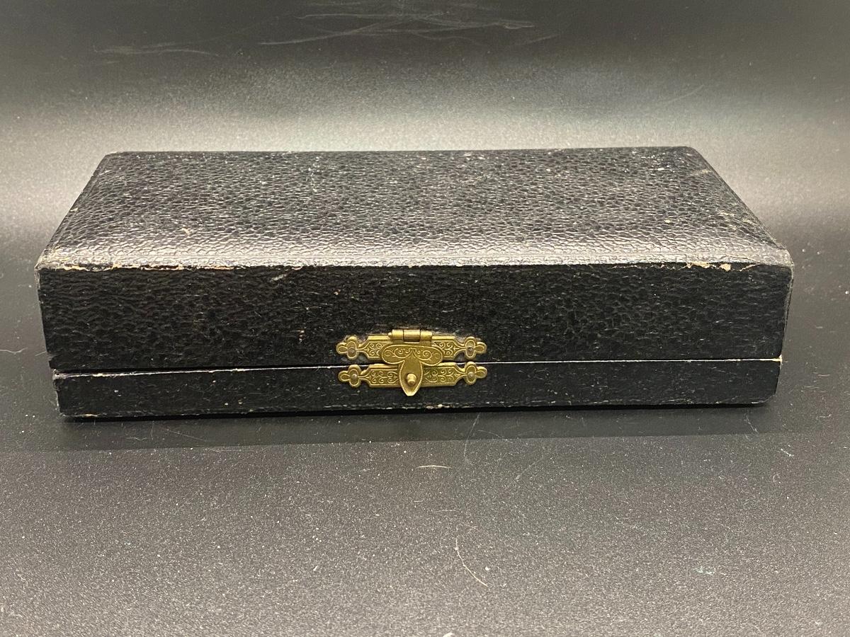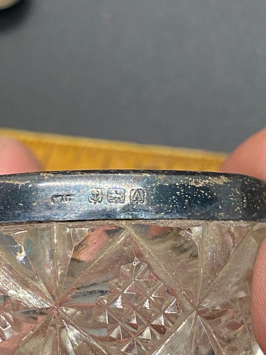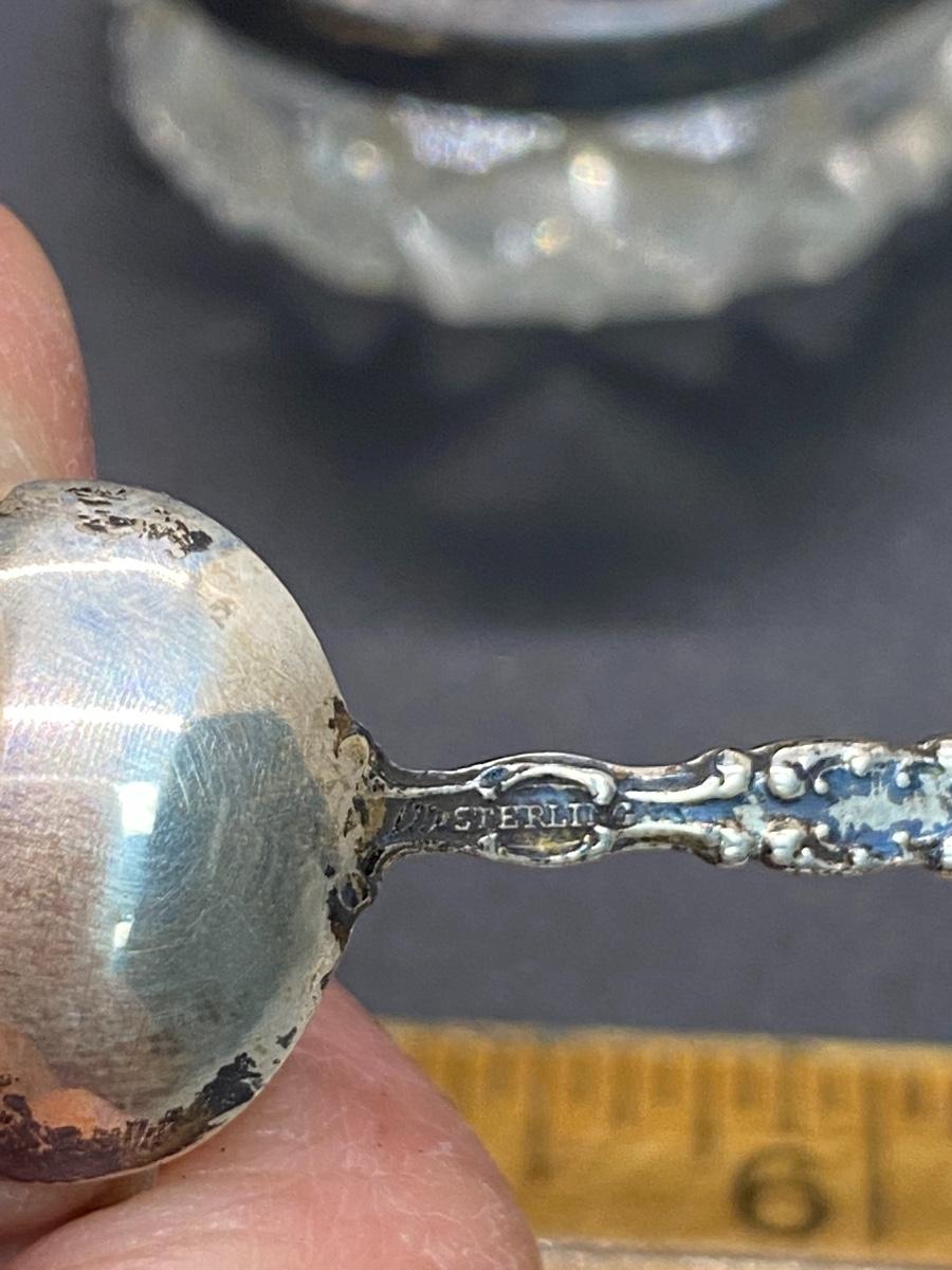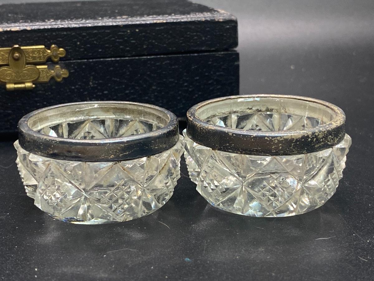Vintage Antique Salt Cellar Set. Sterling Silver Edge & Spoons. Comes in original lidded box. Spoons are marked sterling, the edge of salt cellar is hallmarked sterling. Crystal is in good condition, did not see any chips.