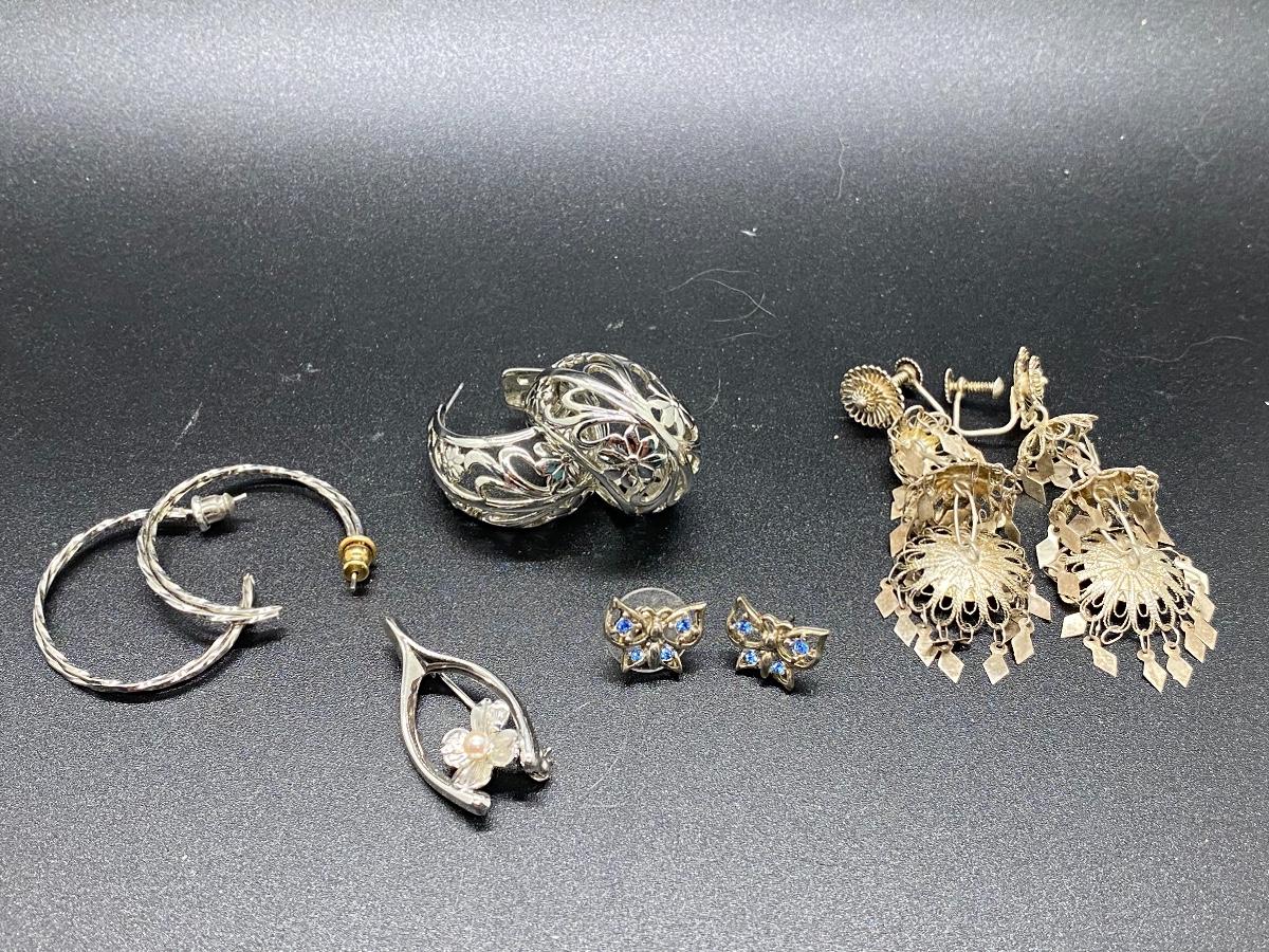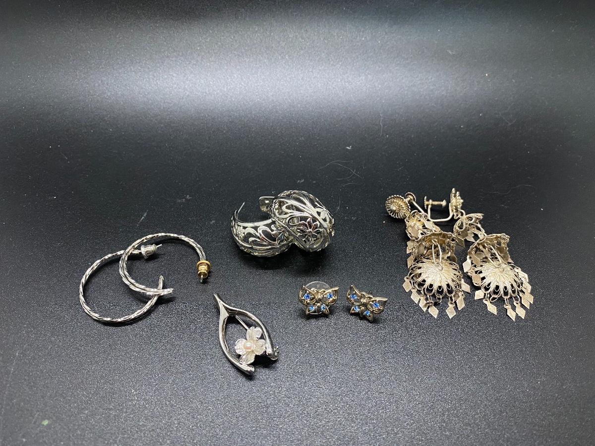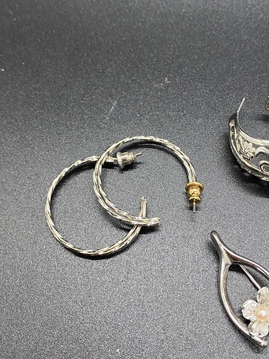 Silver Tone Earrings with a Sterling Silver Wishbone Pin Brooch. Wishbone is marked. Earrings are for pierced ears except one pair is screwback.
