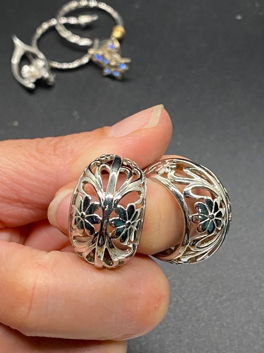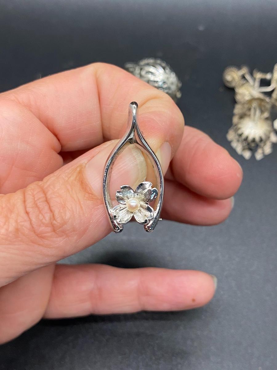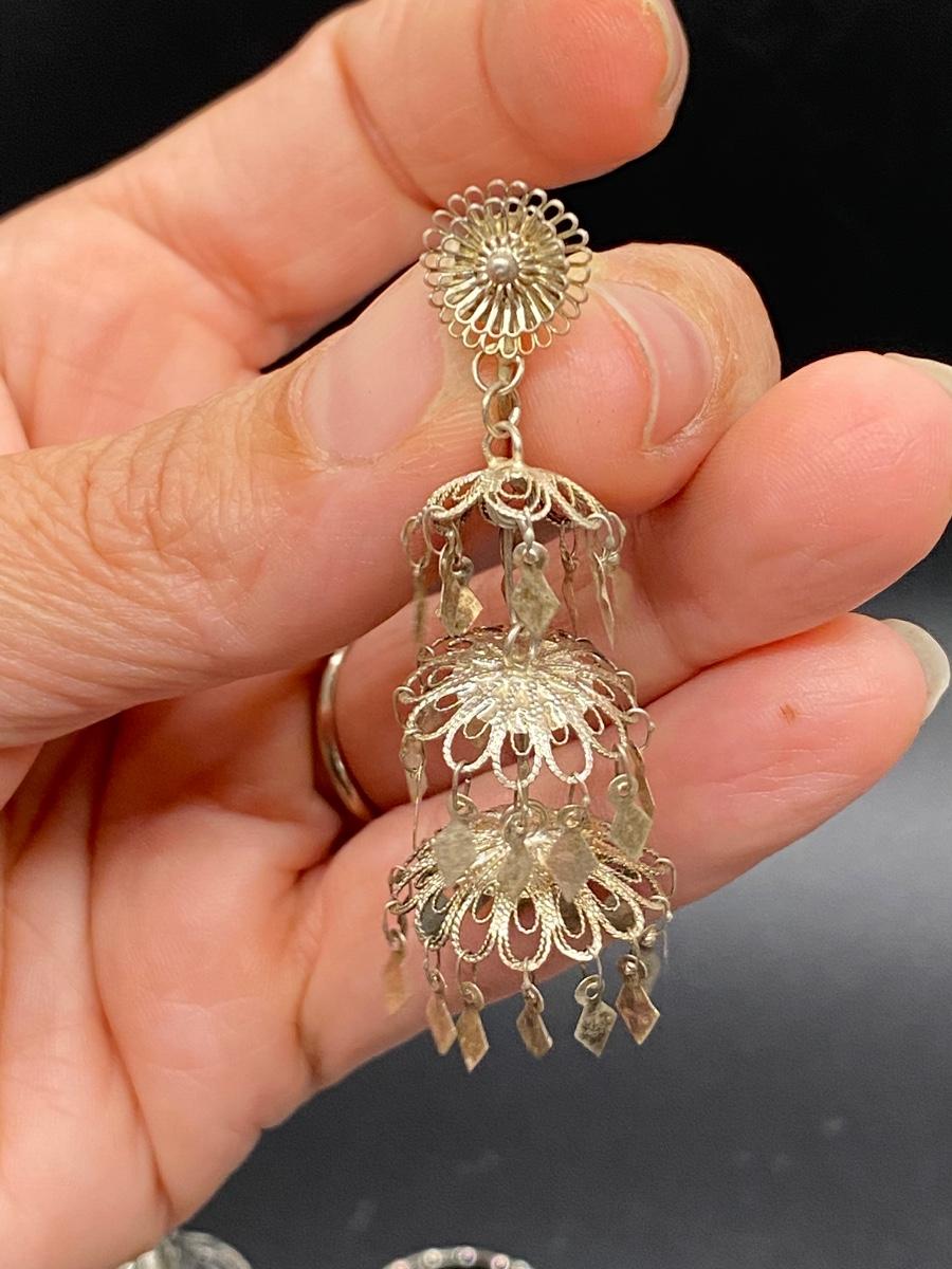 Silver Tone Earrings with a Sterling Silver Wishbone Pin Brooch. Wishbone is marked. Earrings are for pierced ears except one pair is screwback.
