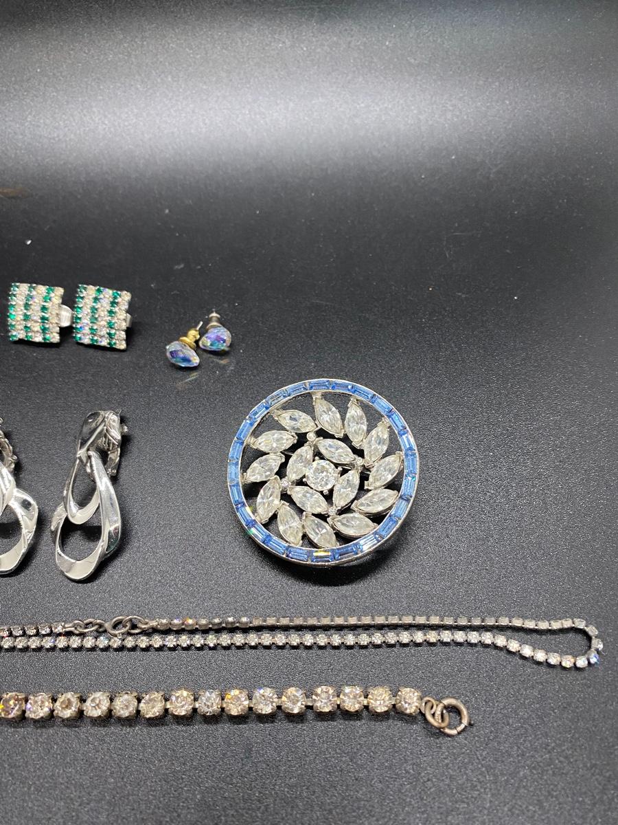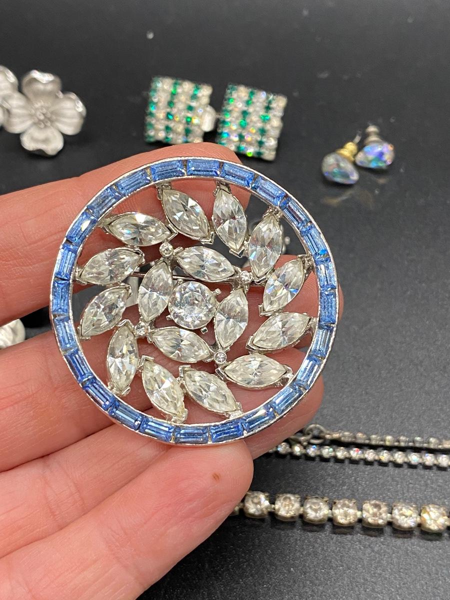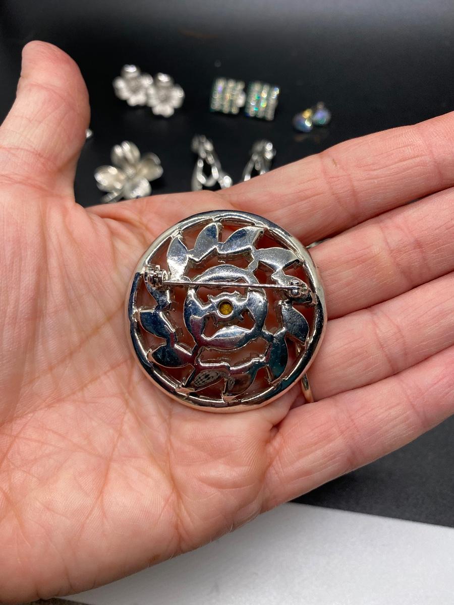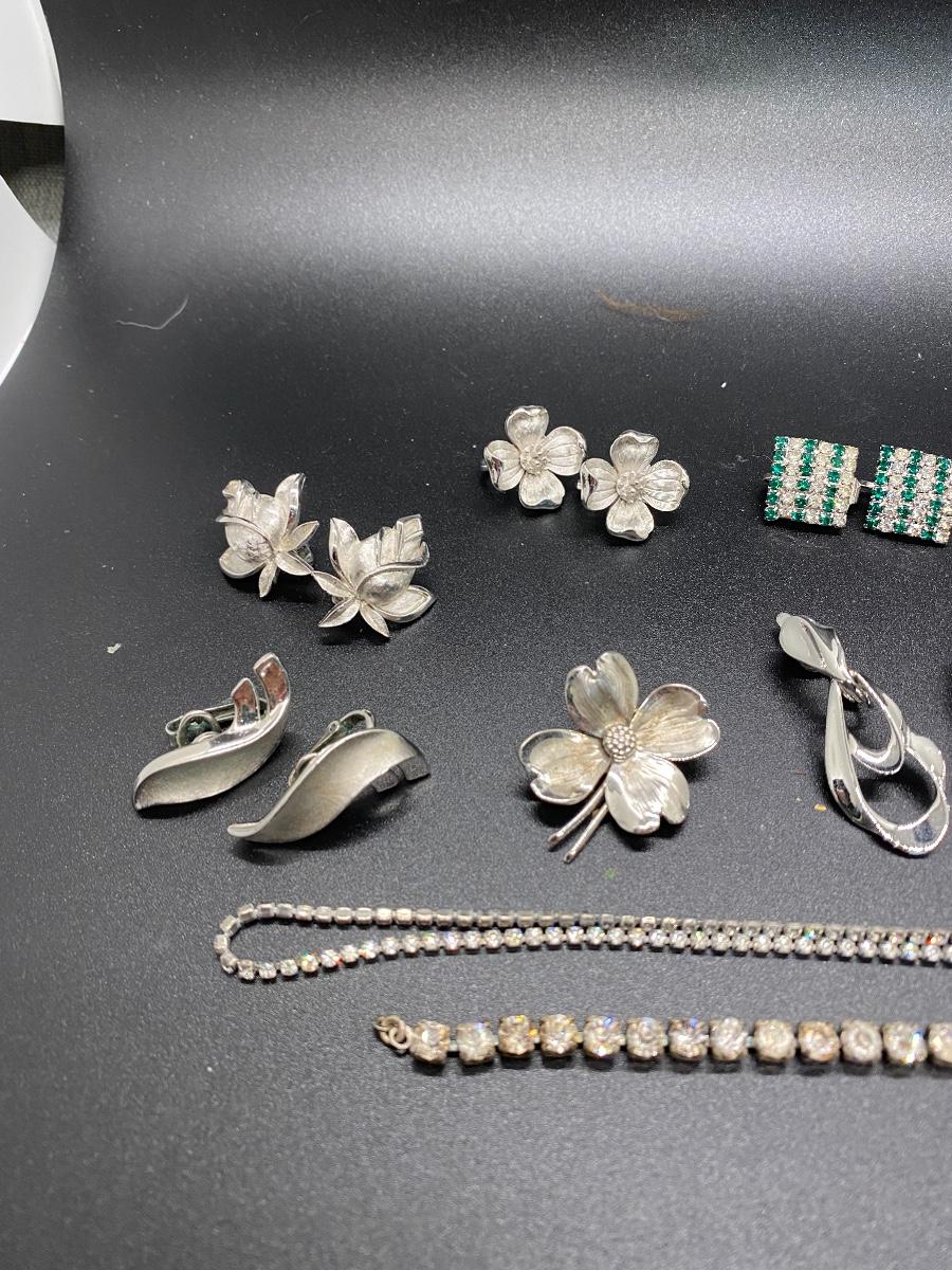 Vintage Silver Tone Jewelry Lot. Includes Crown Trifari clip earrings, rhinestone necklace and bracelet, medallion brooch.