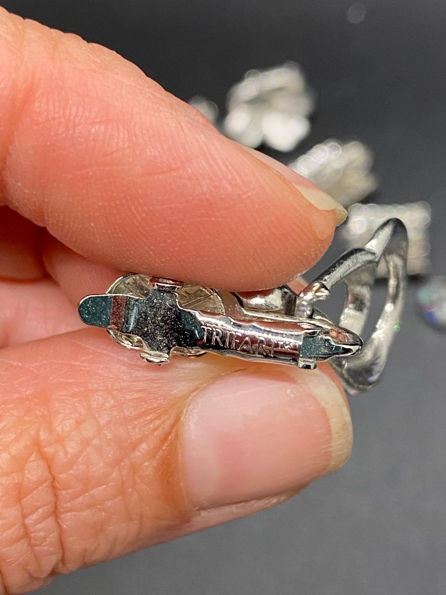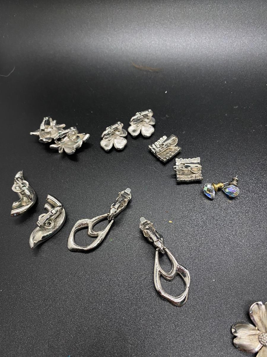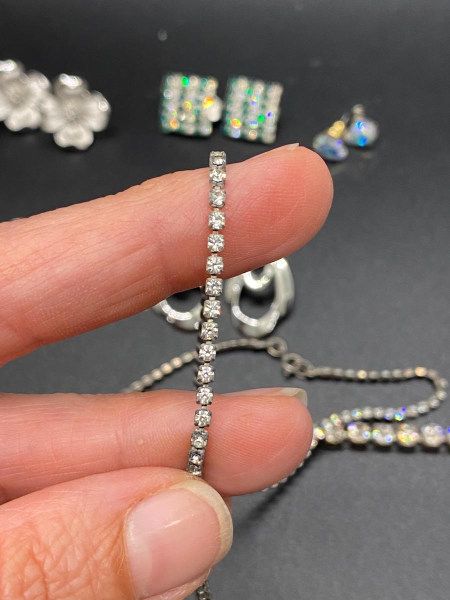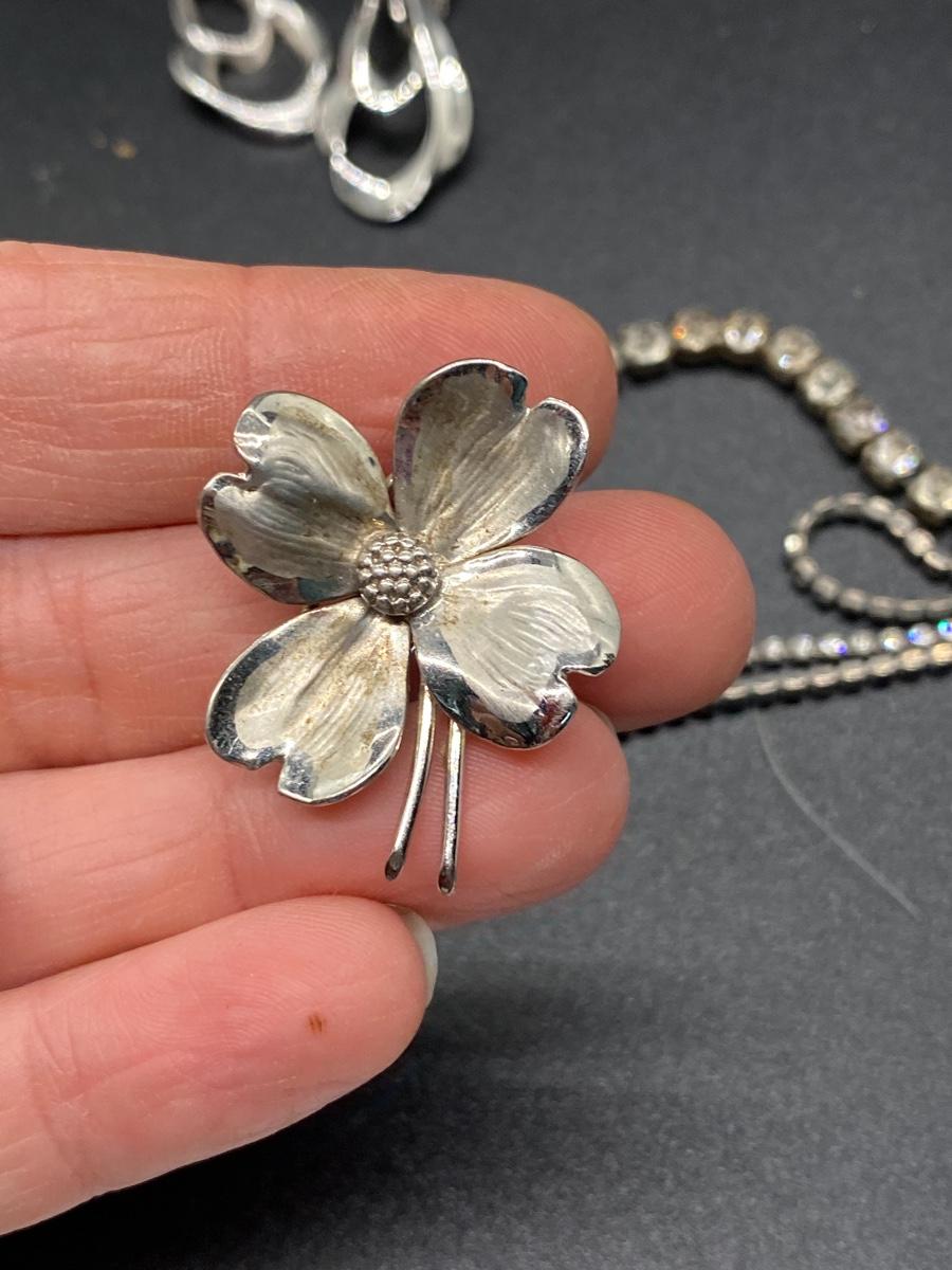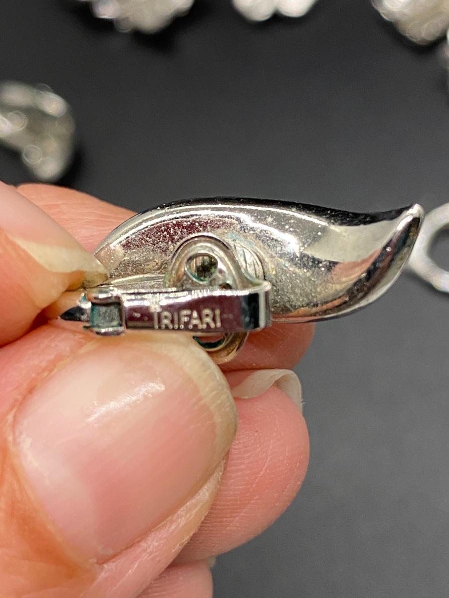 Vintage Silver Tone Jewelry Lot. Includes Crown Trifari clip earrings, rhinestone necklace and bracelet, medallion brooch.