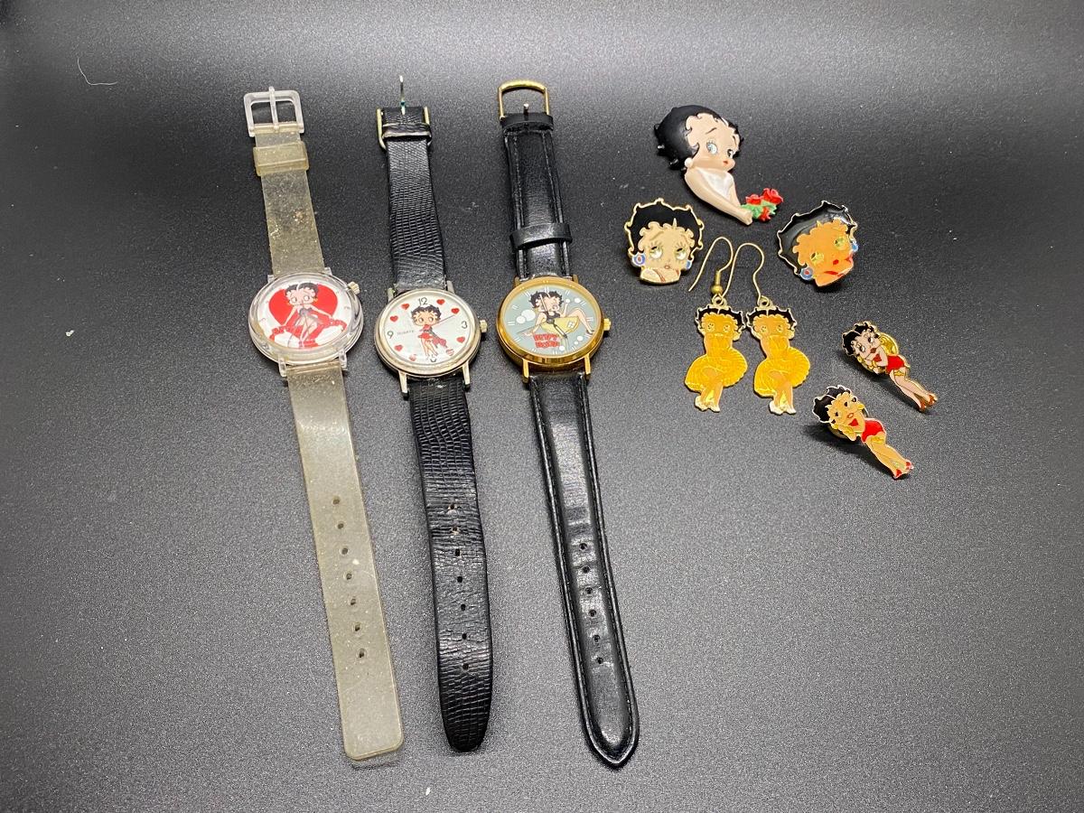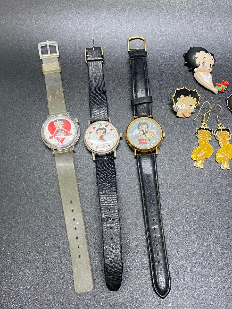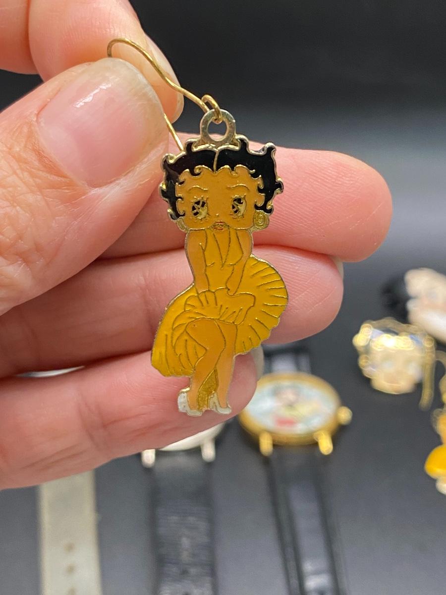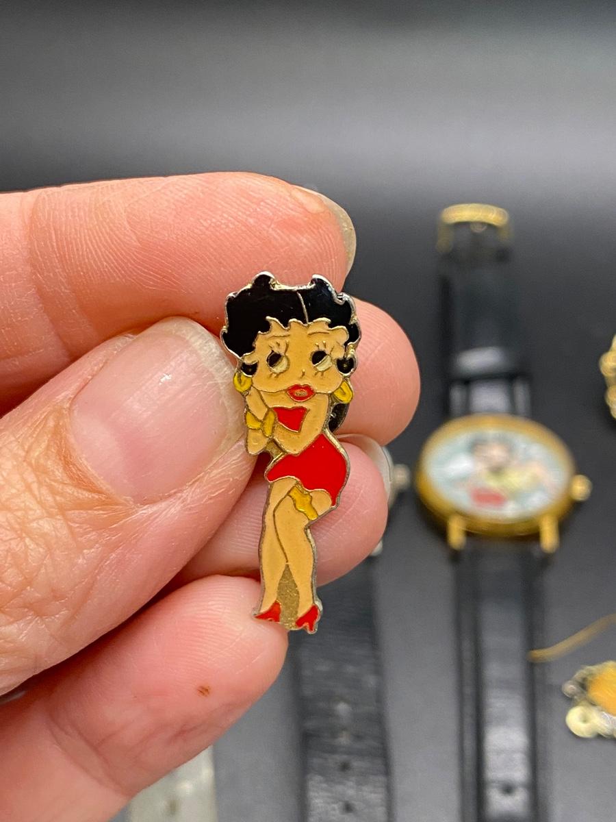 Vintage Retro Betty Boop Lot that includes watches, pins, and ear rings. There's no significant cosmetic damage to any of the pieces, except one of the pins is missing the metal backside. More details in the pictures above.