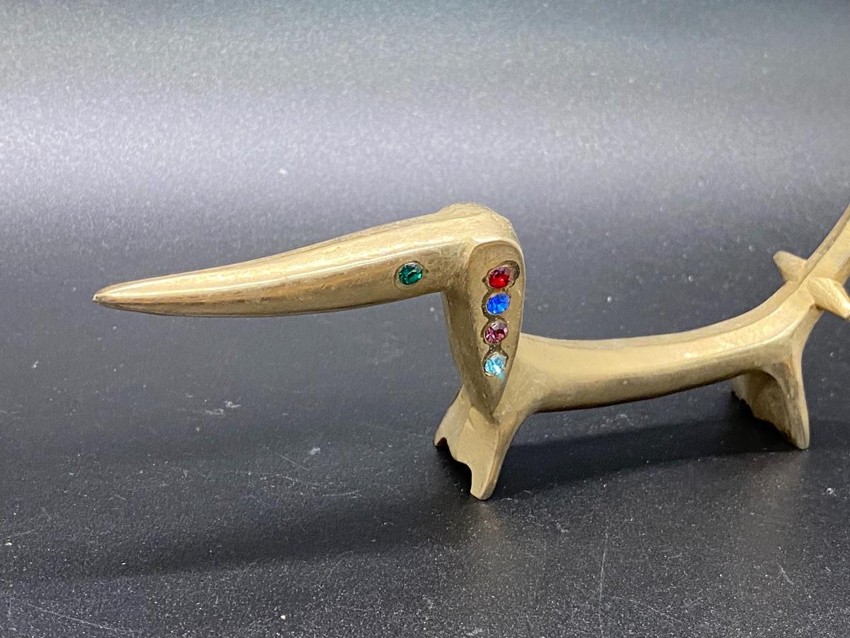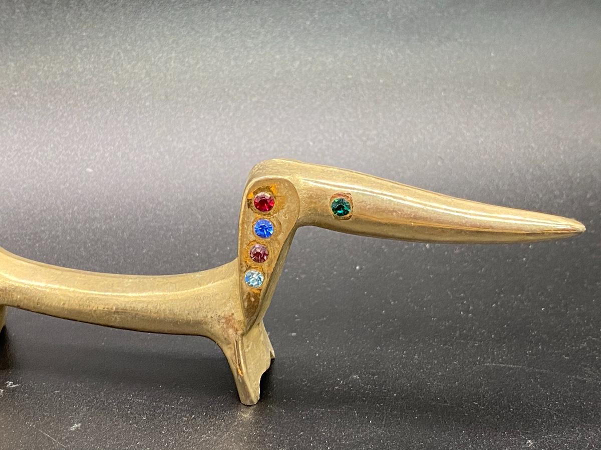 Small Brass Sculpture of Dachshund with Colored Gems, there no significant damage to the piece and is in good condition. Refer to the photos above for more details and sizing.