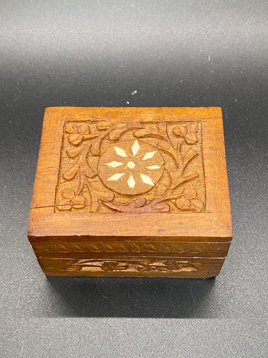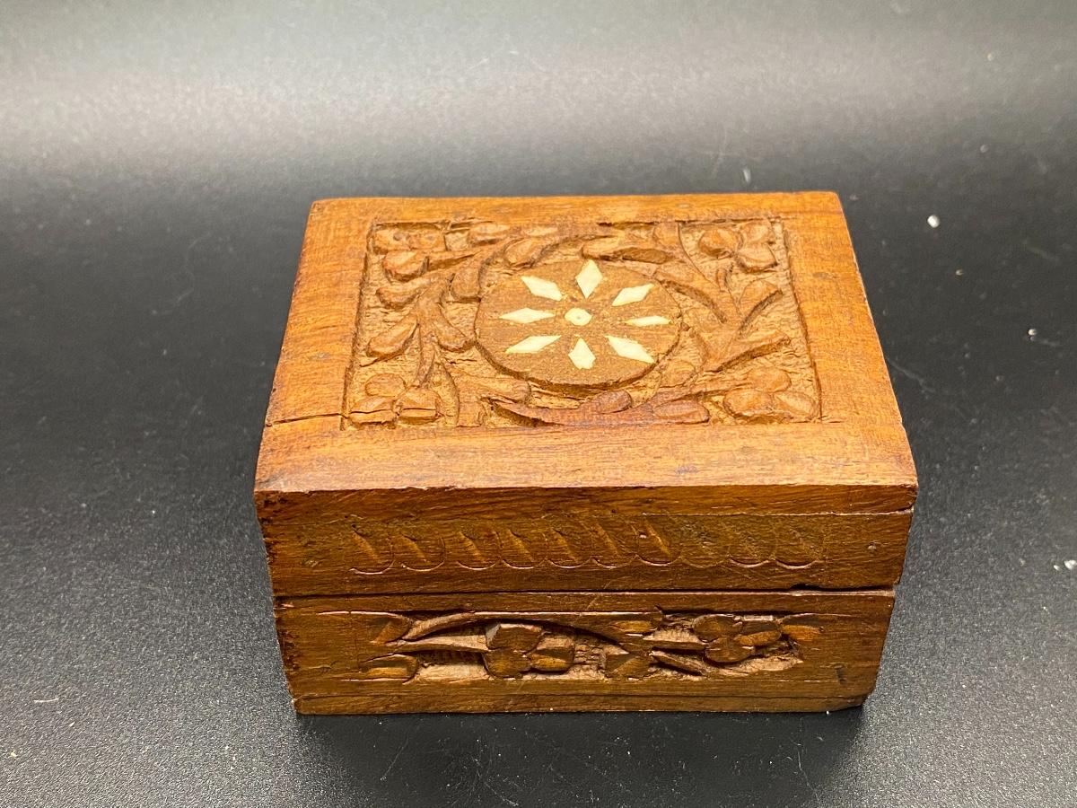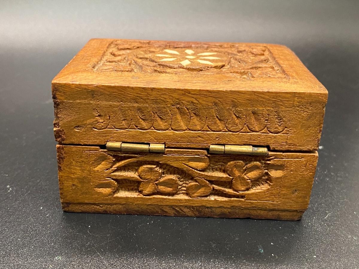 Small Carved Wood Trinket Jewelry Box. Good condition. About 3" size.