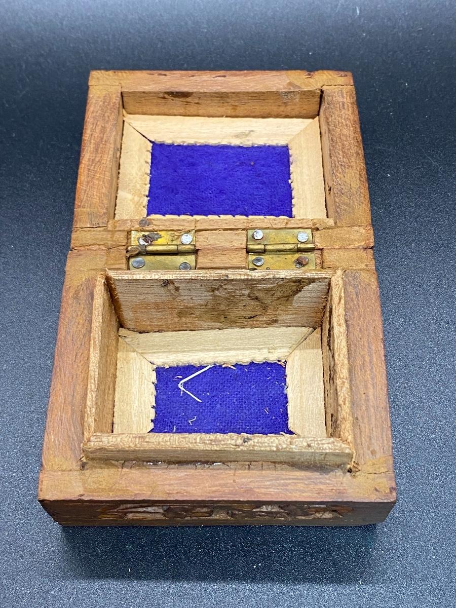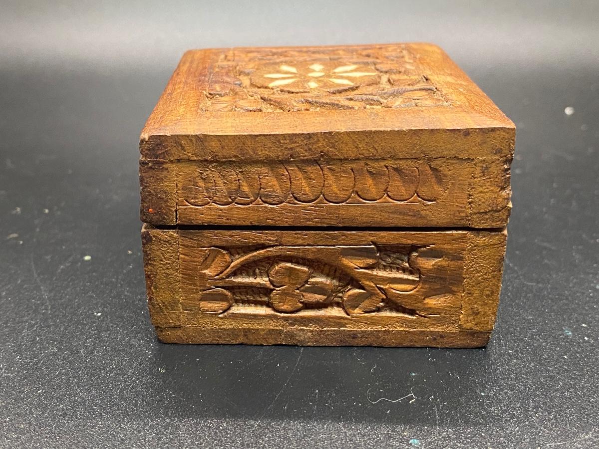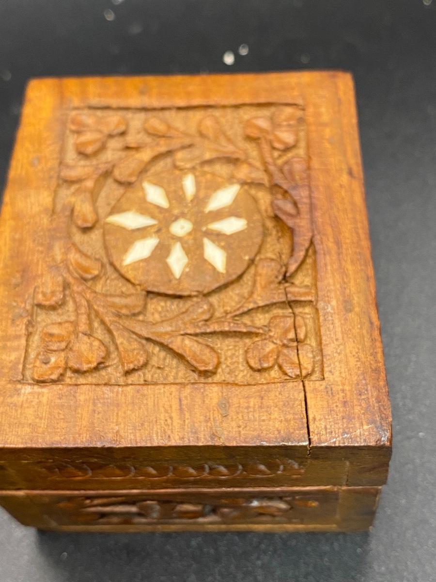 Small Carved Wood Trinket Jewelry Box. Good condition. About 3" size.