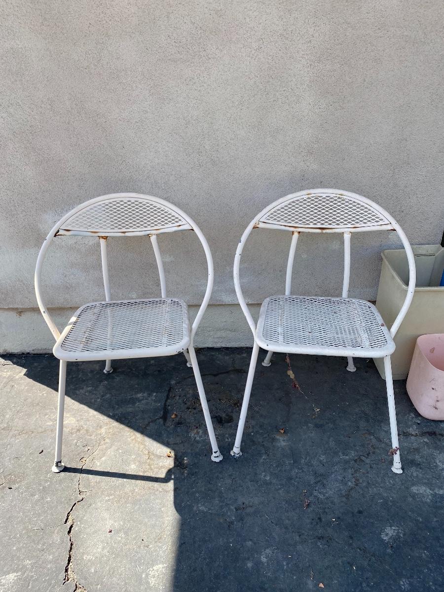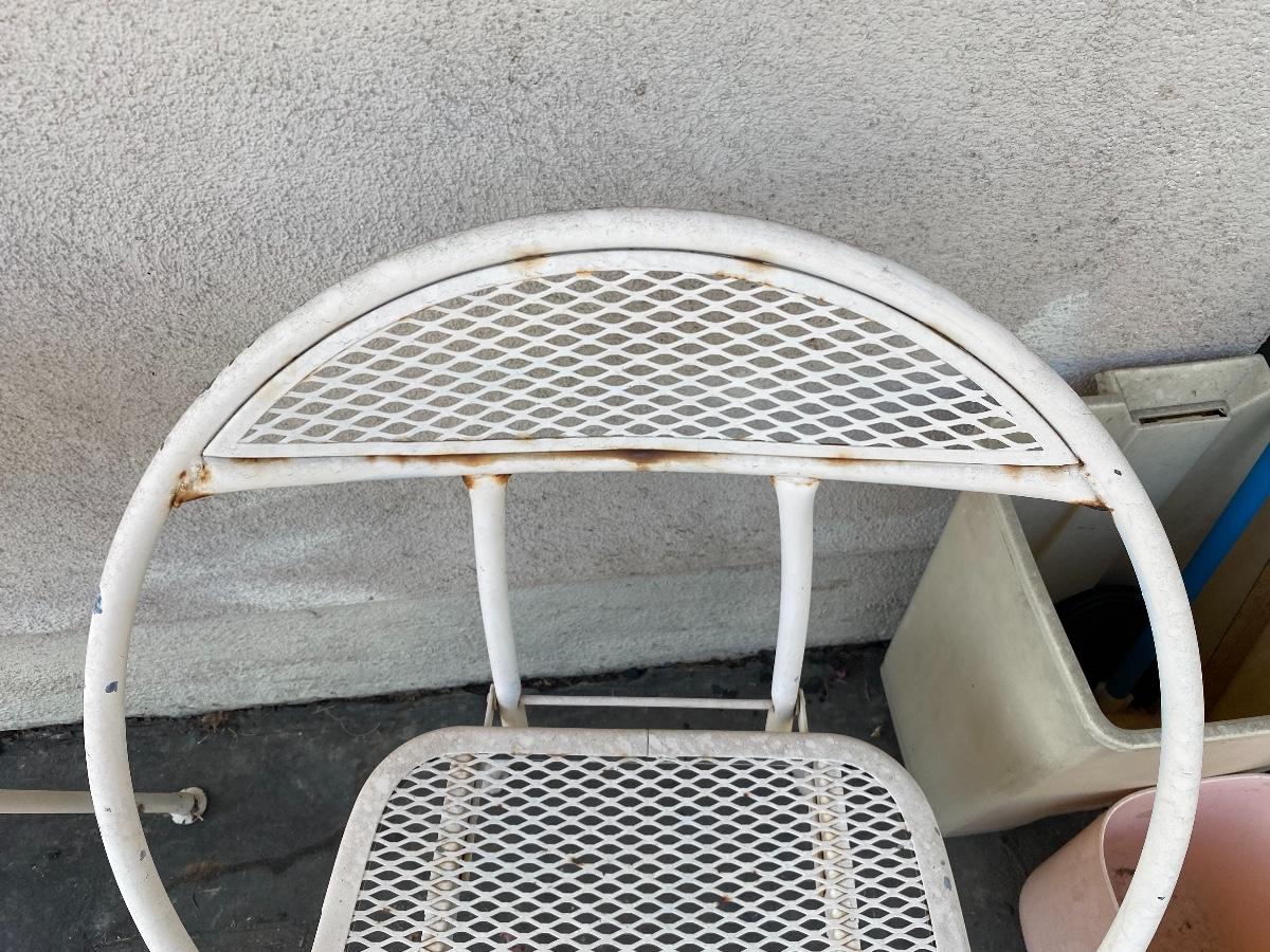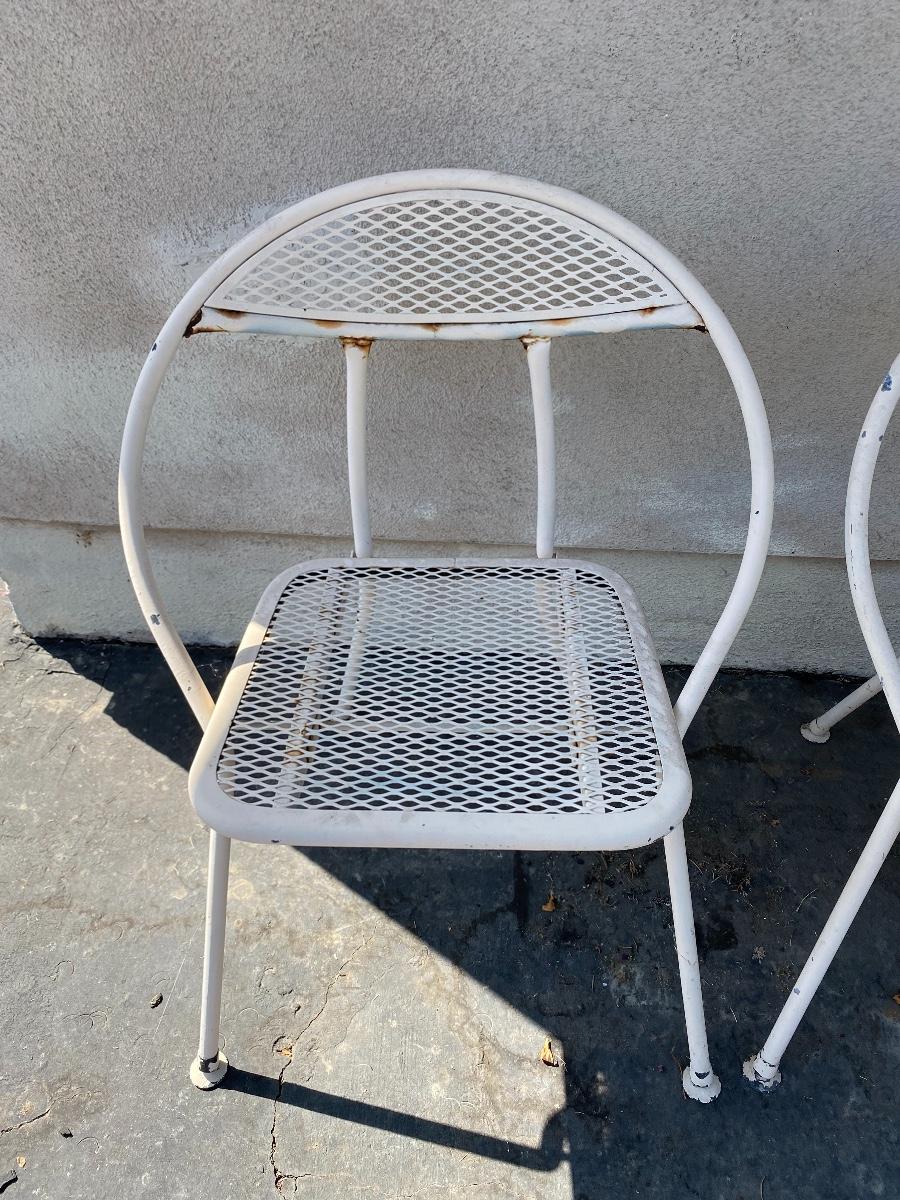 Pair of Vintage Painted Metal Round Back Folding Patio Chairs. In good weathered condition. There is some rust, would look great with fresh coat of paint. They look like they should fold up but couldn't get to budge, maybe a little WD40 would solve that.