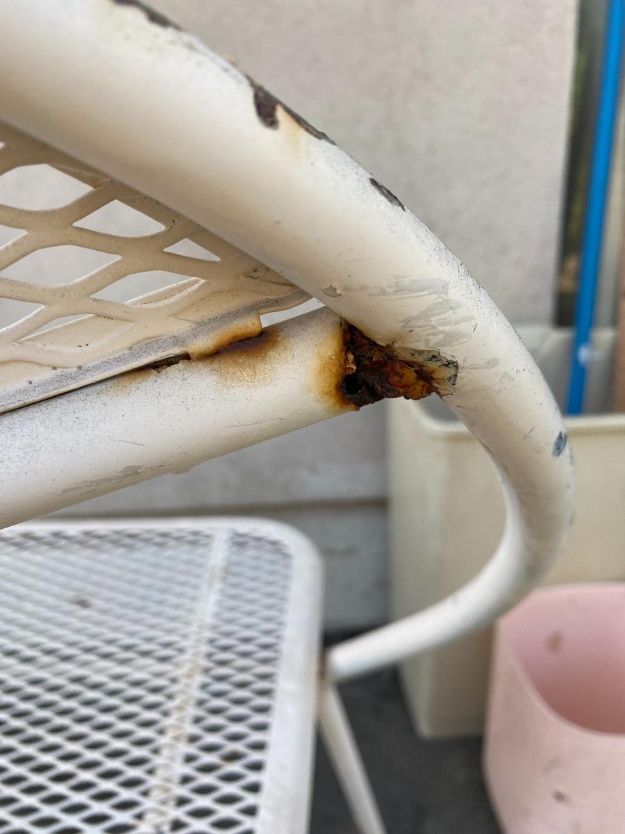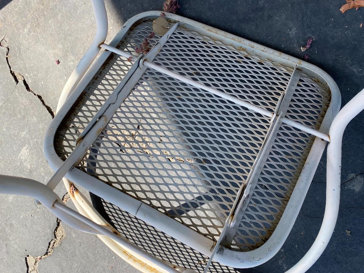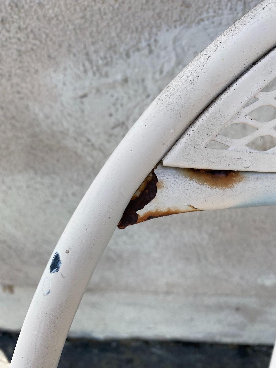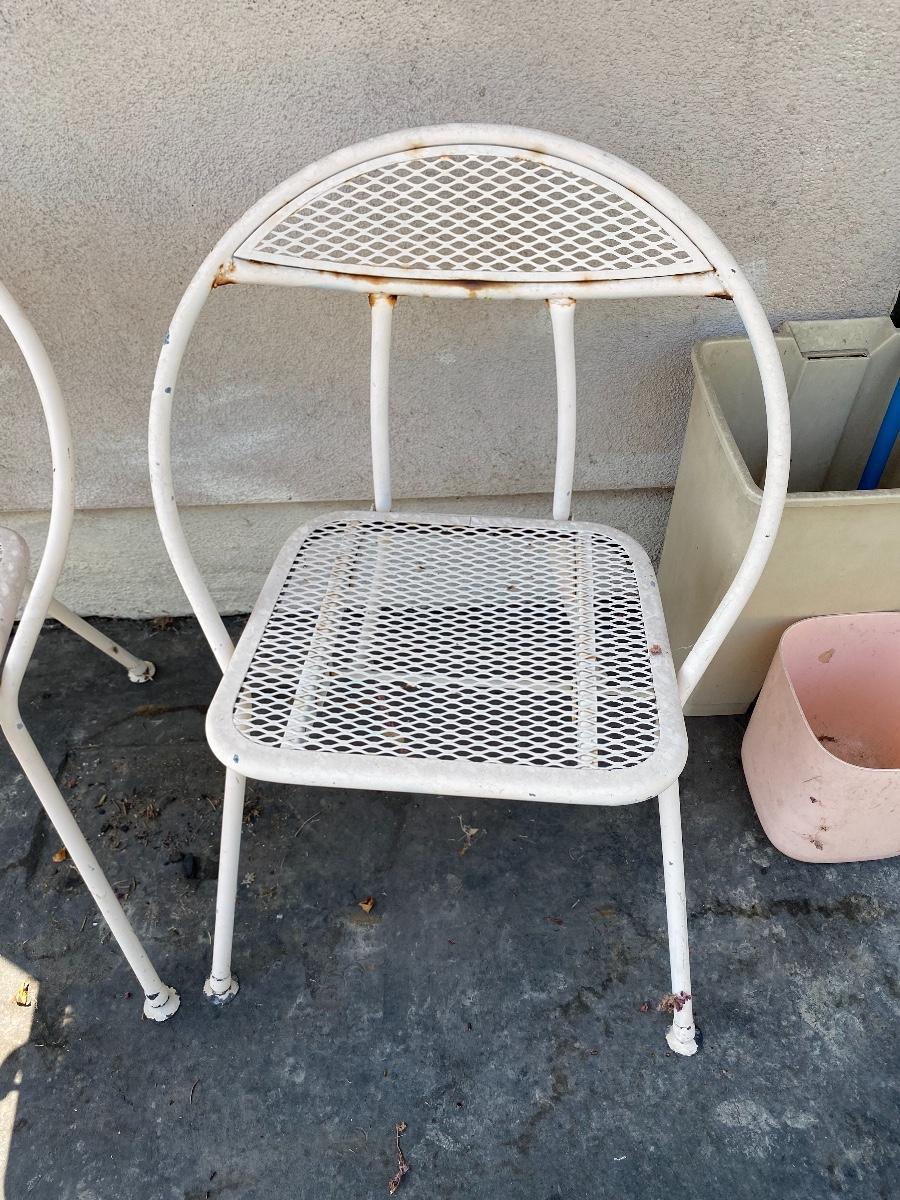 Pair of Vintage Painted Metal Round Back Folding Patio Chairs. In good weathered condition. There is some rust, would look great with fresh coat of paint. They look like they should fold up but couldn't get to budge, maybe a little WD40 would solve that.
