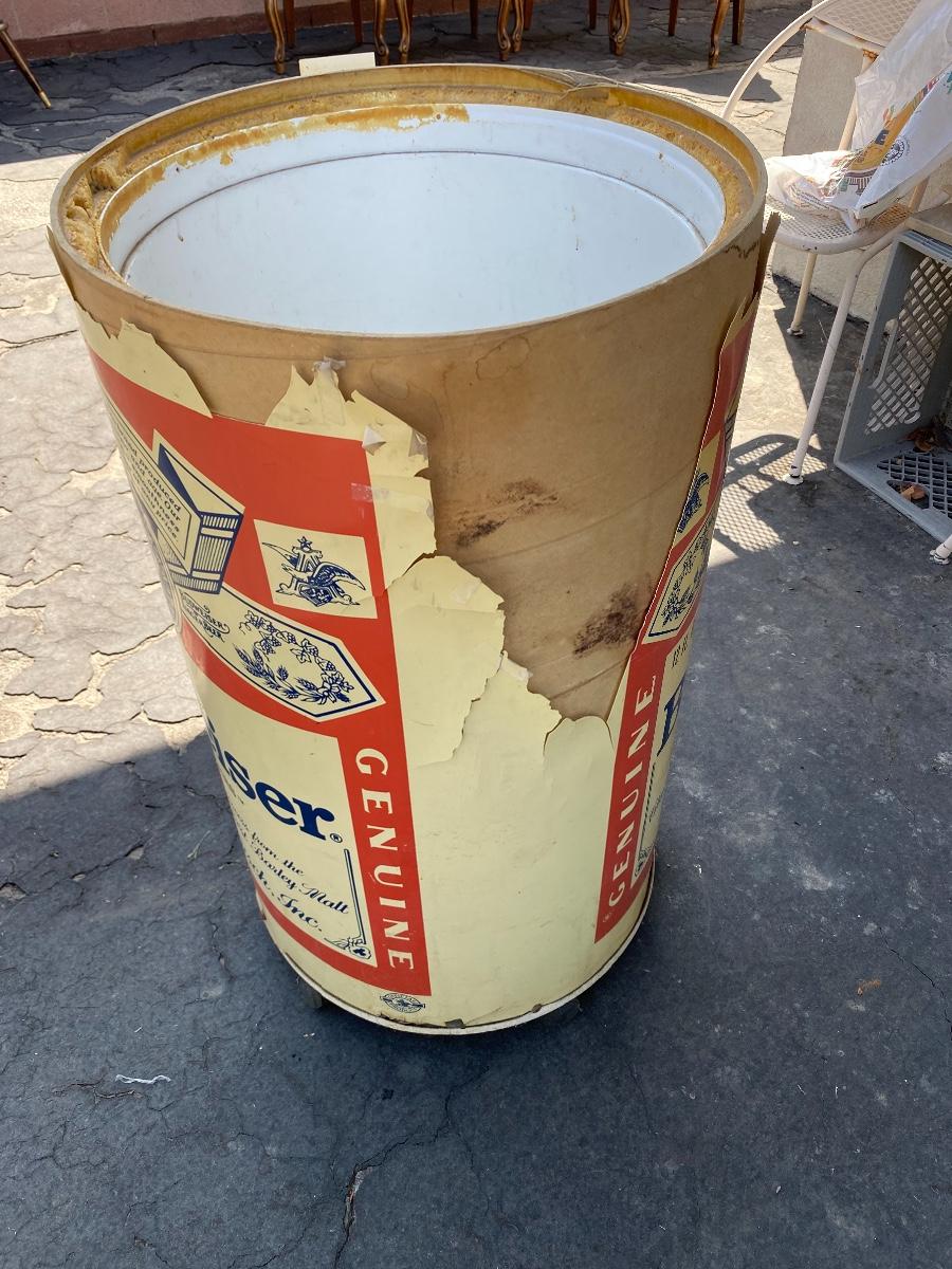 Vintage Budweiser Ice Chest Cooler Barrel Display Promo. Discolor and damage to the Budweiser plastic cover. Cooler part inside looks good other then dirty. Could be repurposed. Great for backyard parties. About 3' to 4' tall.
