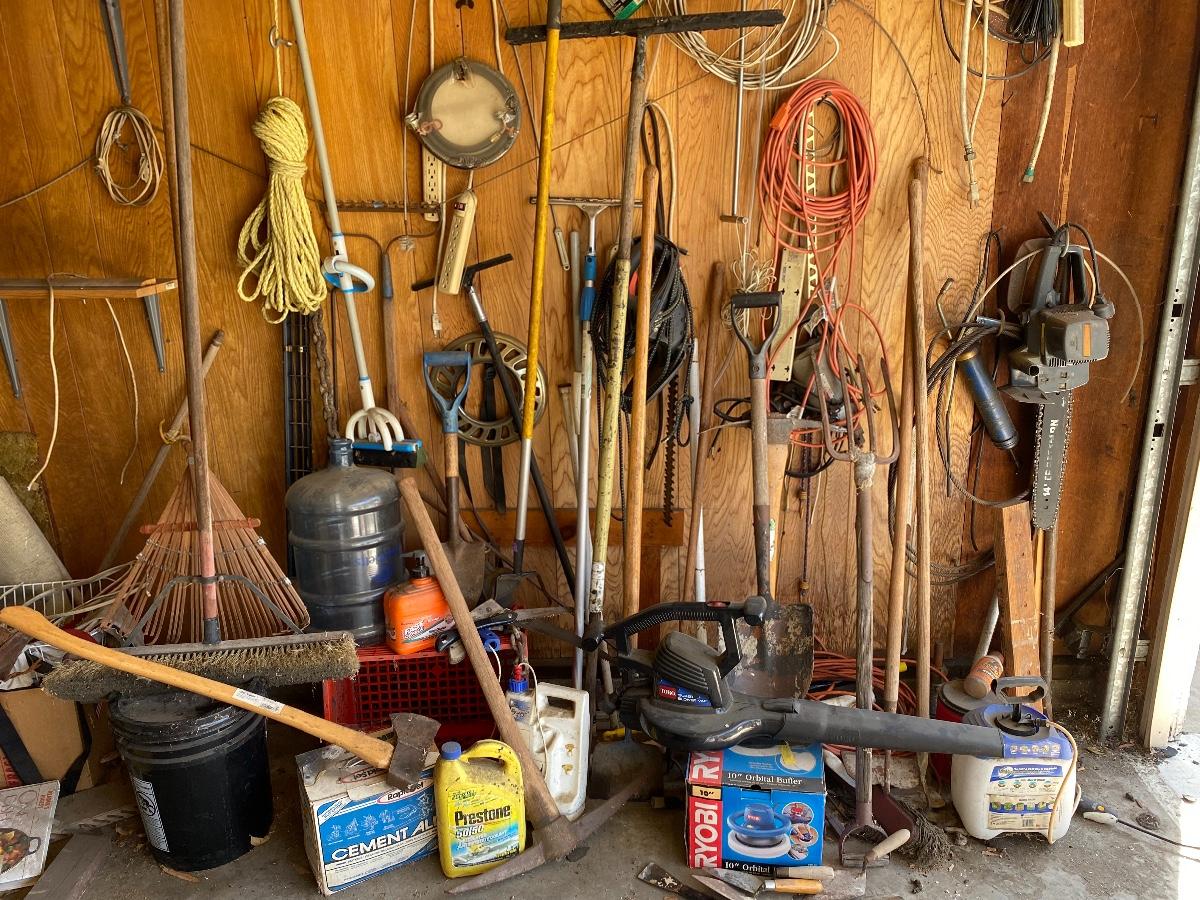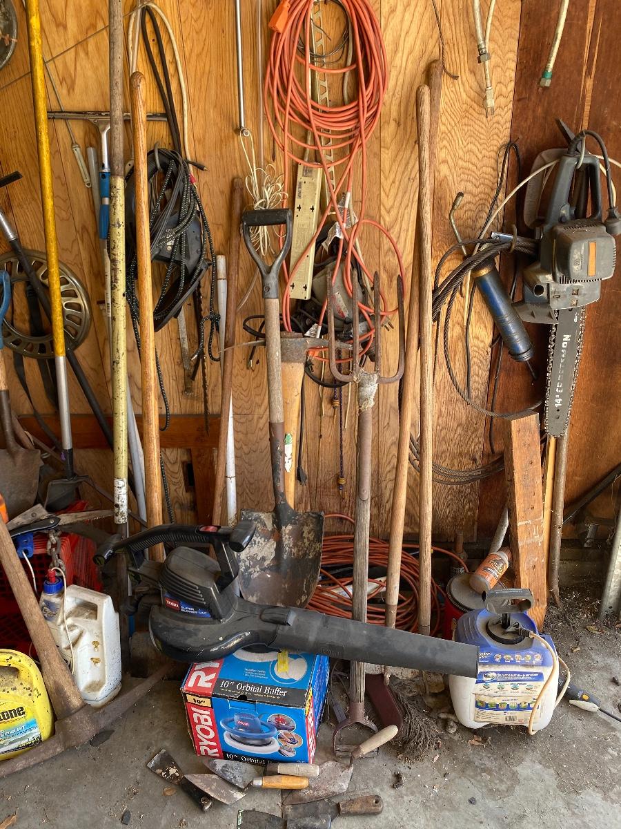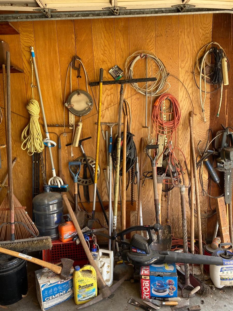 Garage Wall Tool Lot Hand Tools Garden Tools Electrical Cords. Everything in the photos included.