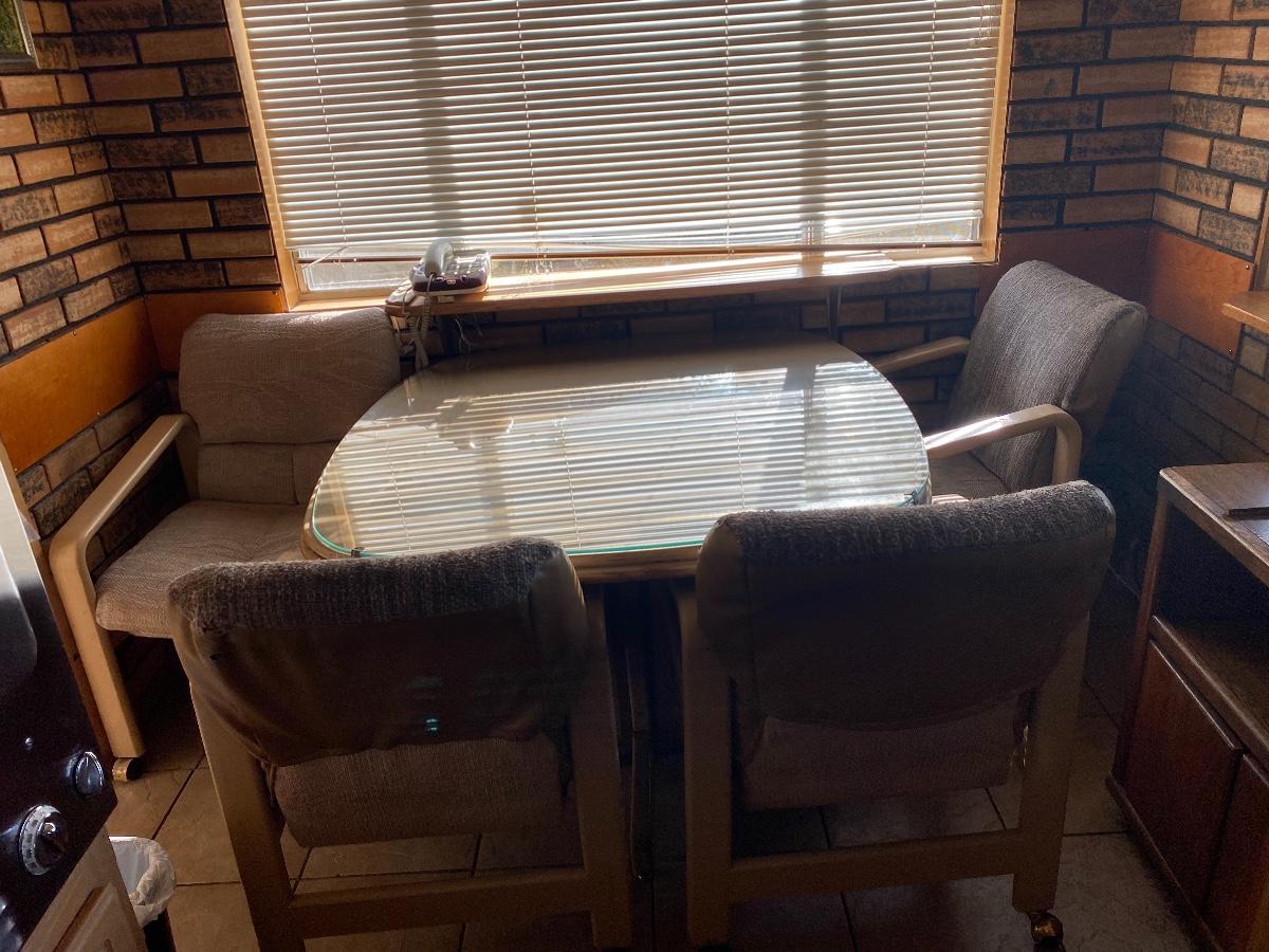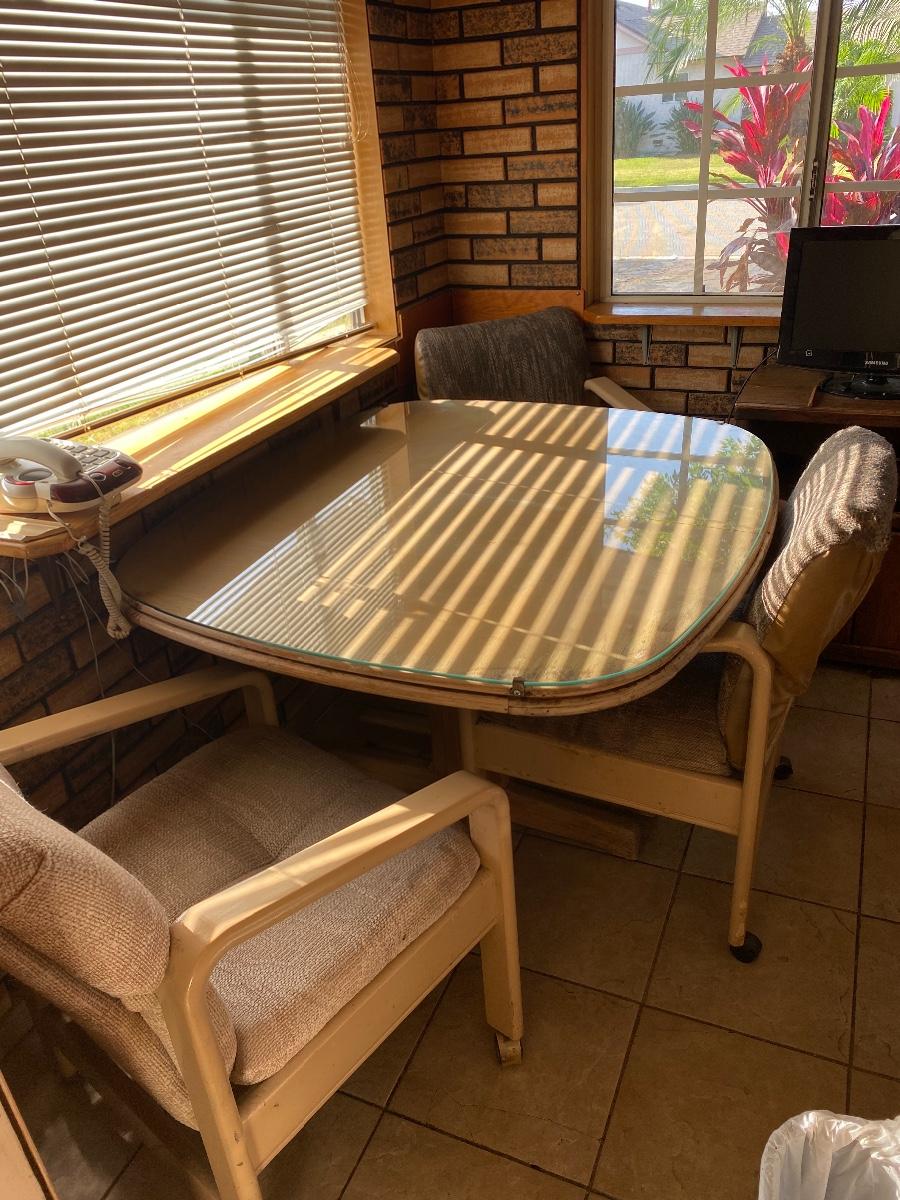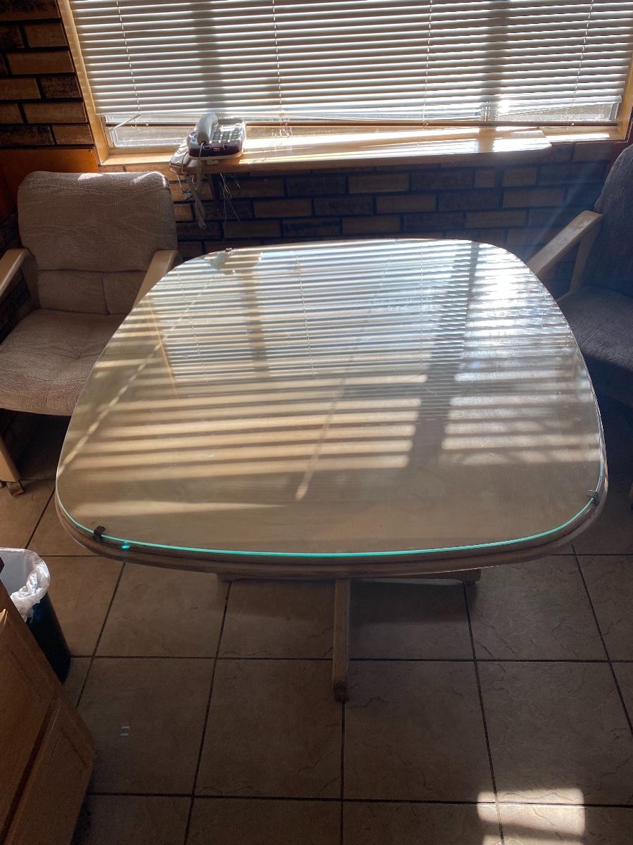 Light Wood Kitchenette Dining Table with Wheeled Chairs. Protective glass top included. In fair condition. Chairs need to be cleaned and wheels like to fall out. There is water damage to table surface.