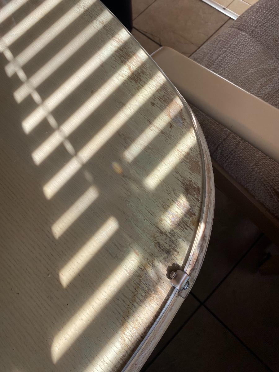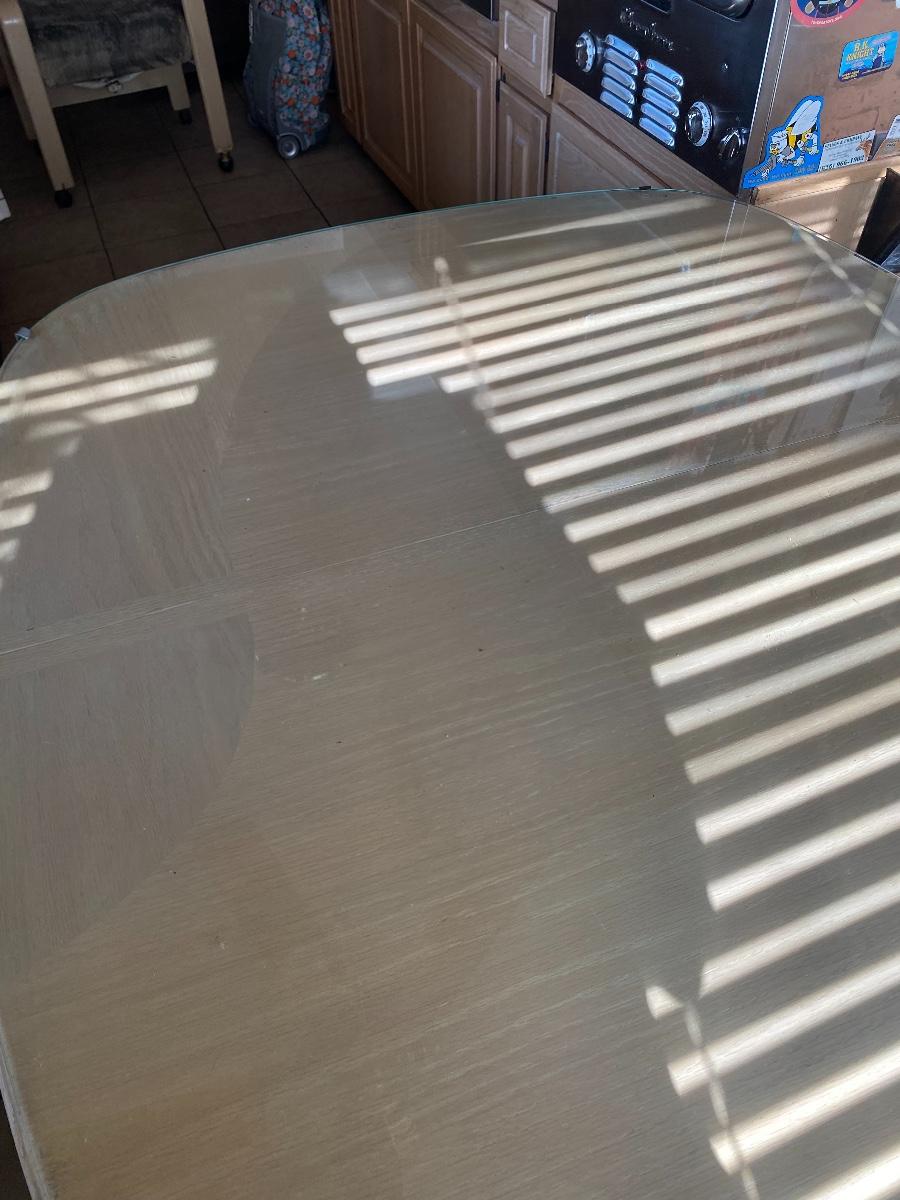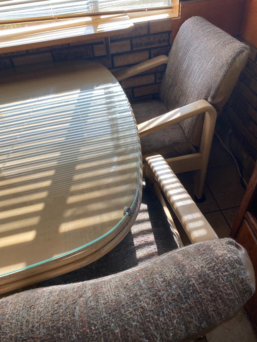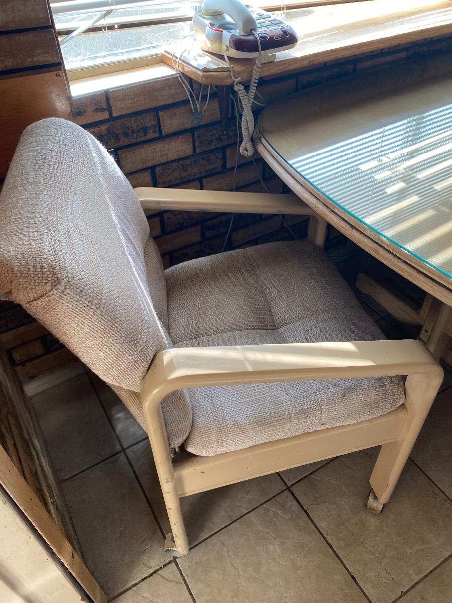 Light Wood Kitchenette Dining Table with Wheeled Chairs. Protective glass top included. In fair condition. Chairs need to be cleaned and wheels like to fall out. There is water damage to table surface.
