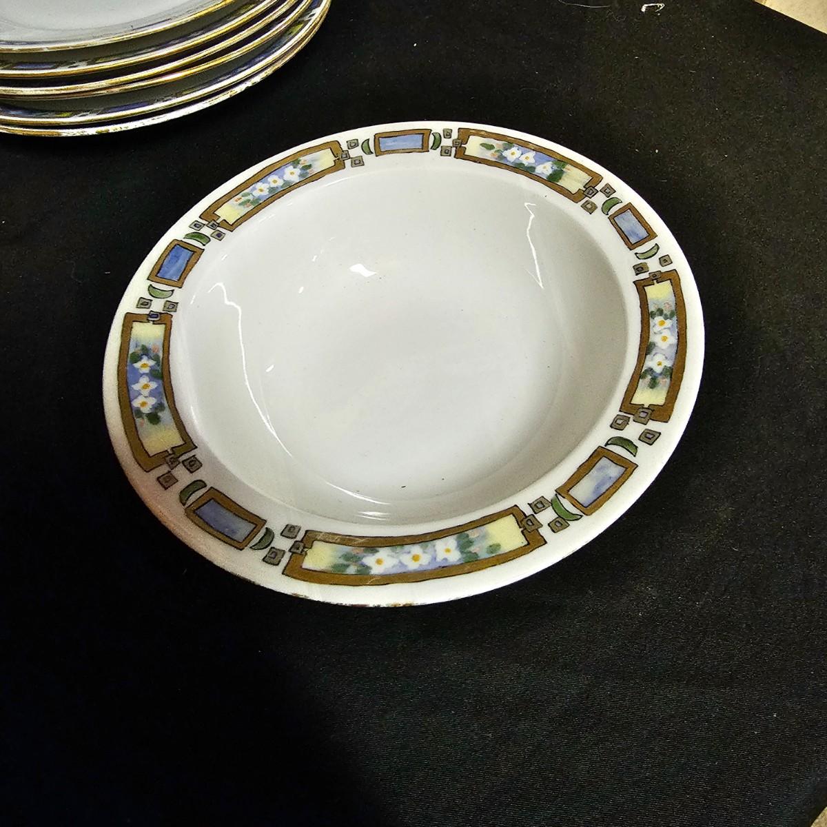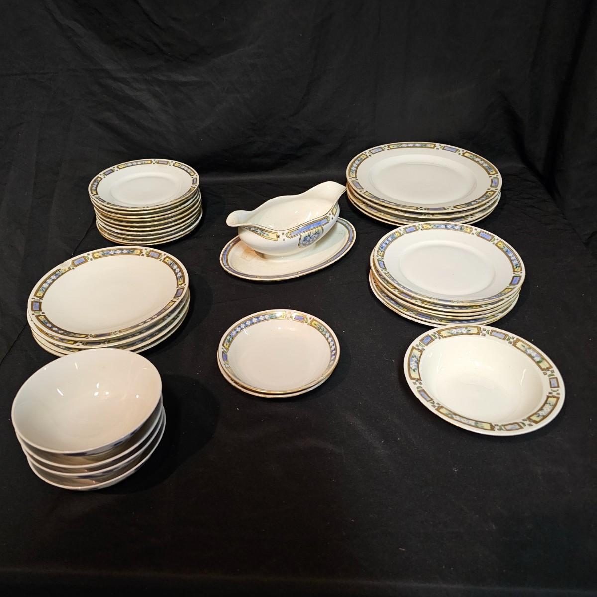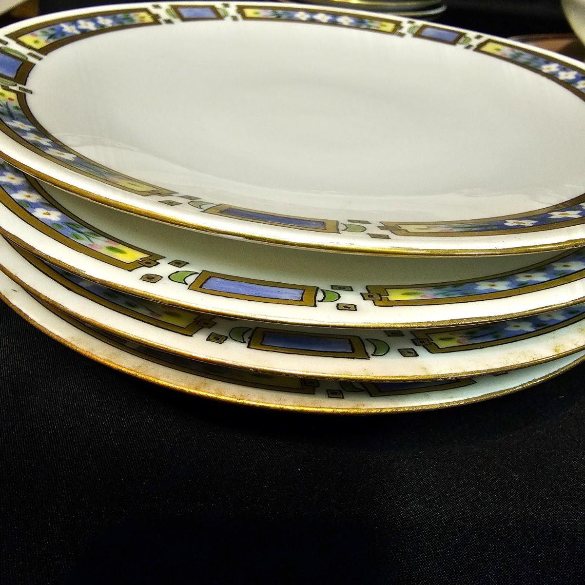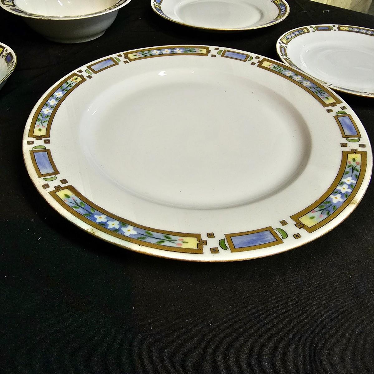 A small set of Bavarian china by H & Co. Four 10"dia dinner plates, four 7.25"dia salad plates, one chipped. Six 7.5"dia plates, one gravy boat, ten 6.5"dia plates, two 5.25" dia small bowls. Gold edging on some items is missing. Also includes four Toyo of Japan footed floral bowls, 4.5" dia. 32 pieces total. See photos for details. Local pickup only.