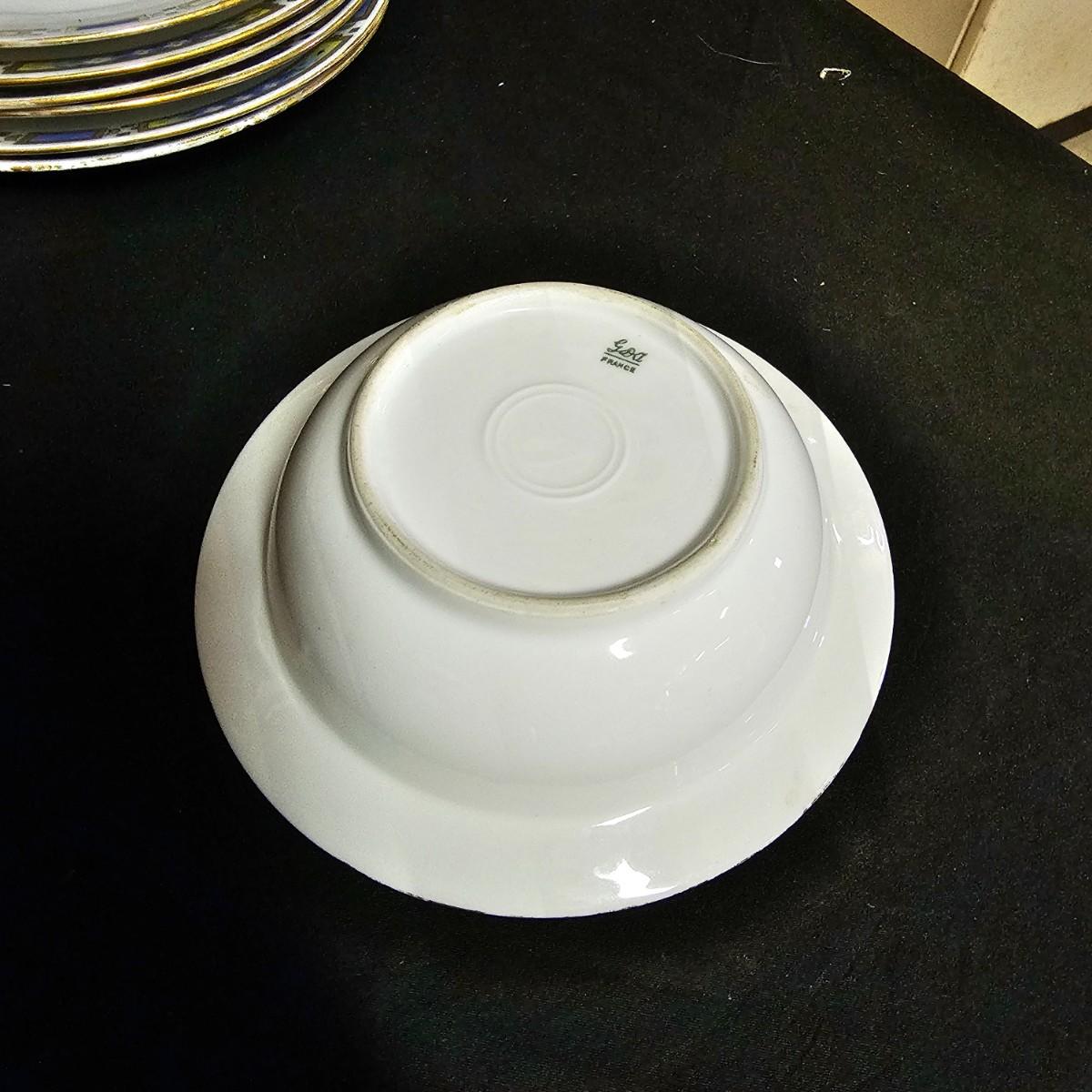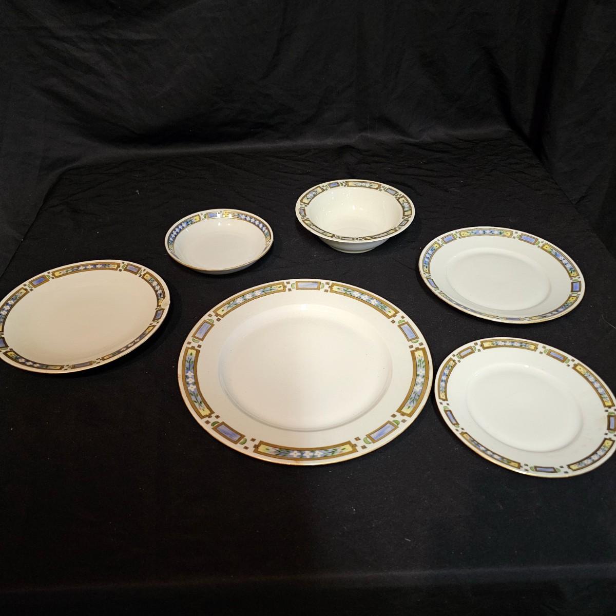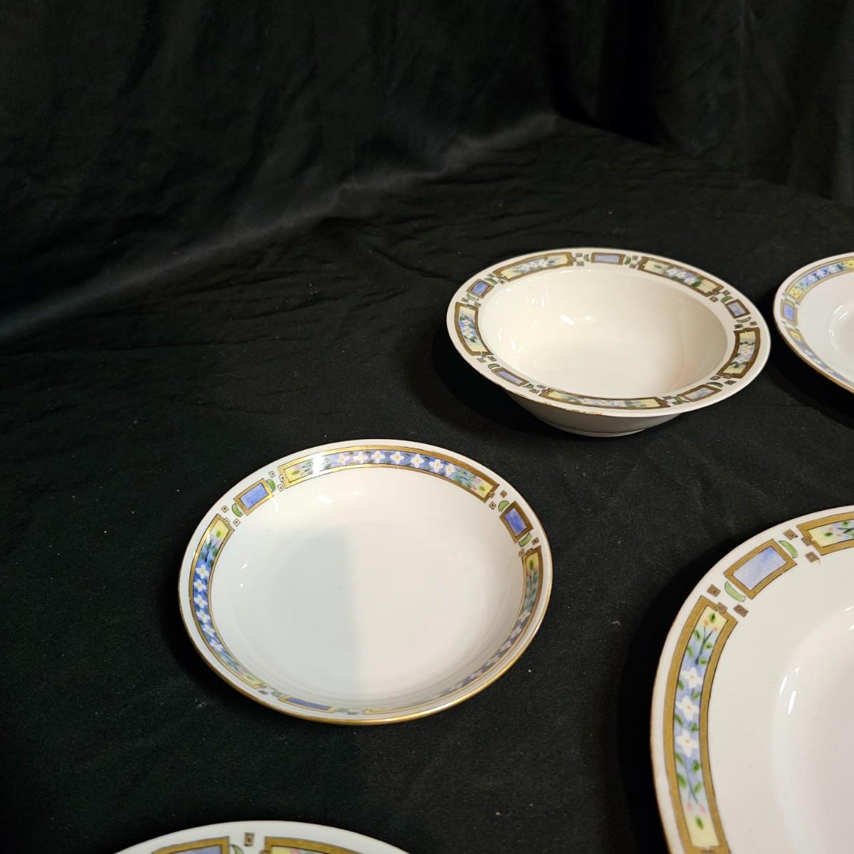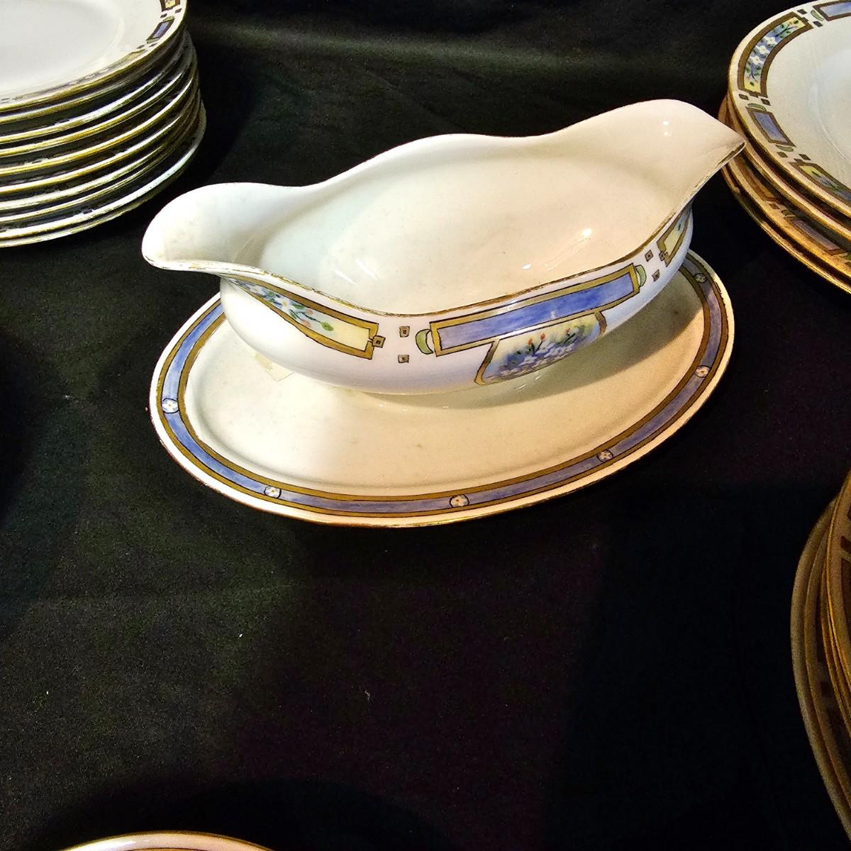A small set of Bavarian china by H & Co. Four 10"dia dinner plates, four 7.25"dia salad plates, one chipped. Six 7.5"dia plates, one gravy boat, ten 6.5"dia plates, two 5.25" dia small bowls. Gold edging on some items is missing. Also includes four Toyo of Japan footed floral bowls, 4.5" dia. 32 pieces total. See photos for details. Local pickup only.