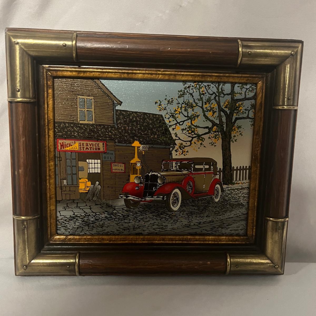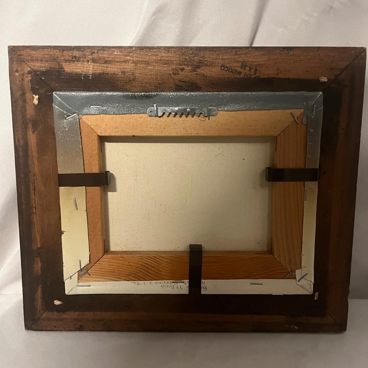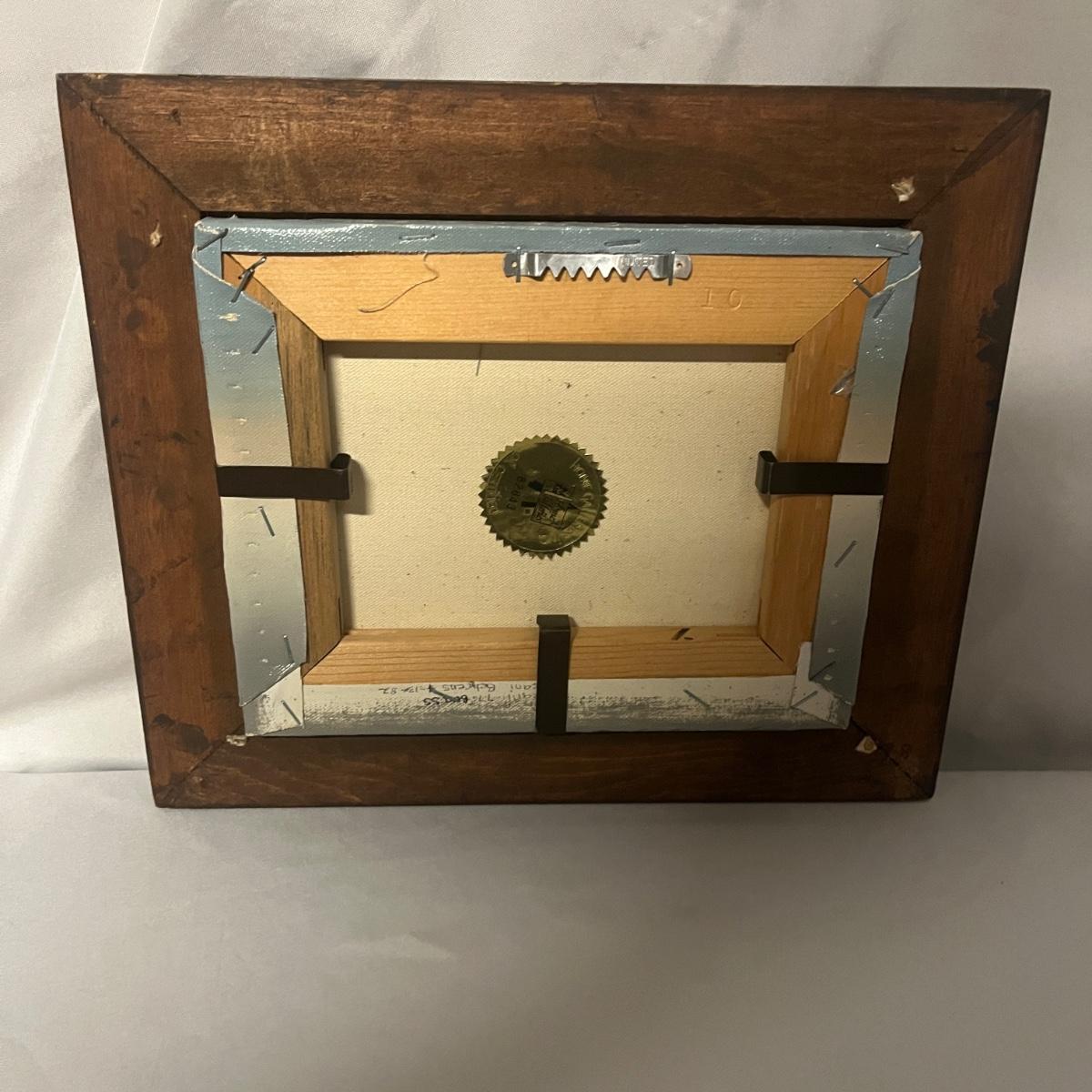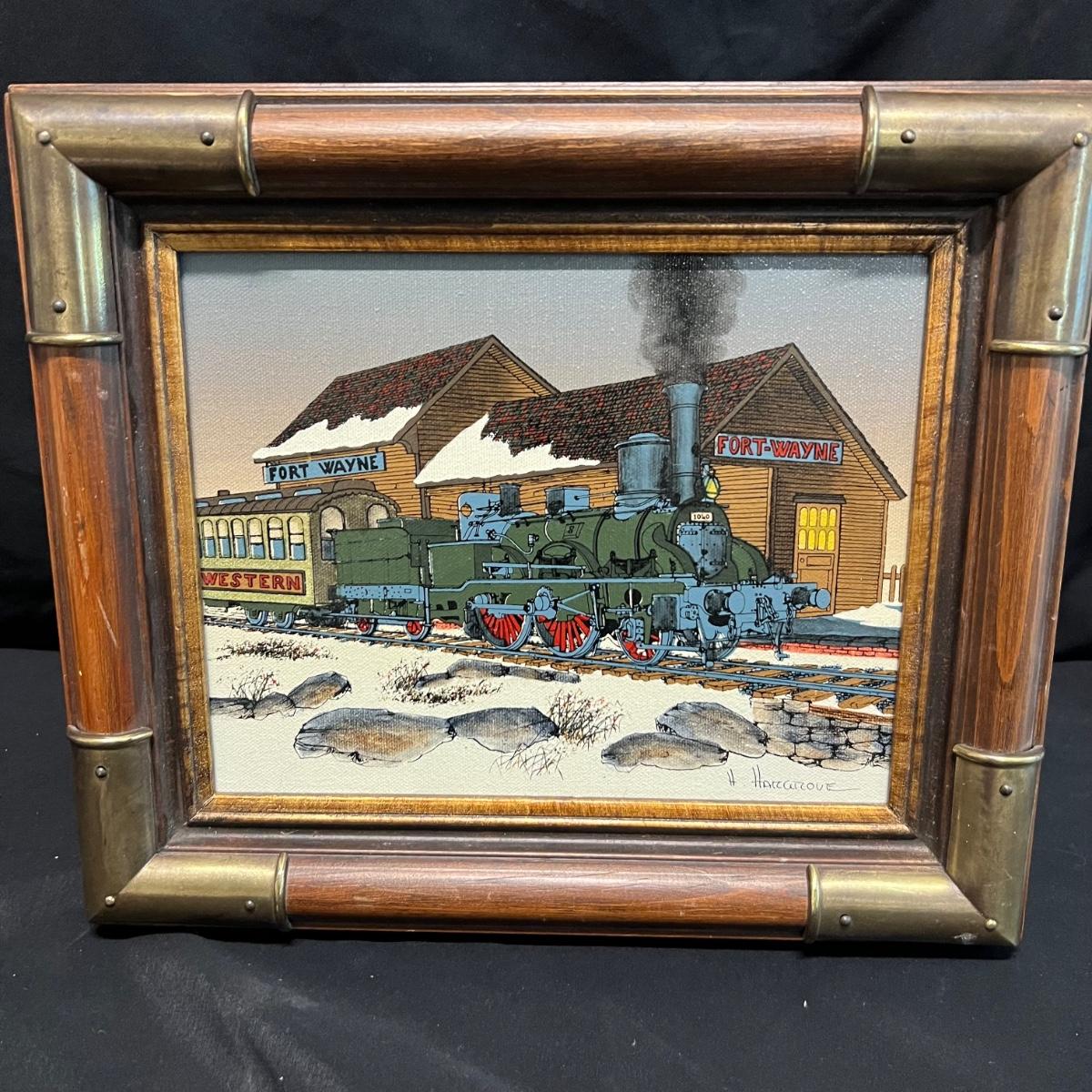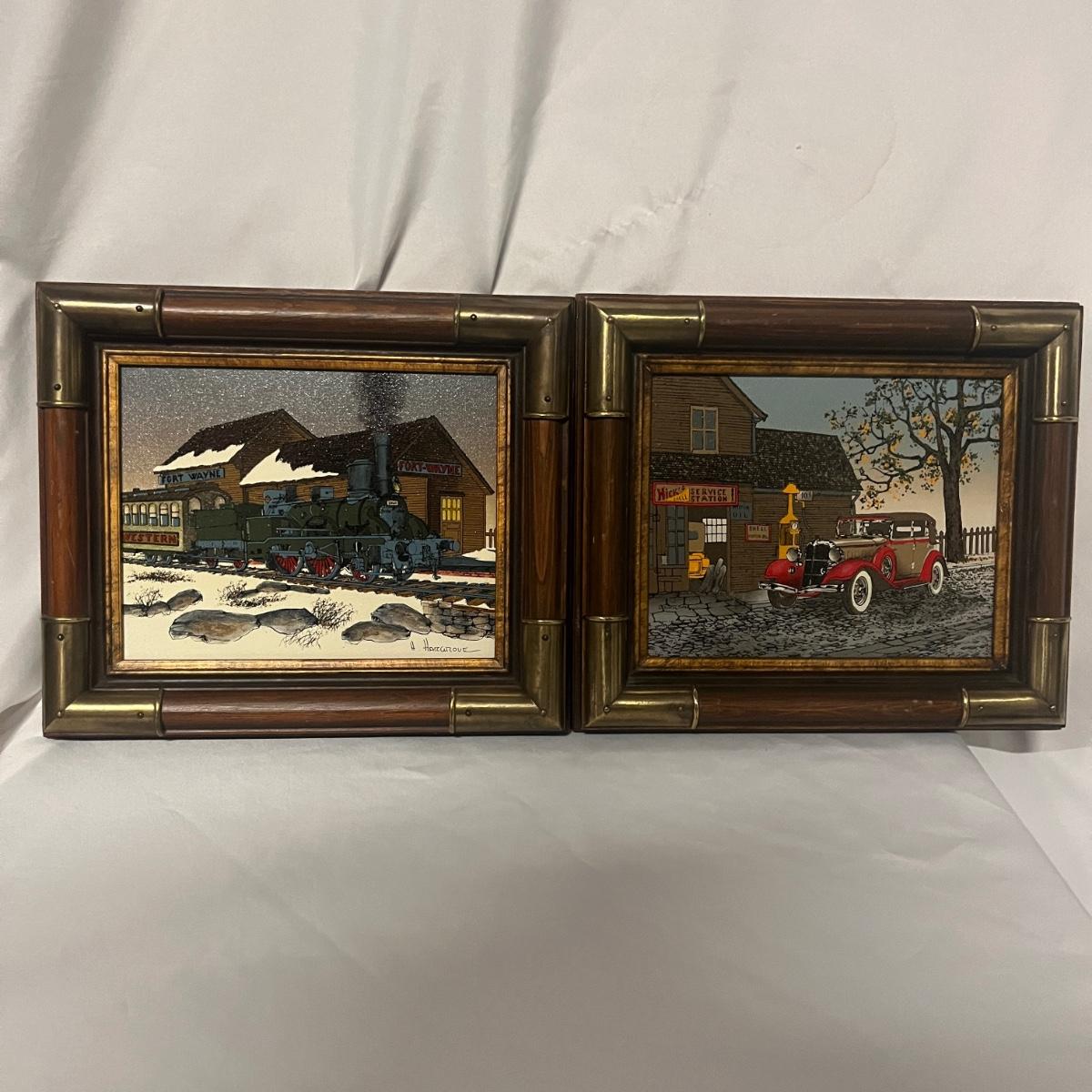 This wooden framed oil on canvas print has a signature that reads H. Hargrove. Also includes a wooden unsigned oil on canvas print. Both prints have the same frame which is a combination of wood and brass colored metal corners that measure 13.5” x 1.75” x 11.5”H.