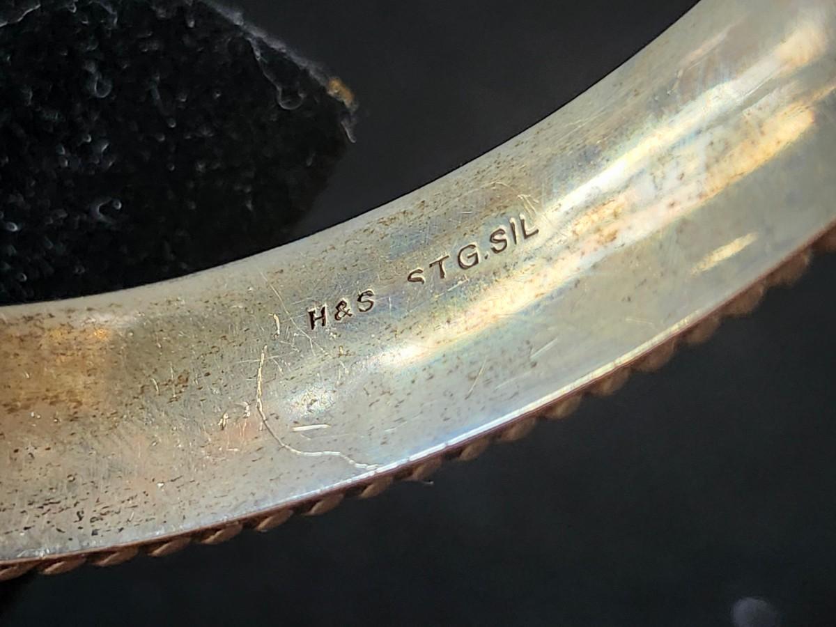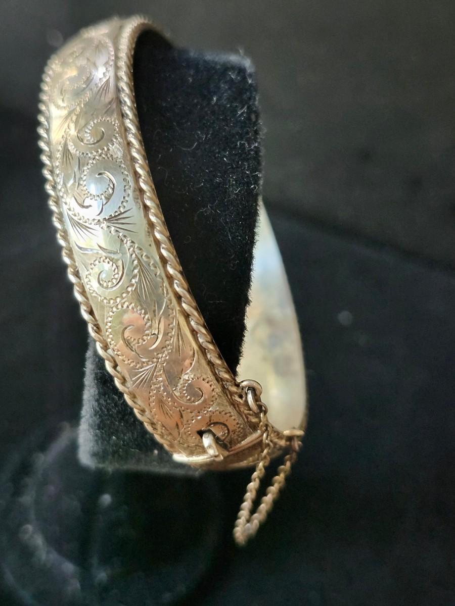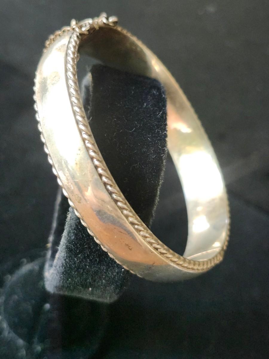 Ornate 925 hinged bangle, with rope border, Safety catch and chain.